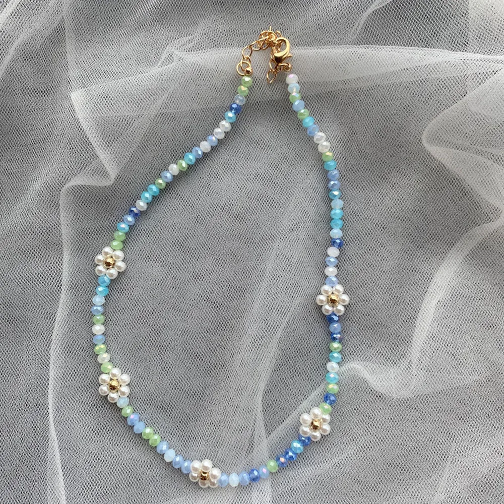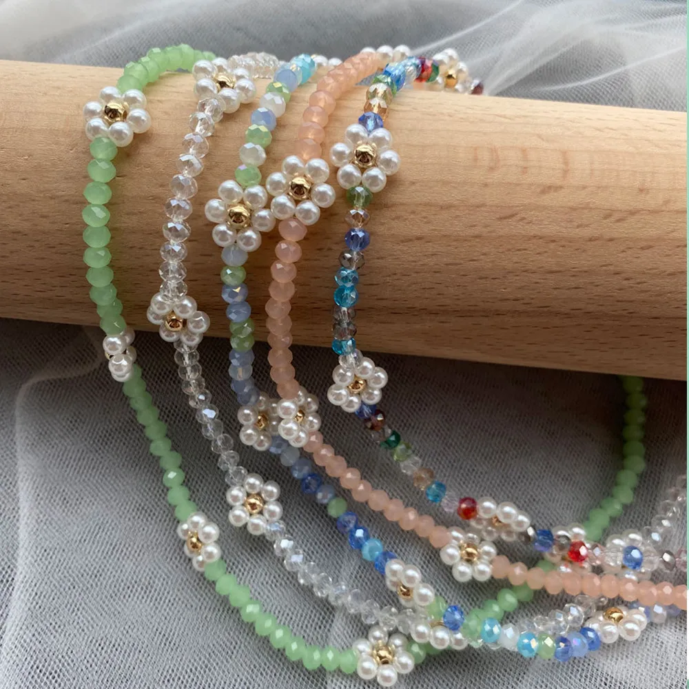 HangZhi 2021 Korea Colorful Flowers Crystal Pearl Beaded Trendy Necklace Clavicle Chain for Women Summer Party Jewelry