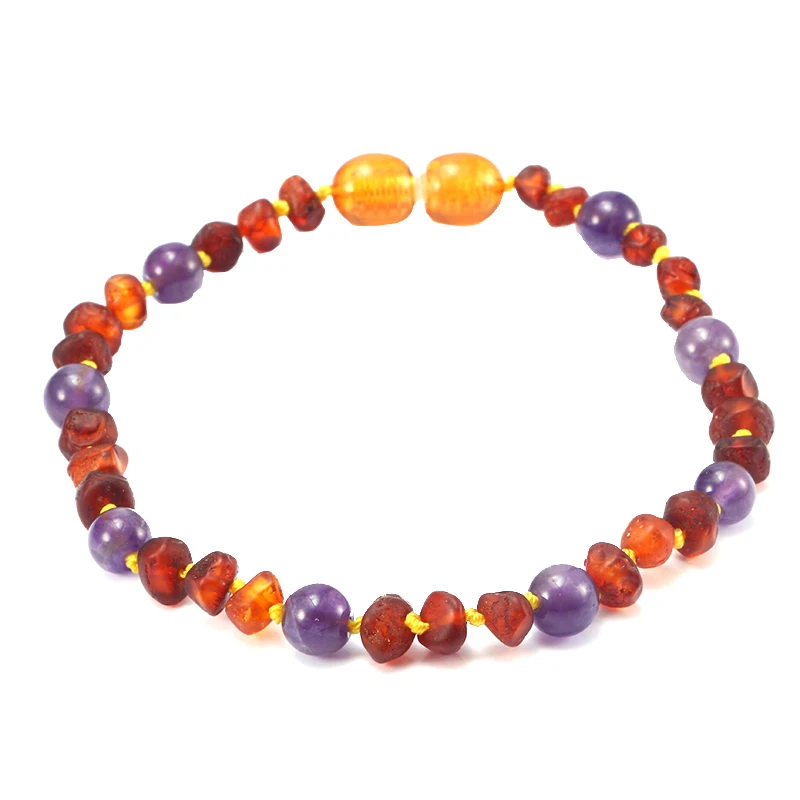 Unpolished Amber Baby Teething Bracelet / Necklace with Natural Amethyst Stone Irregular Amber Jewelry for Women Child