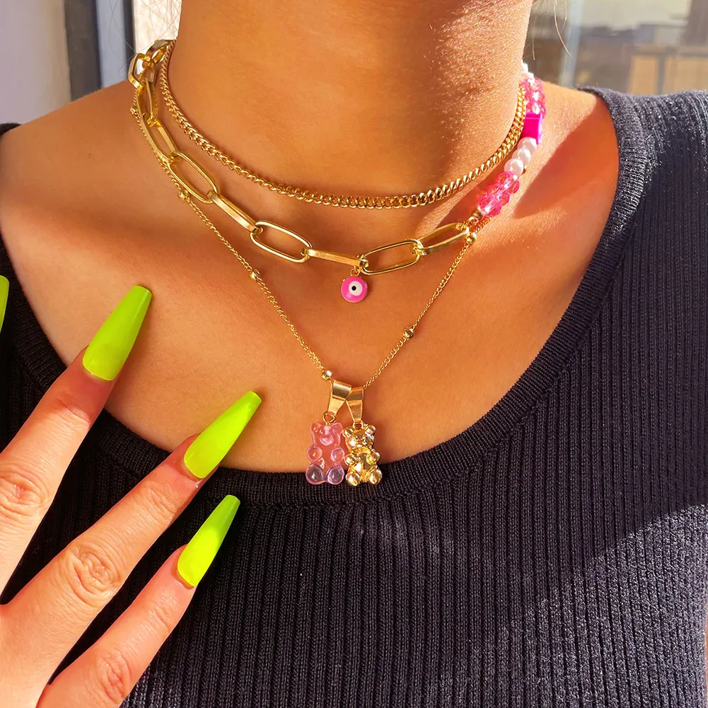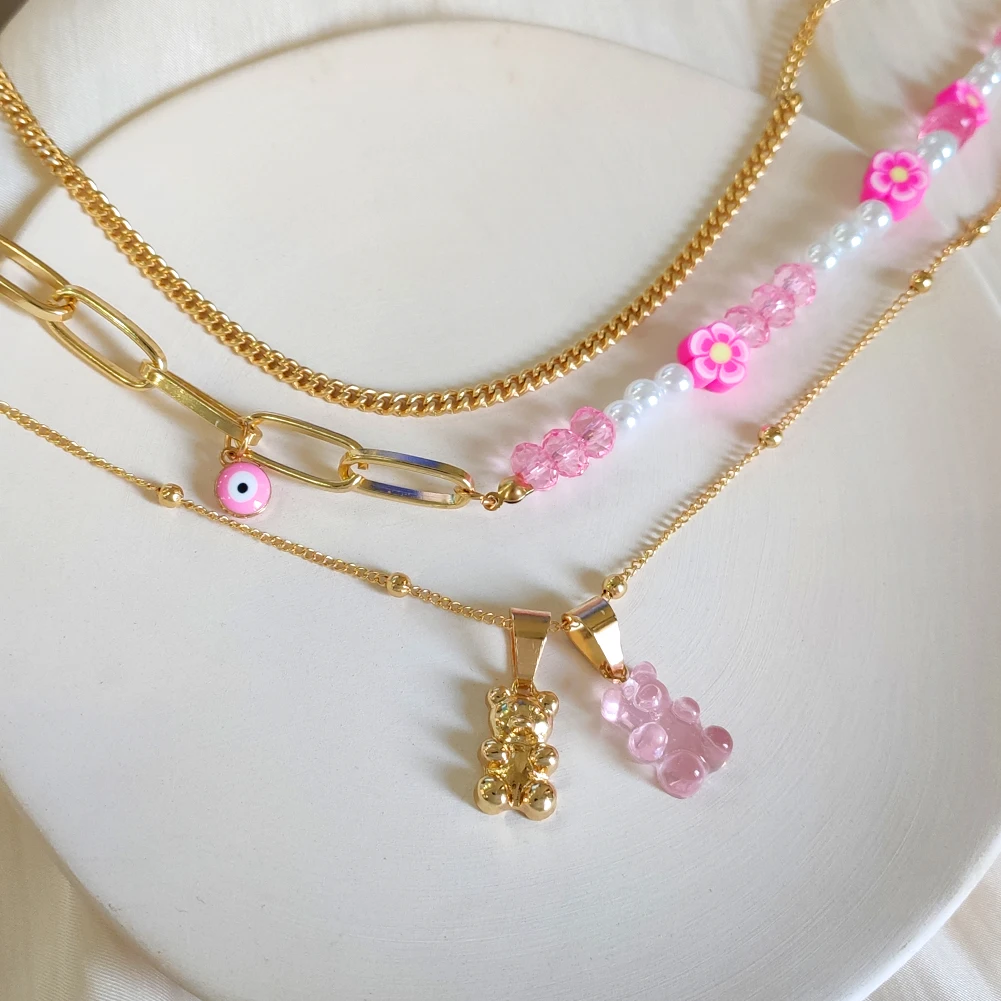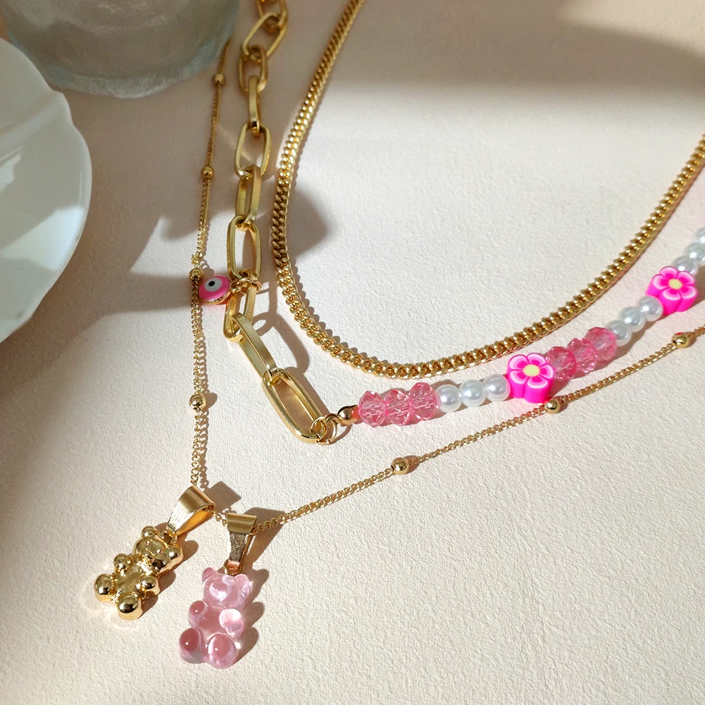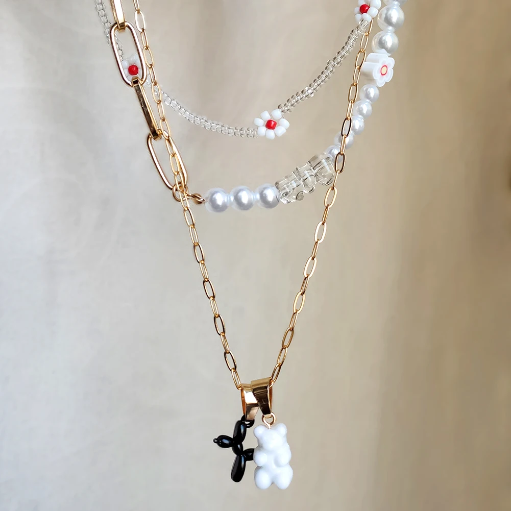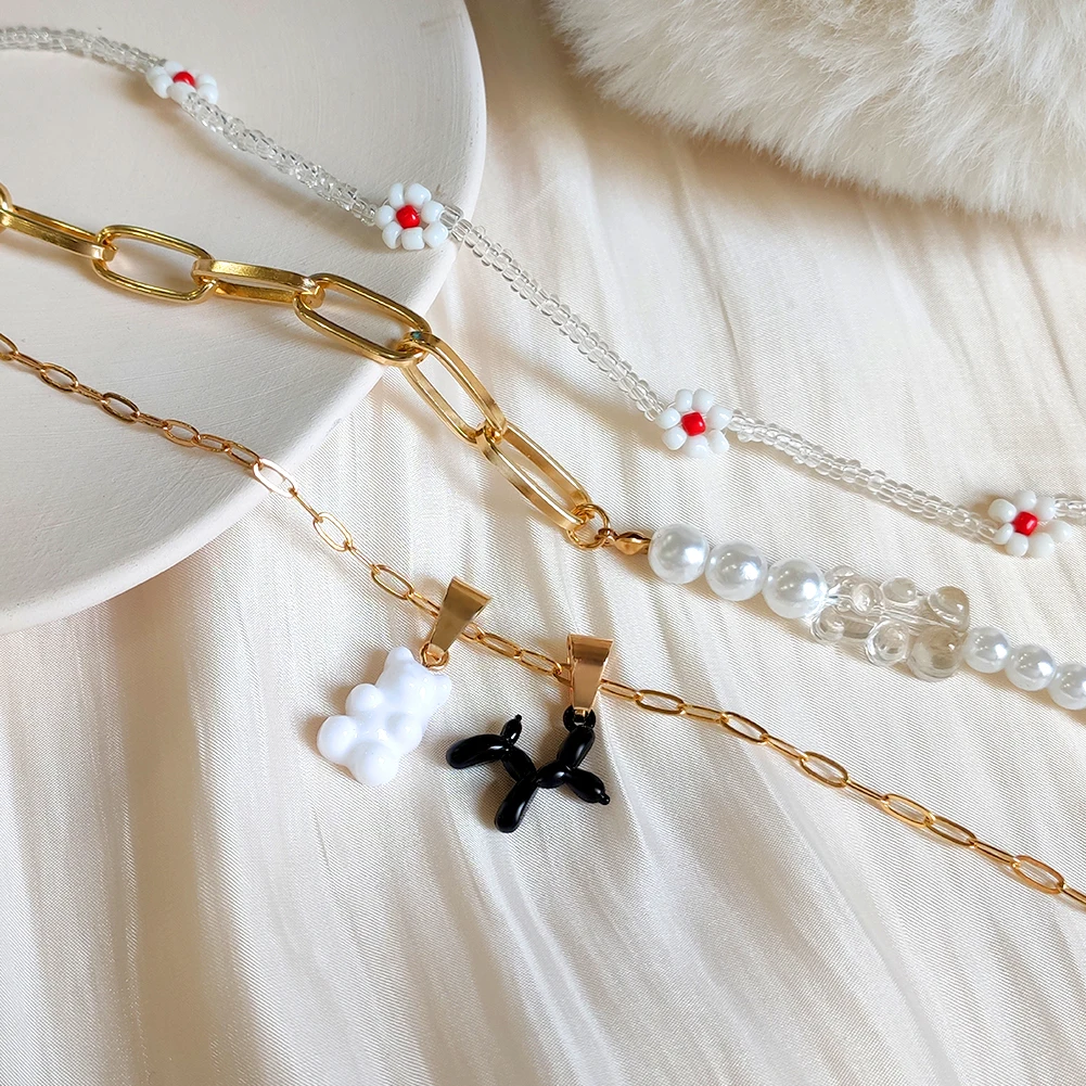 Harajuku Gummy Bear Balloon Dog Asymmetry Pearl Necklace For Women Handmade Flower Bead Choker Y2K Korean Multilayered Jewelry