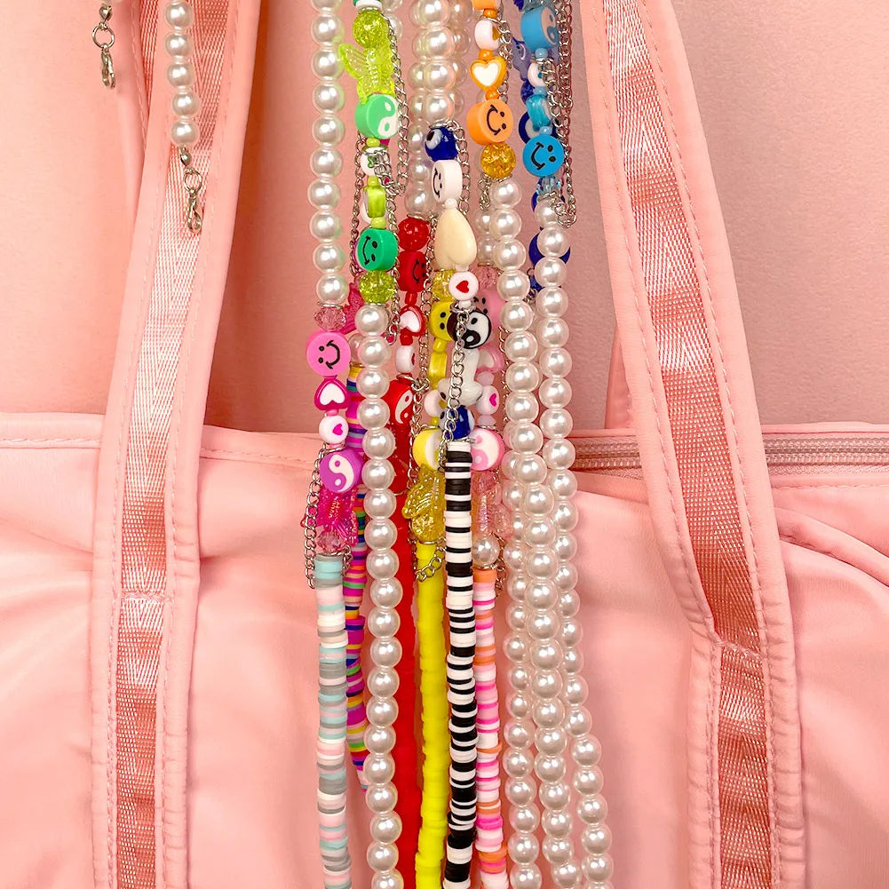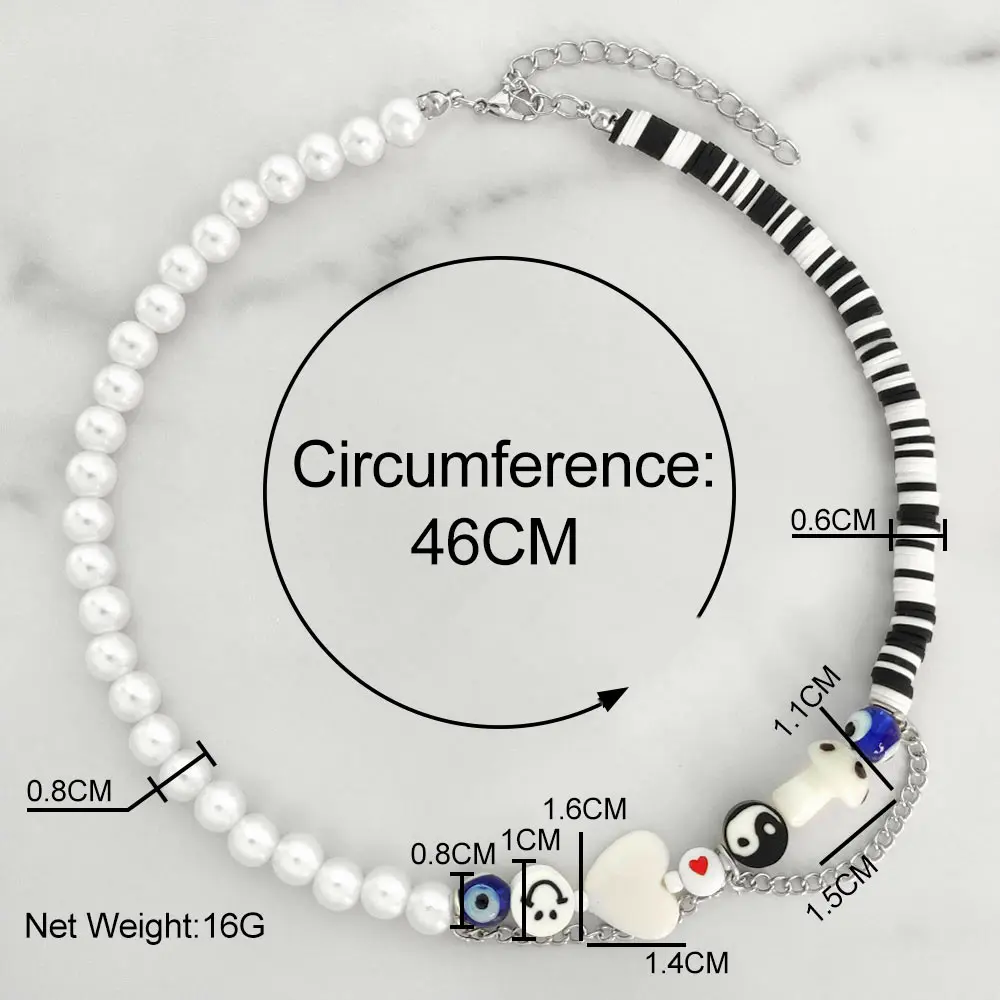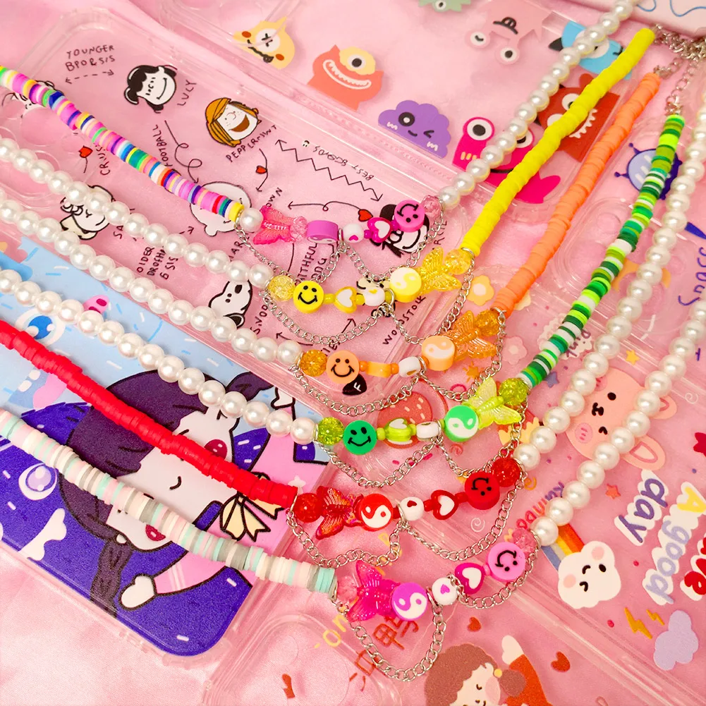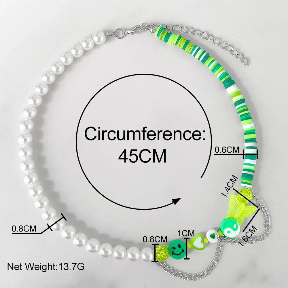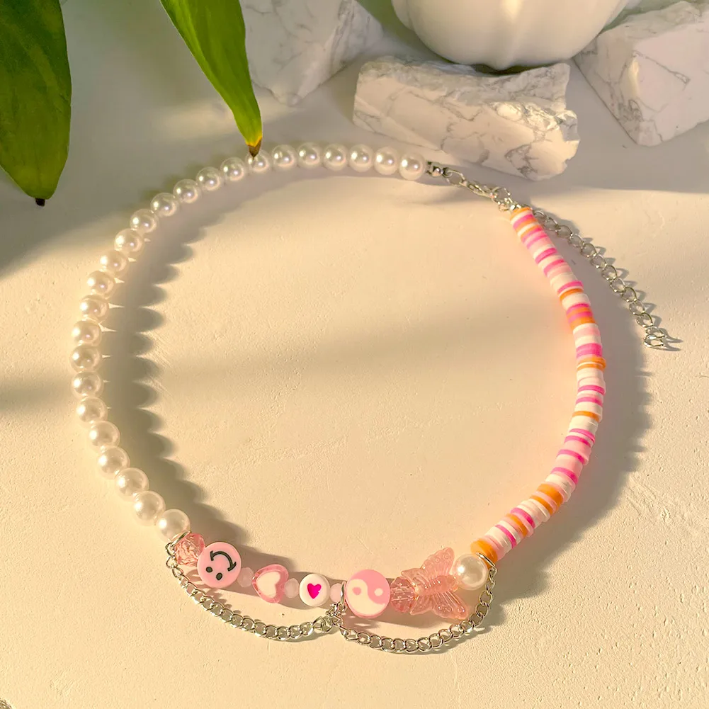 Harajuku Pink Butterfly Clay Beaded Necklace For Women Color Surfer Bead Asymmetry Pearl Chain Necklace Happy Face Y2K Jewelry