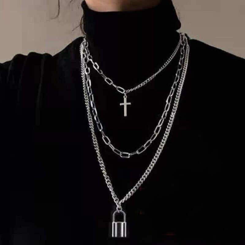 Harajuku Punk Cool Hiphop Double Layer Metal Round Circle Chain Link Cross Pendant Necklace for Women Men Party 26