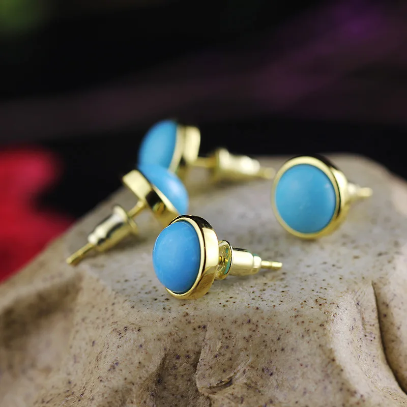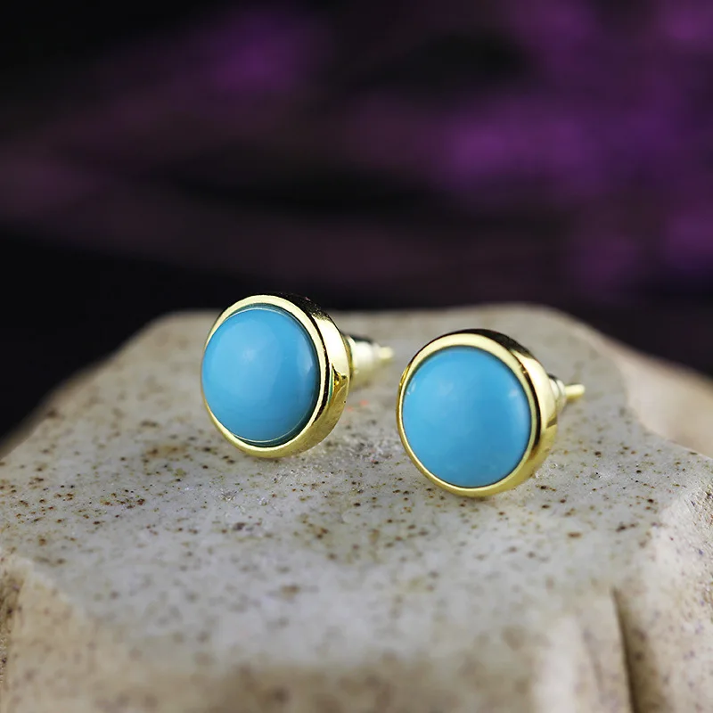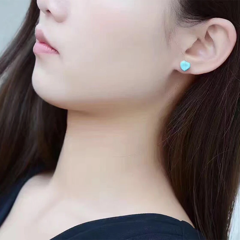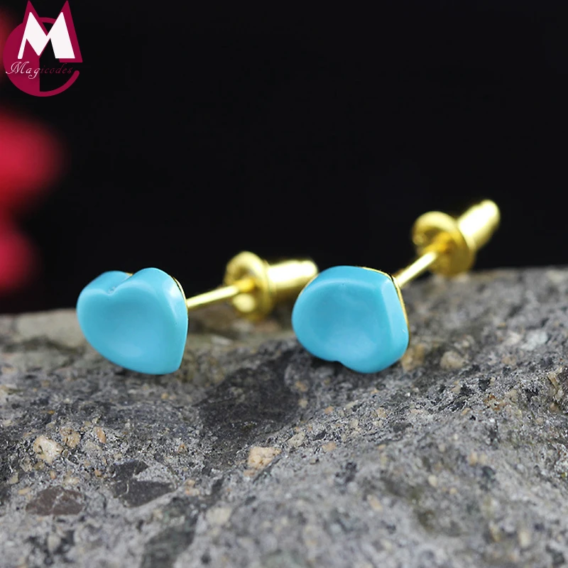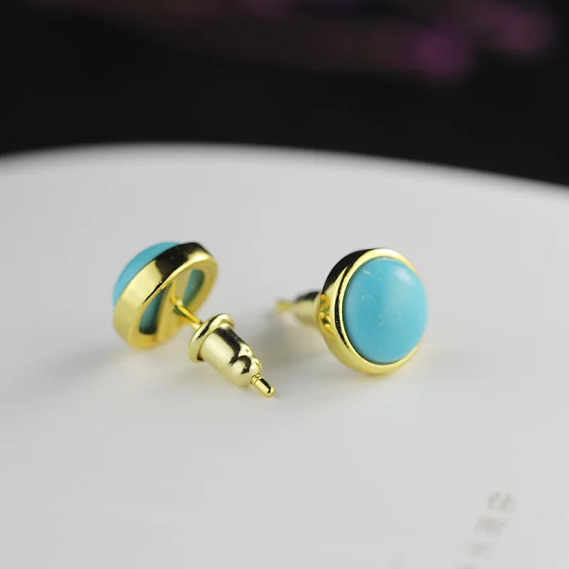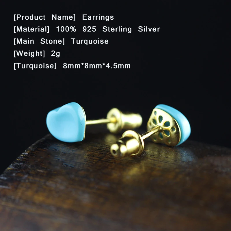 Heart Round Turquoise Design Genuine Sterling Silver 925 Jewelry Ear Piercing Accessories Gold Color Stud Earrings Female Girl