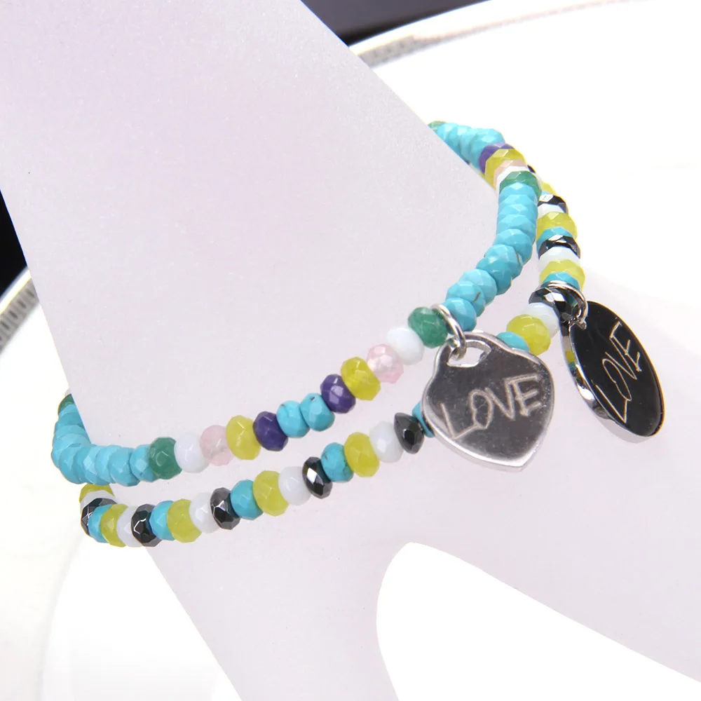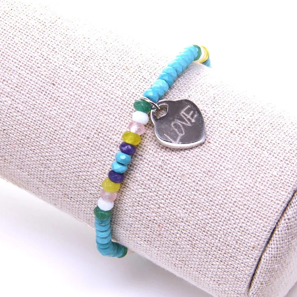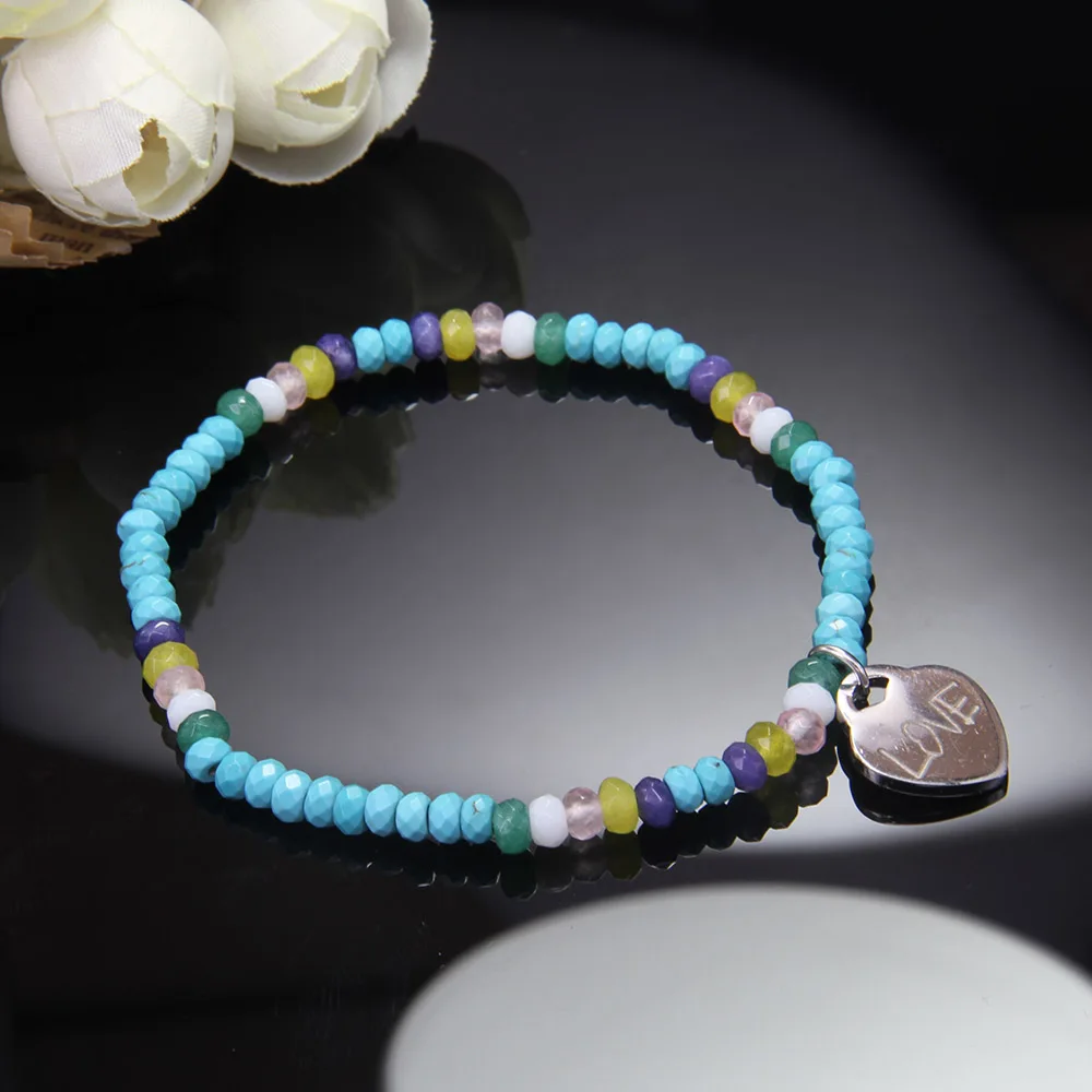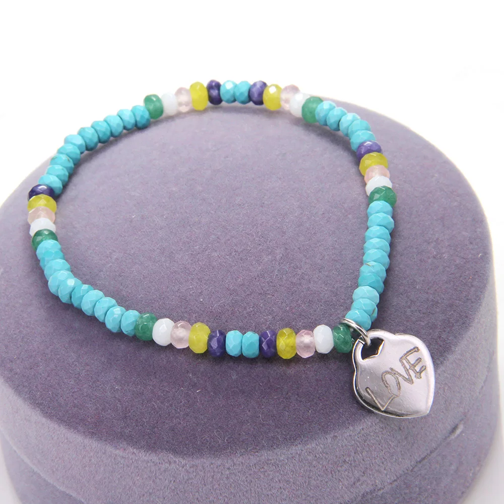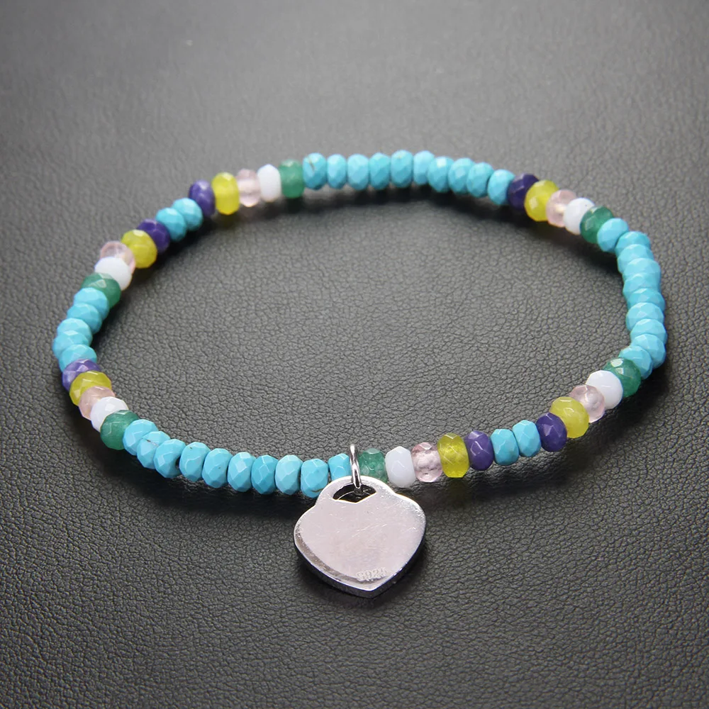 925 Multi Color Turquoise Bead Bracelet with 925 Sterling Silver Love Heart Charm for Women Fine Jewelry Gift TS-B091