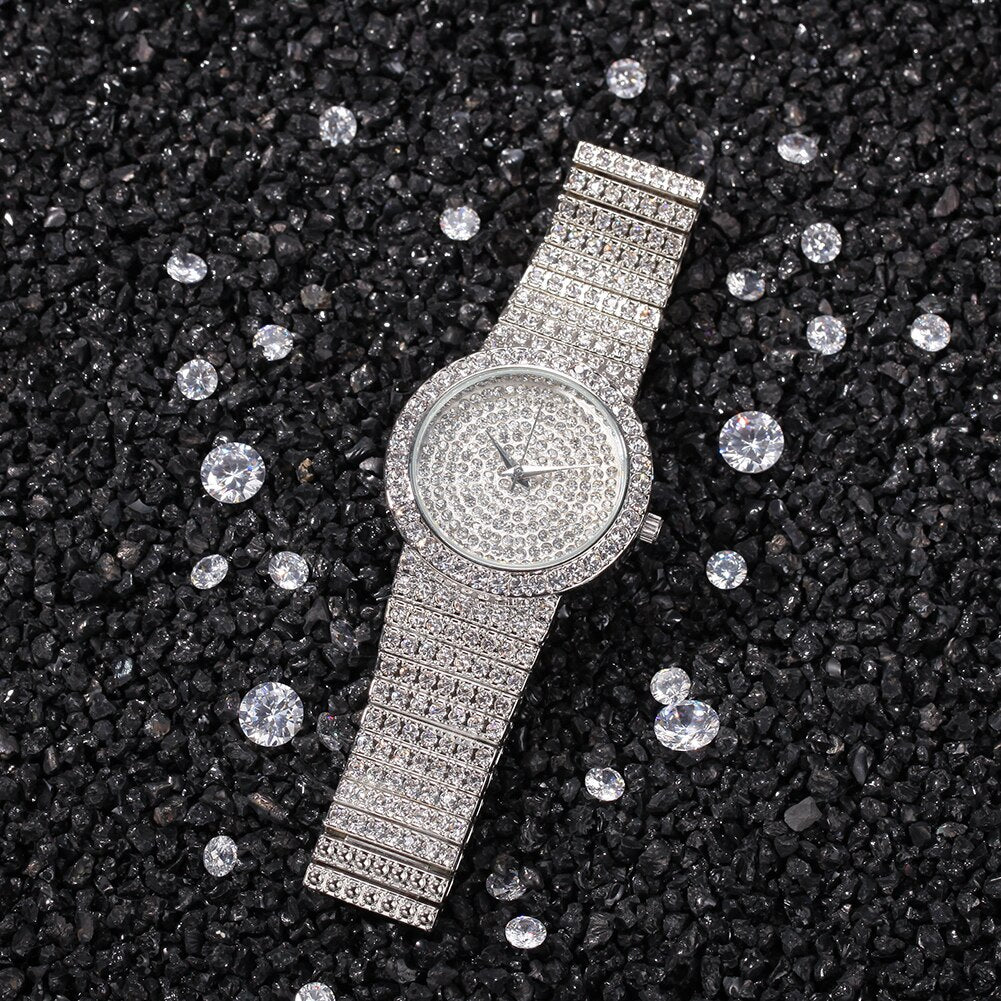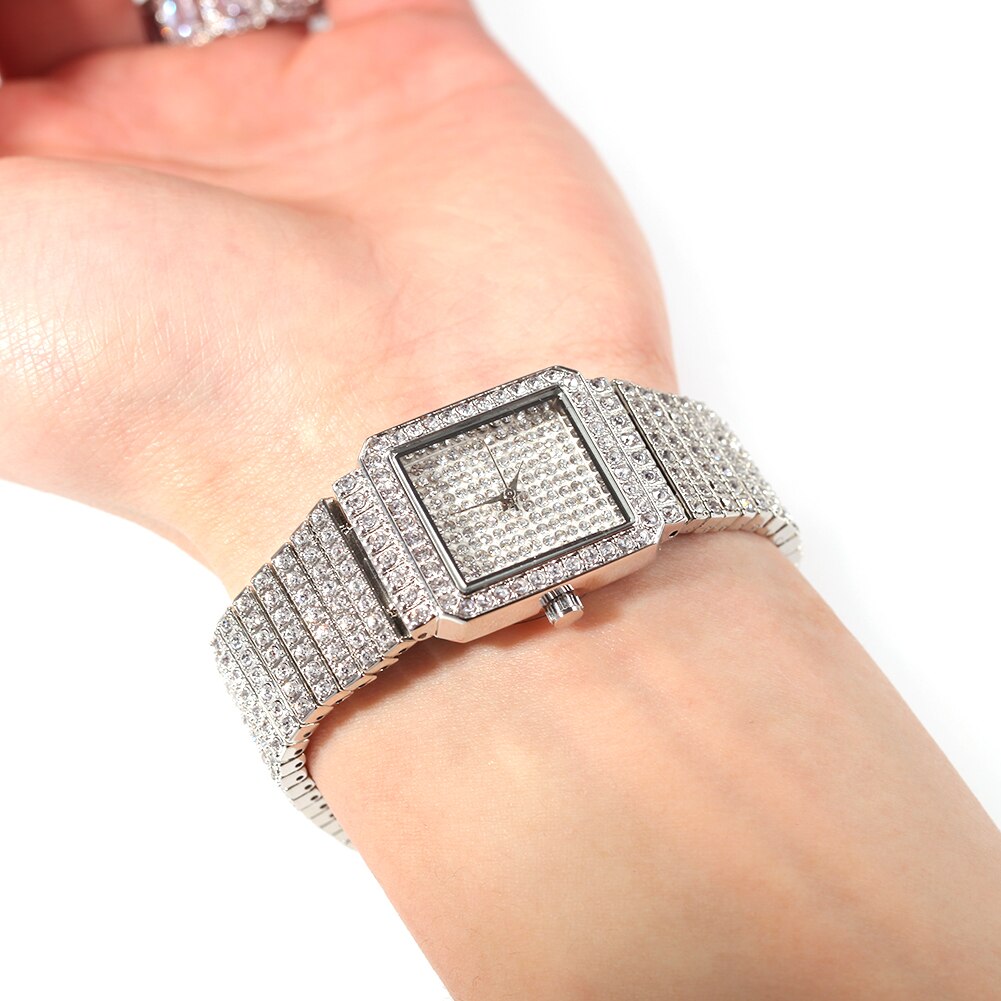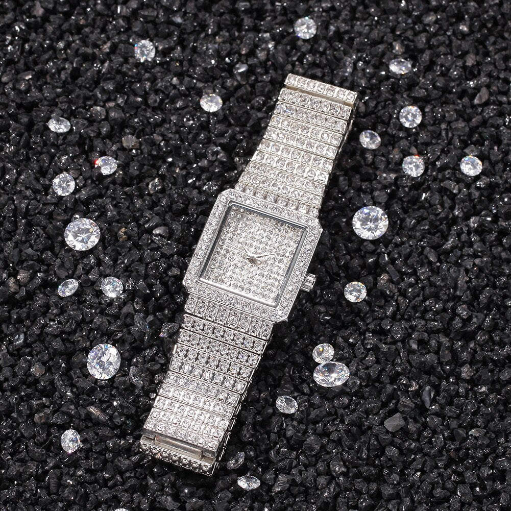 Hip Hop Full Iced Out Women Watch Stainless Steel Mechanical Rhinestones Quartz Square Wristwatches Business Watch