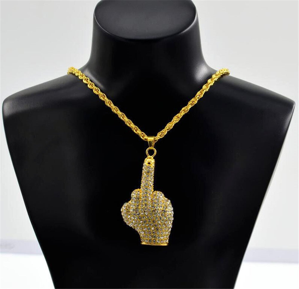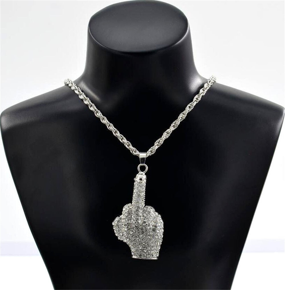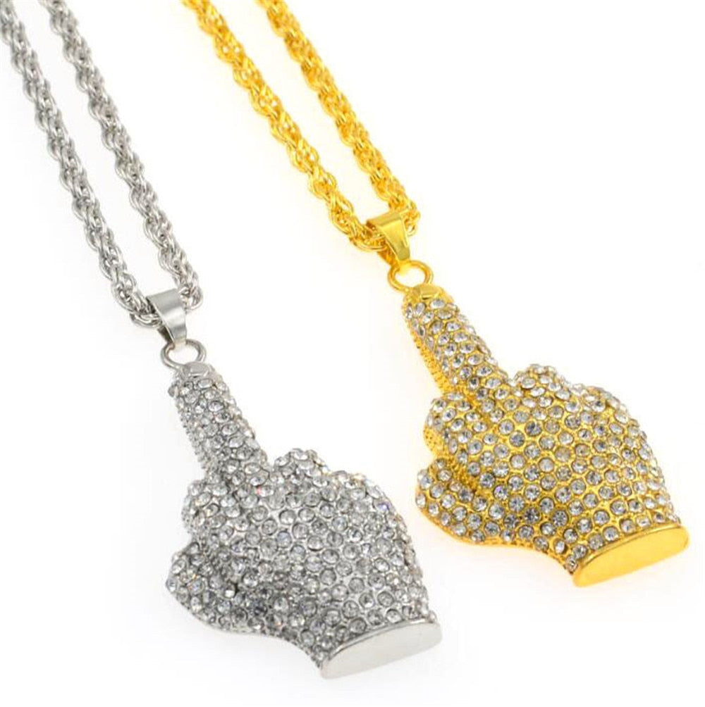 Hip Hop Iced Out Big Hands Pendants Necklace Full Rhinstone Crystal Zircon Rapper Middle Finger Up Hand Shape Jewelry For Men
