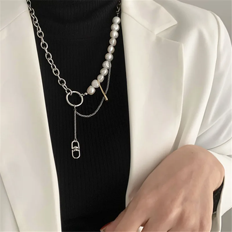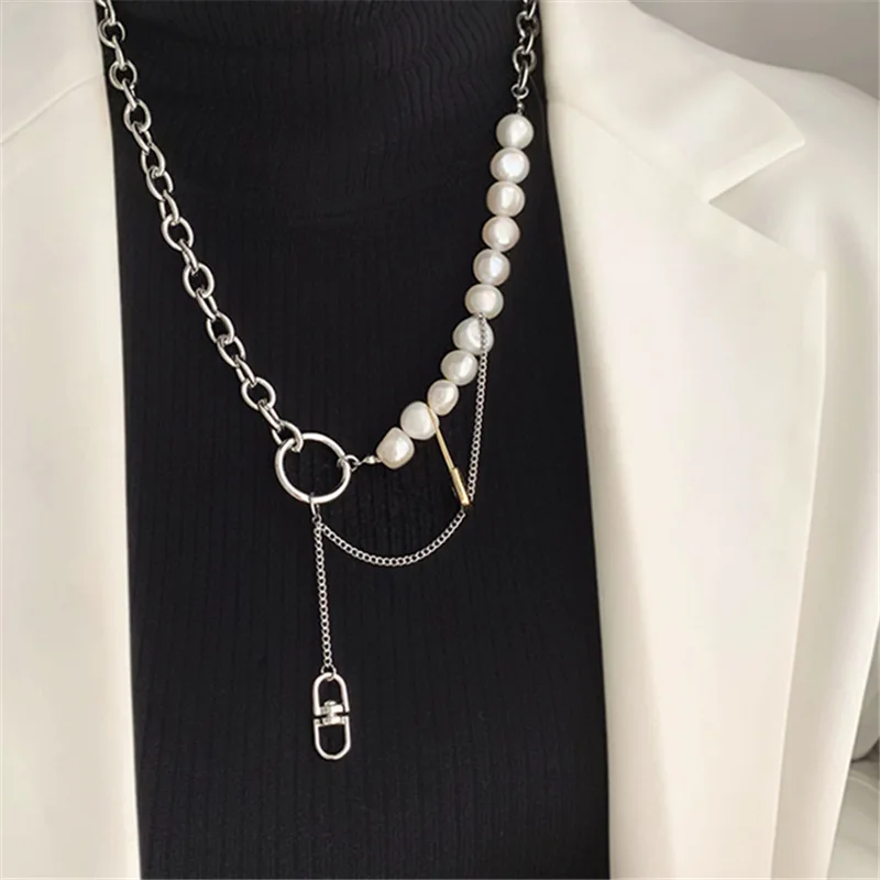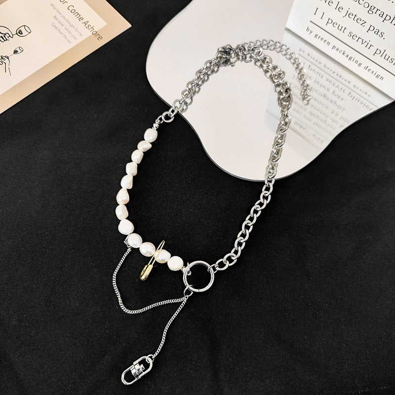 Hip Hop Punk Splice Chain Choker For Women Freshwater Pearl Pin Tasselled Clavicle Chain Street Snap Necklace Jewelry