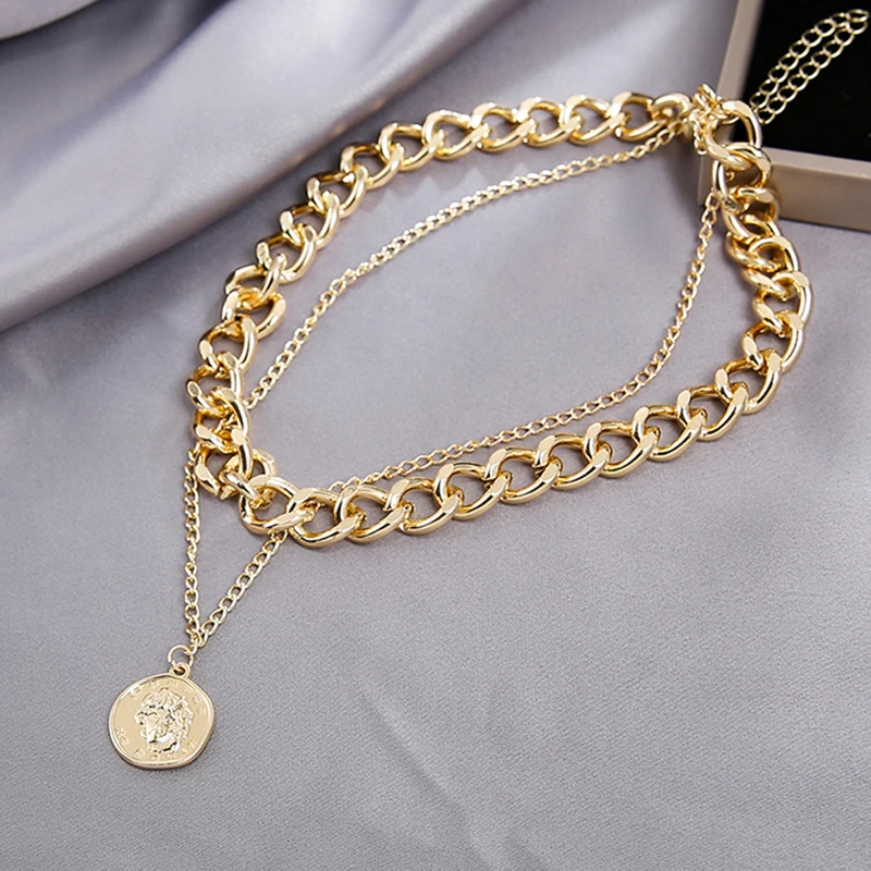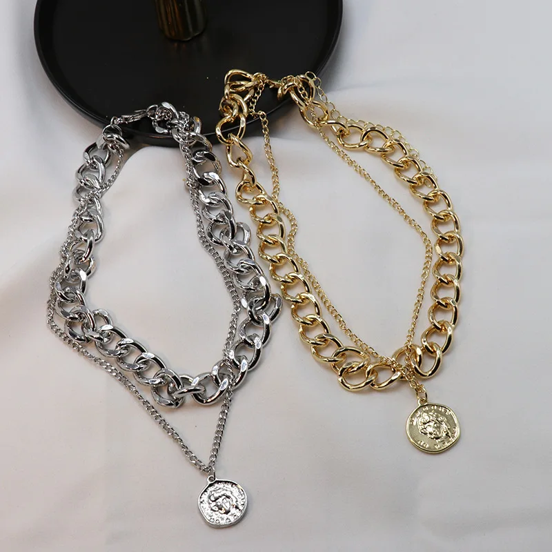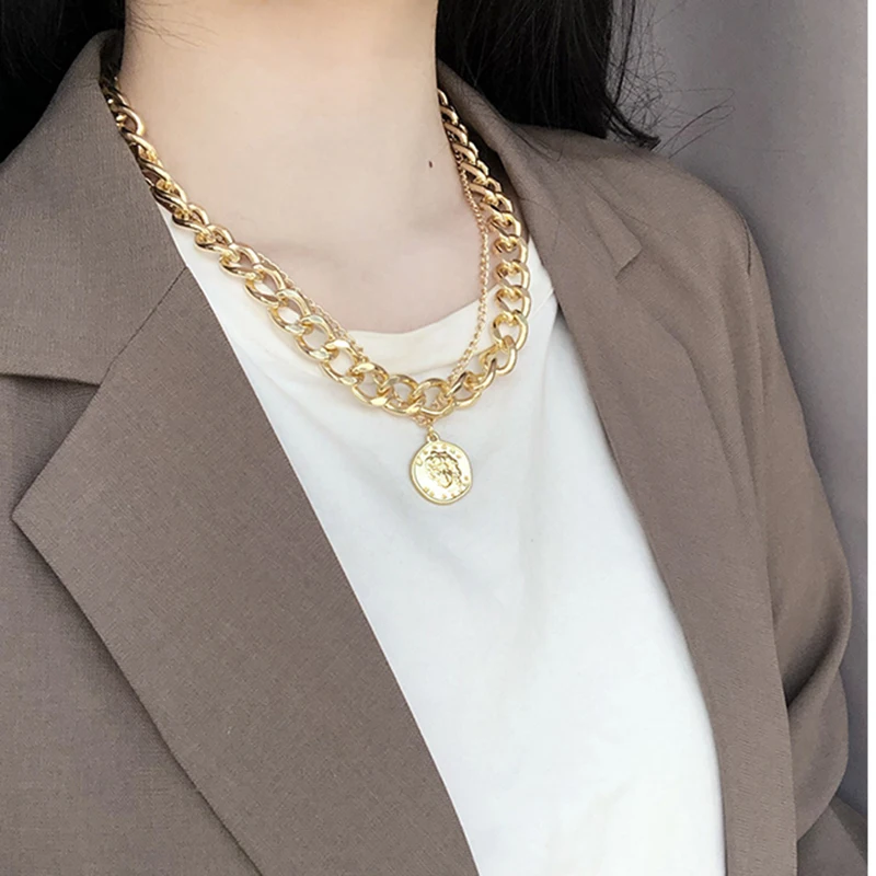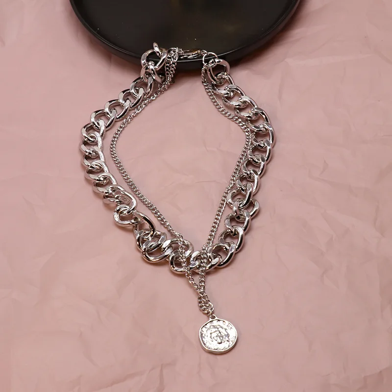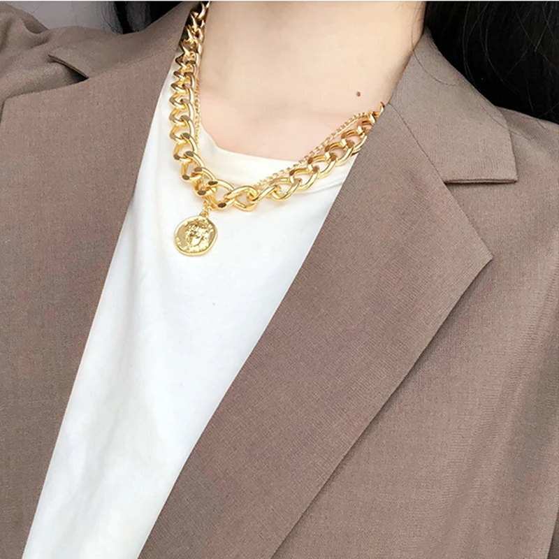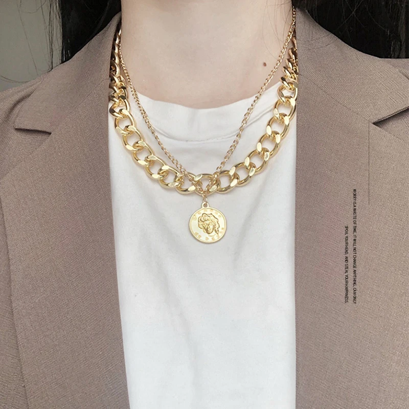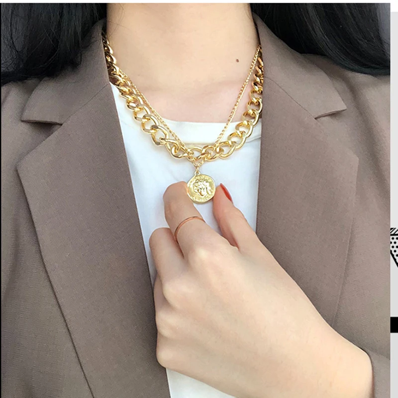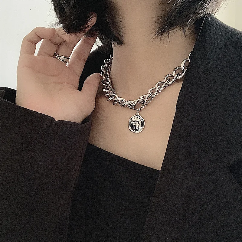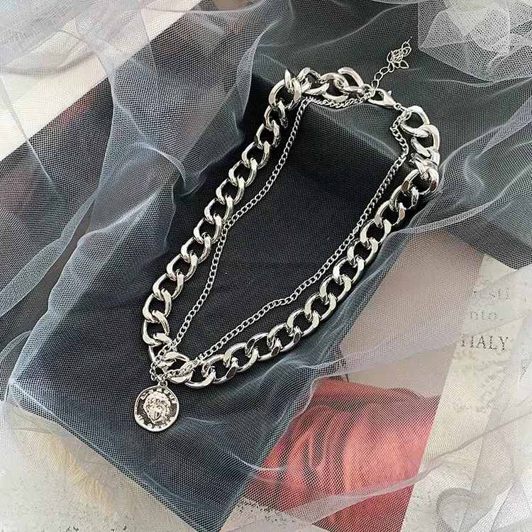 Hiphop Necklace Multi Chains Chokers Necklaces for Women Punk Jewelry Vintage Metal Head Coin Pendant Necklace Chunky