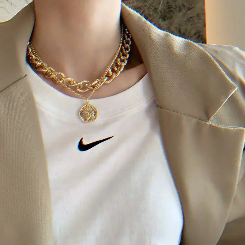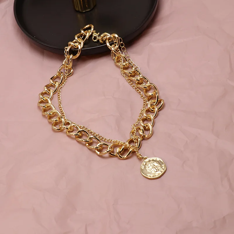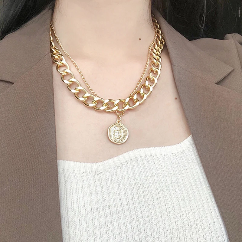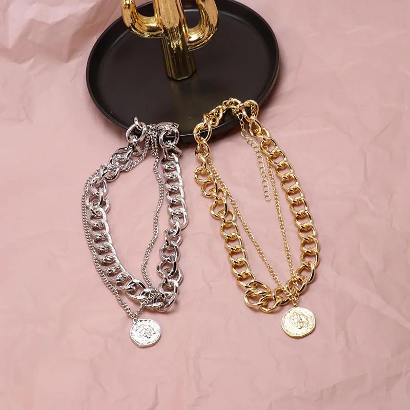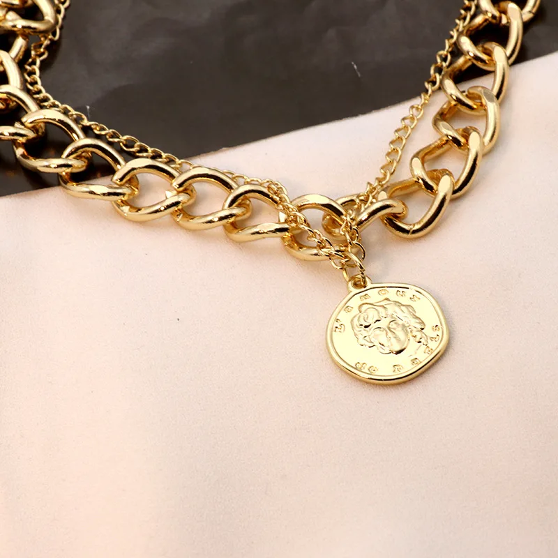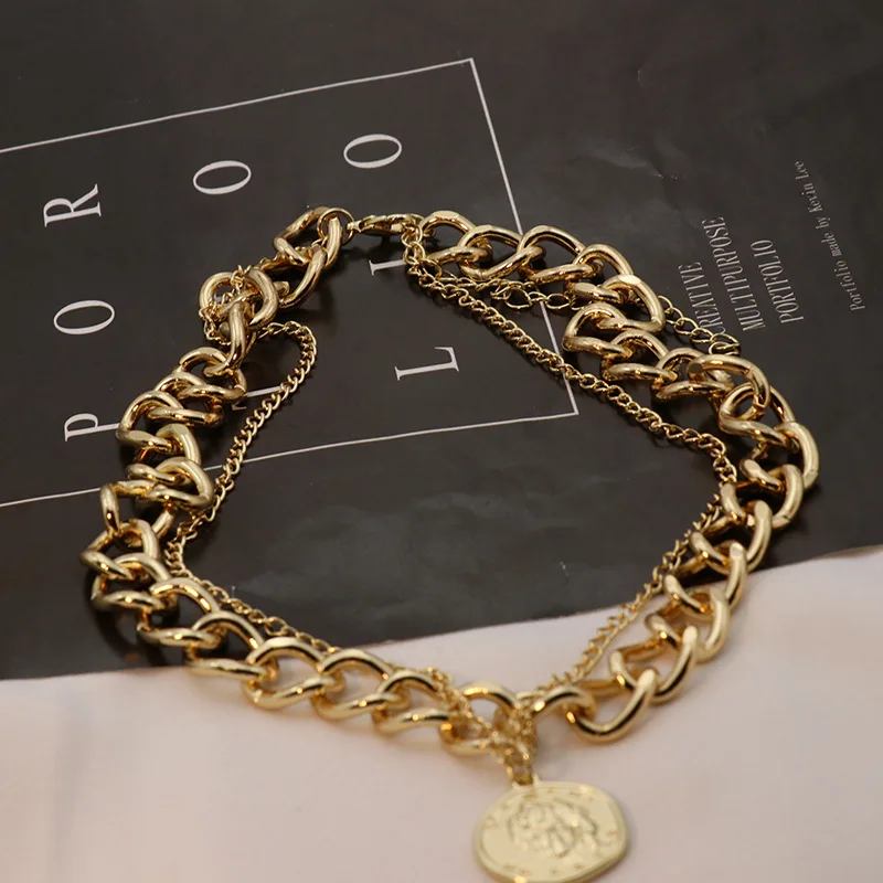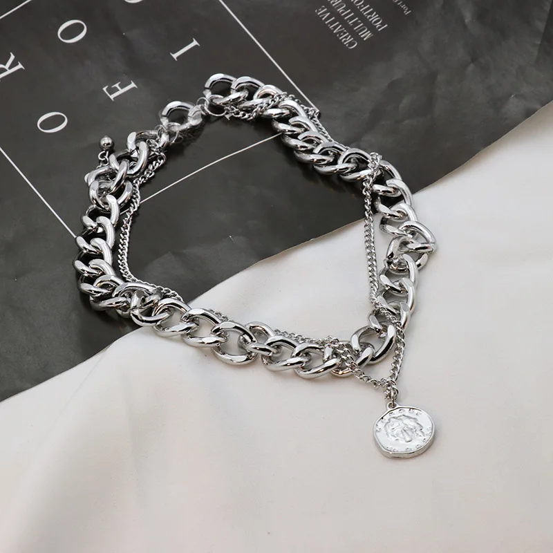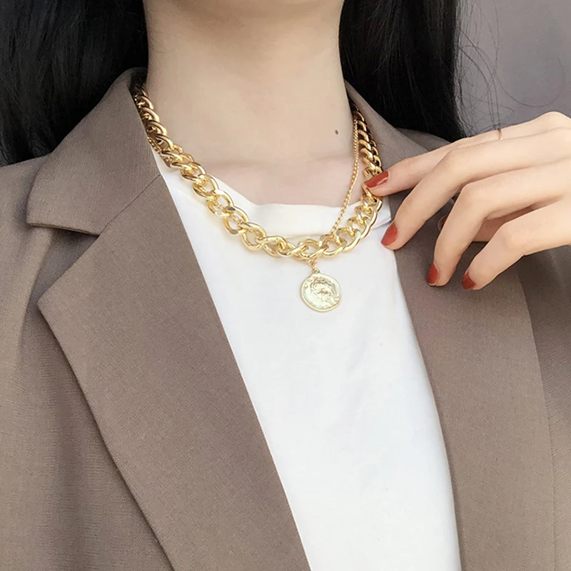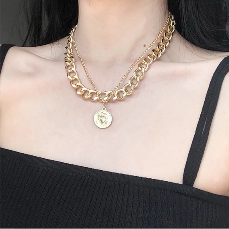 Hiphop Necklace Multi Chains Chokers Necklaces for Women Punk Jewelry Vintage Metal Head Coin Pendant Necklace Chunky