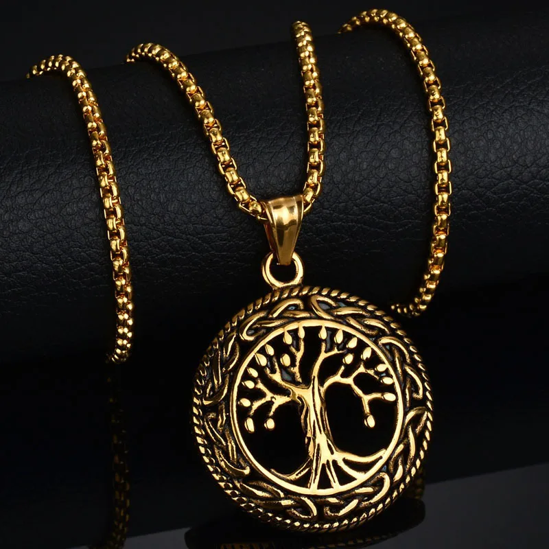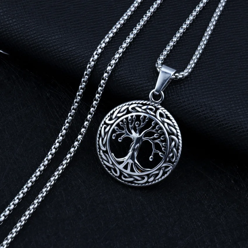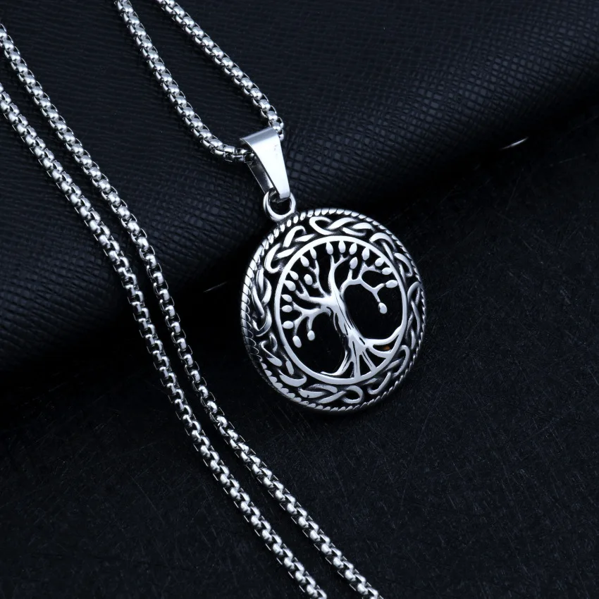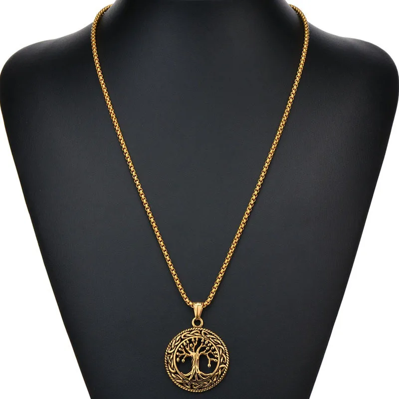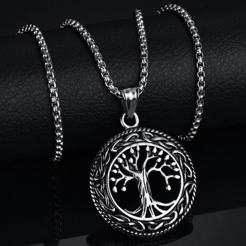 HNSP Viking Tree Life Round Pendant Stainless Steel Chain Necklace For Men Male Neck Punk Gothic Jewelry