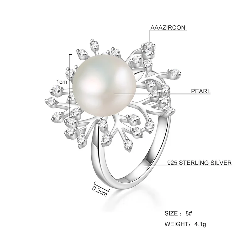 New Design Snowflake Genuine Natural White Pearl 100% 925 Sterling Silver Unique Rings Wedding Jewelry Gift