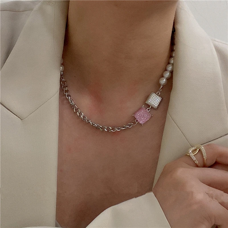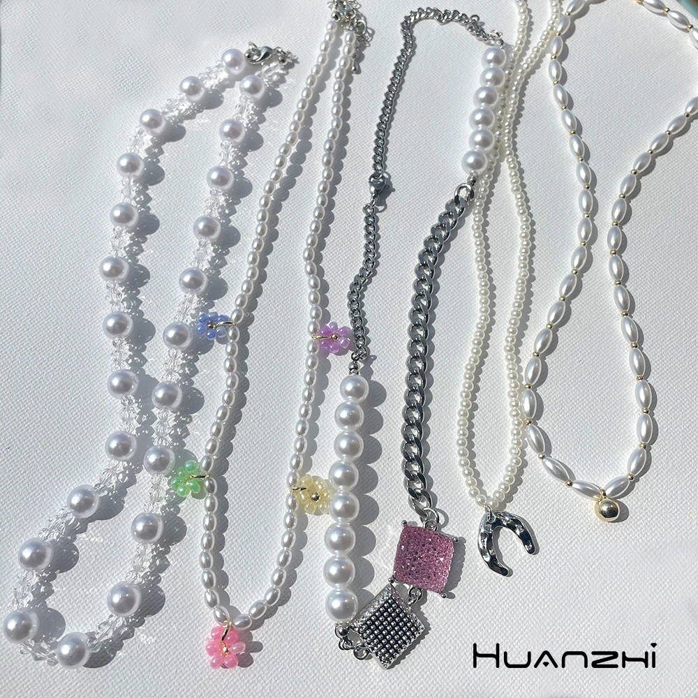 HUANZHI 2022 Vintage Colourful Pearl Choker Resin Flower Transparent Beads Pink Crystal Necklace for Women Wedding Jewelry
