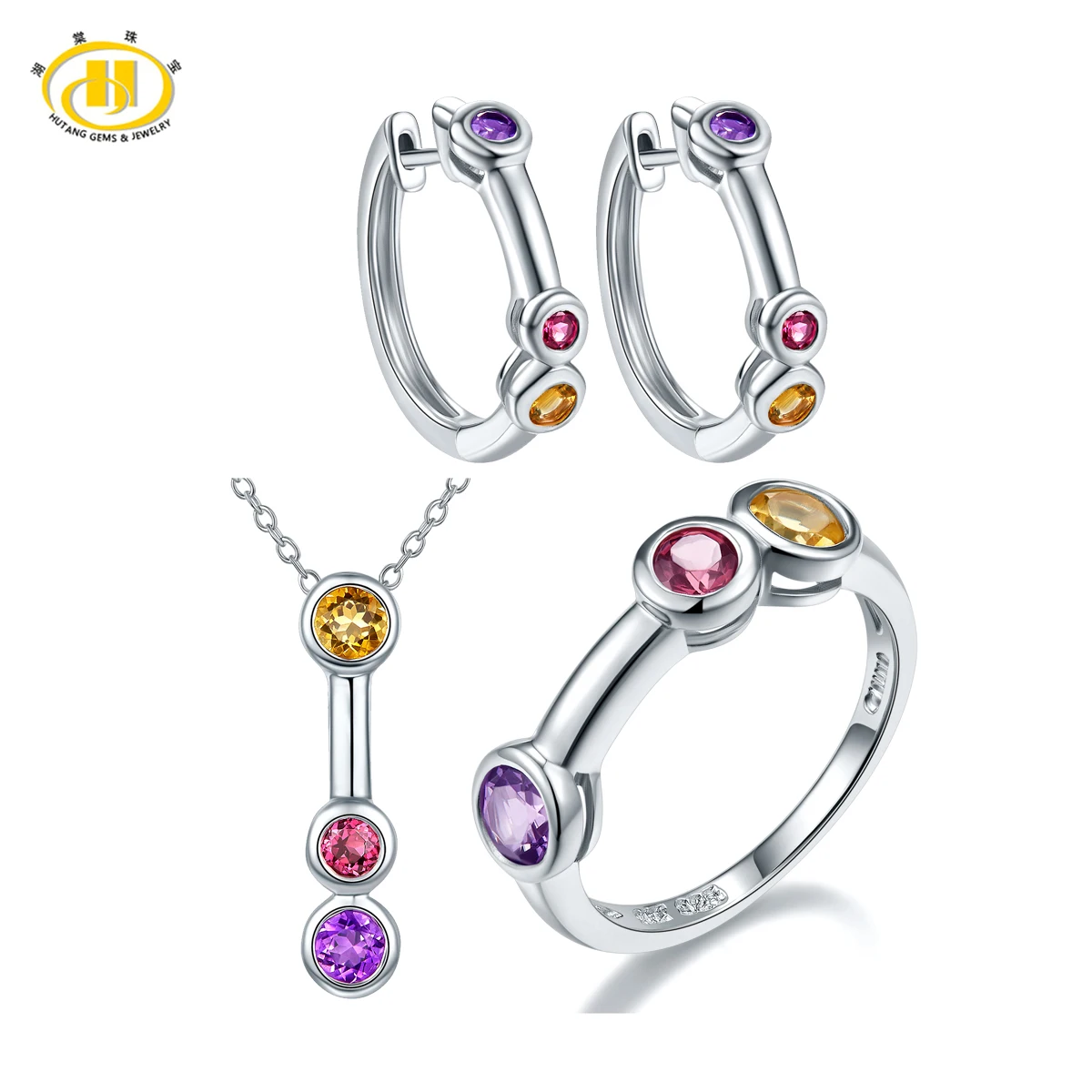 Hutang 3-stone Classic Multi-color Gemstone Jewelry Sets for Women Solid 925 Sterling Silver Ring Pendant Earrings Stylish Style