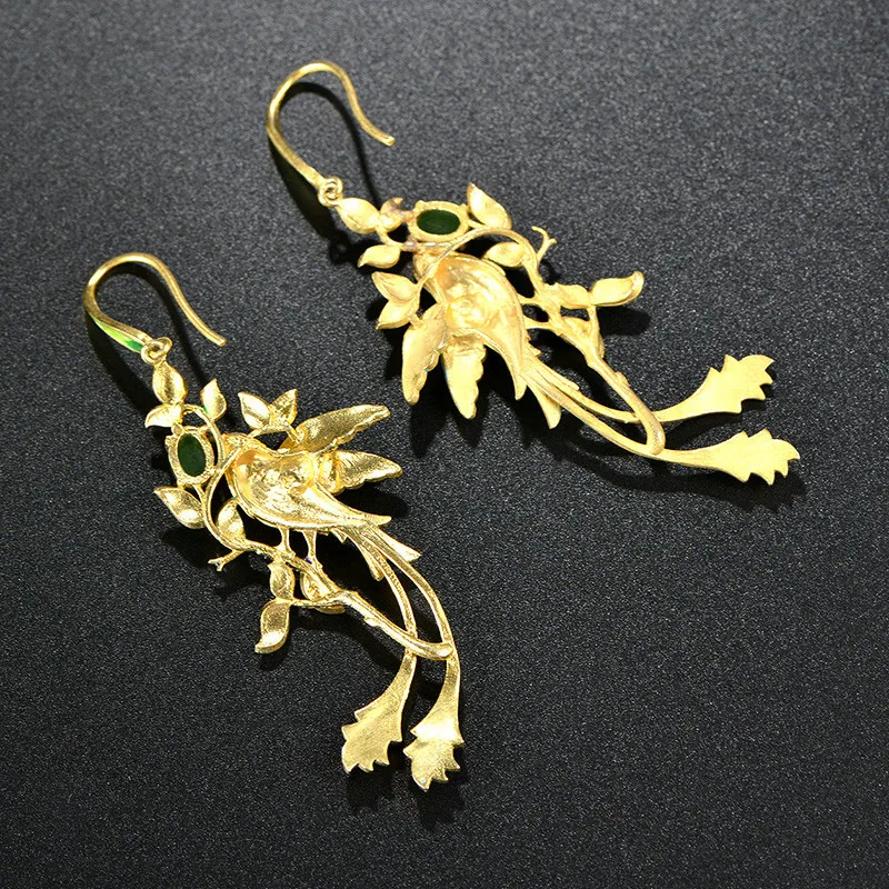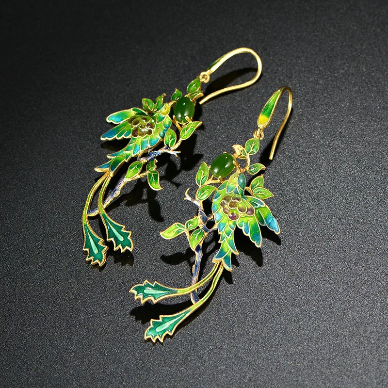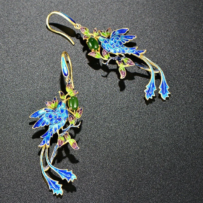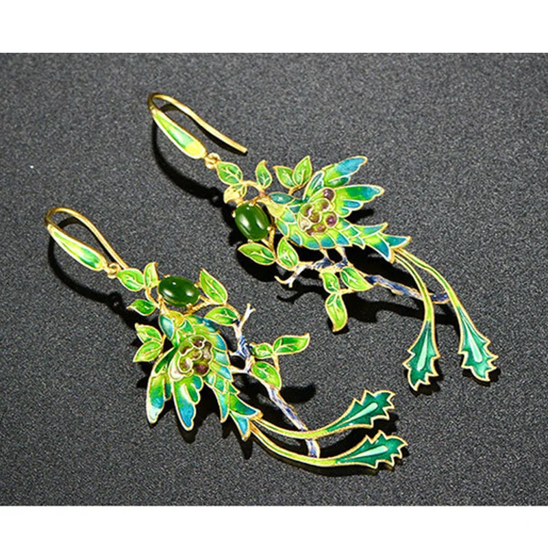 Luxurious 925 Sterling Silver Big Drop Earrings Multi Green Blue Phoenix Cloisonne with Jade Ear Hook for Women Jewelry