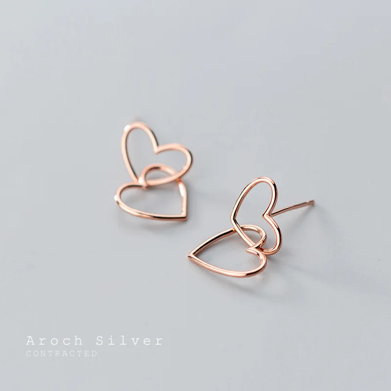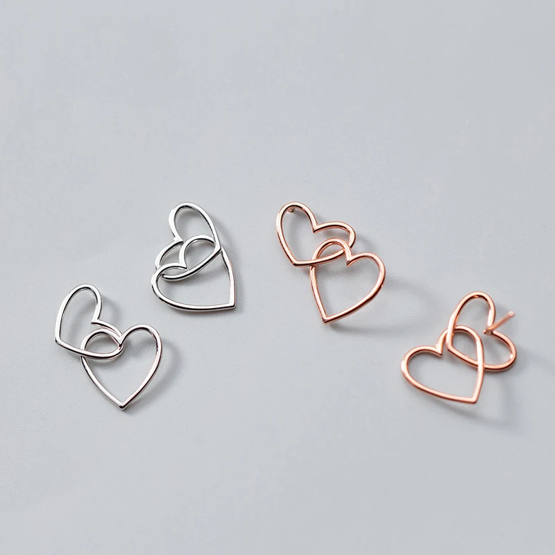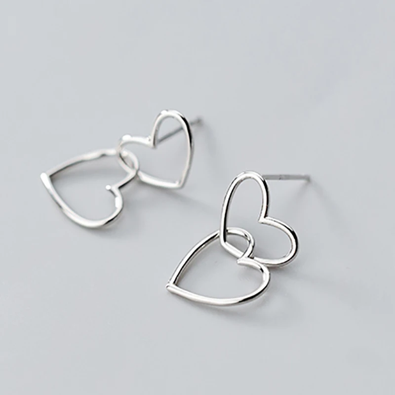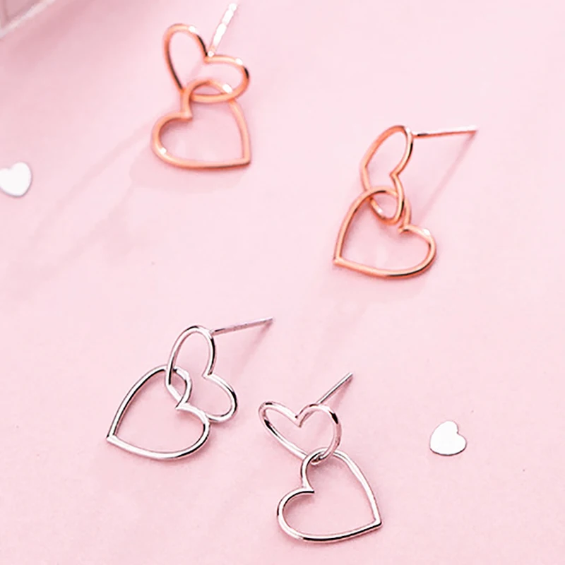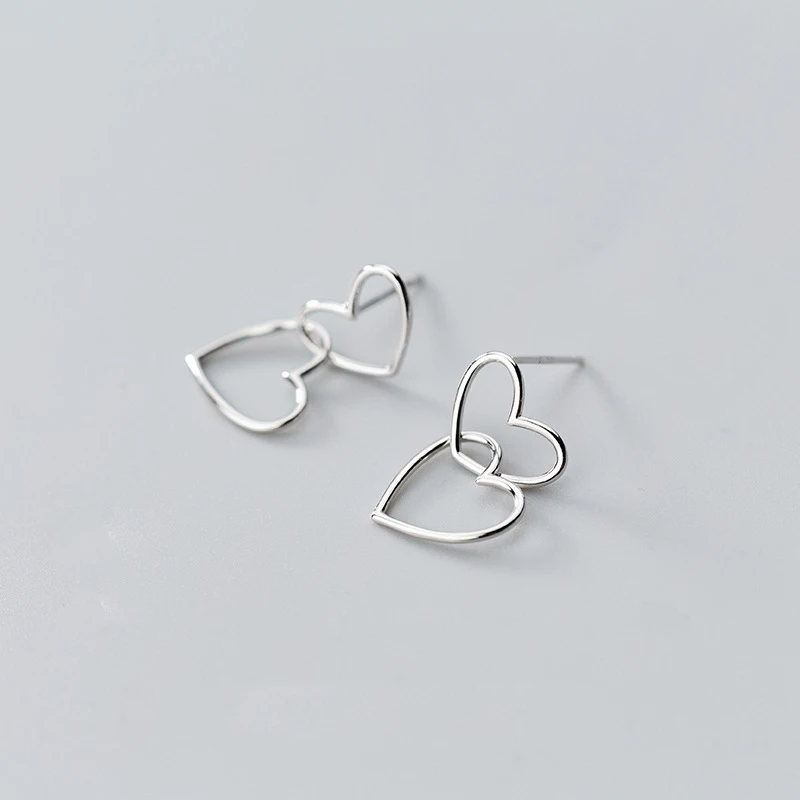 New 100% 925 Sterling Silver Double Hollow Hearts Stud Earrings for Women Small Bijoux Fine Jewelry Cute Gorl Brincos