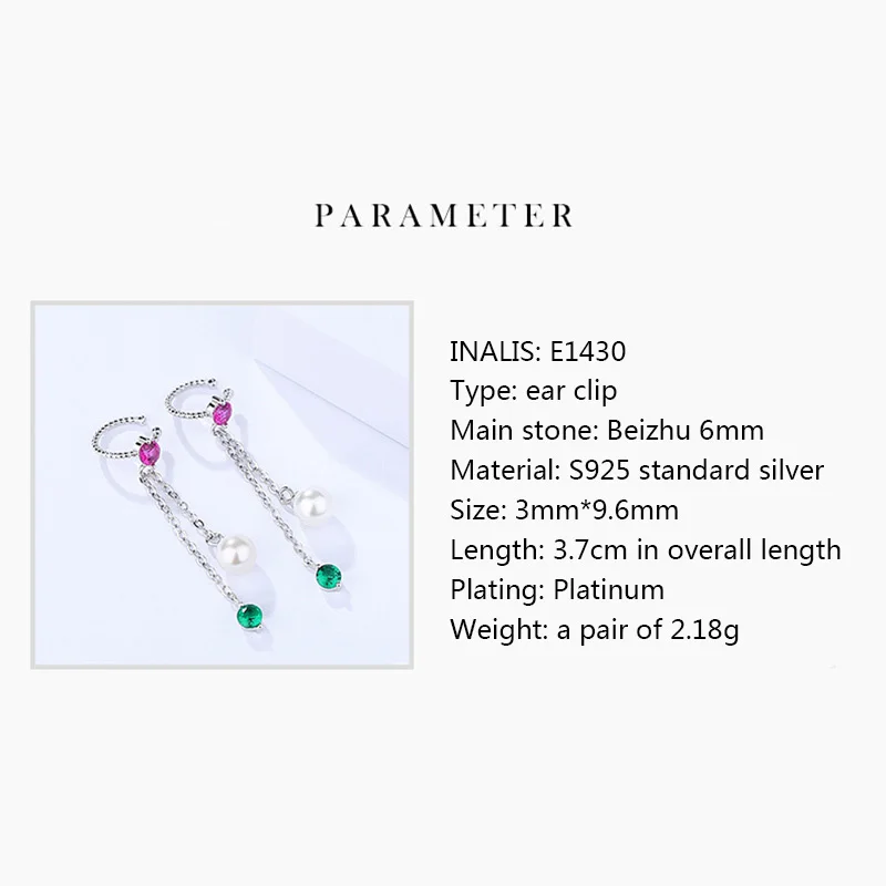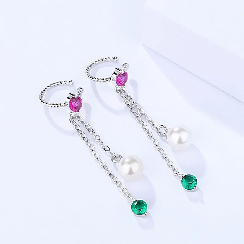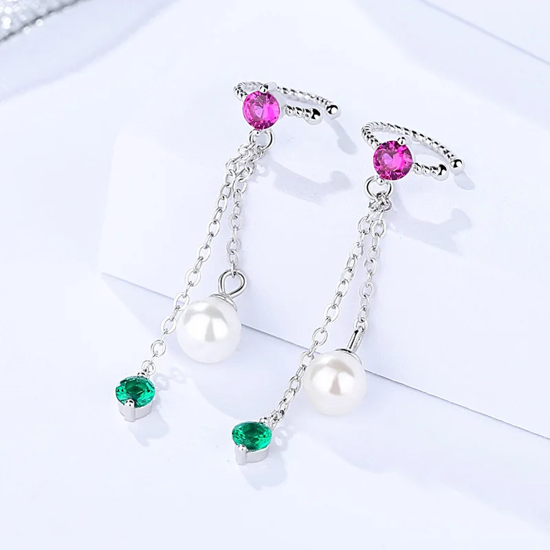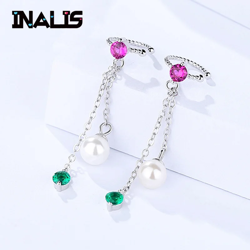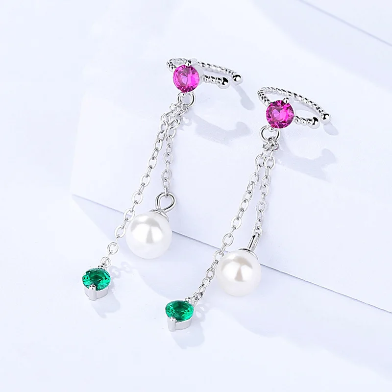 New Fashion Luxurious Long Chain Ear Clip S925 Sterling Silver CZ Crystal with Pearl Pendant Earrings for Girl Brincos