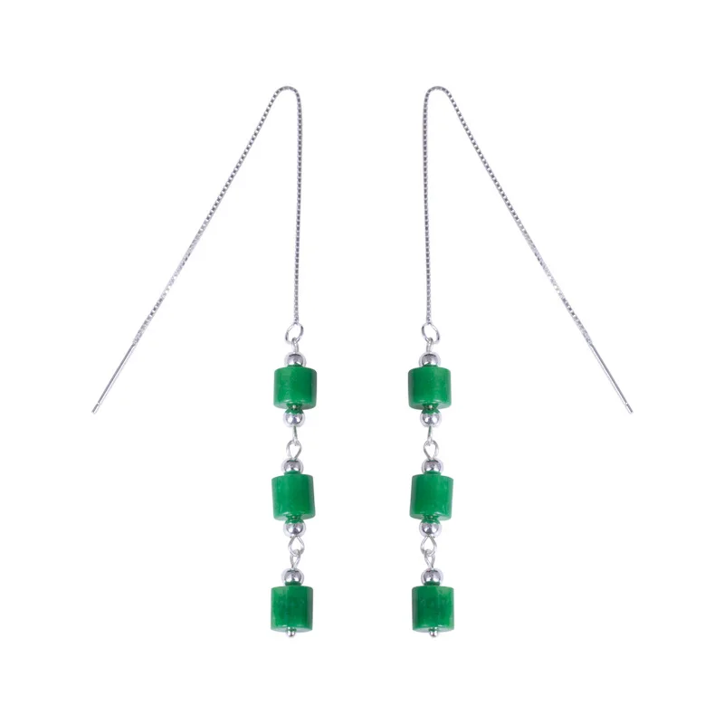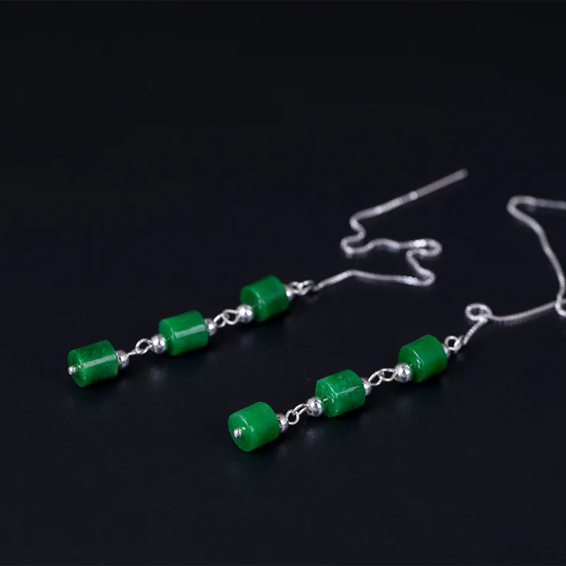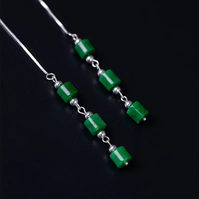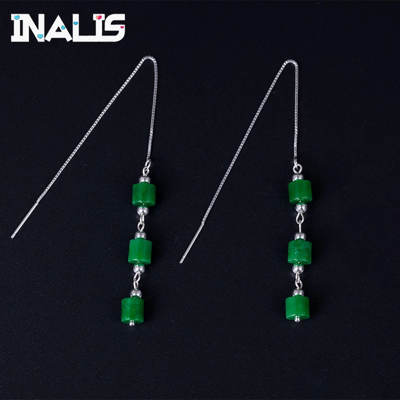New Unique Long Ear Line Chain Brincos S925 Sterling Silver Cylinder Emerald Jade Fashion Drop Dangle Earring Jewelry