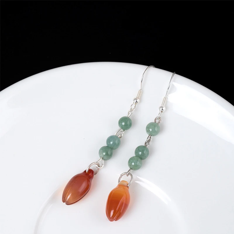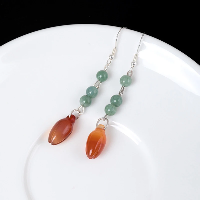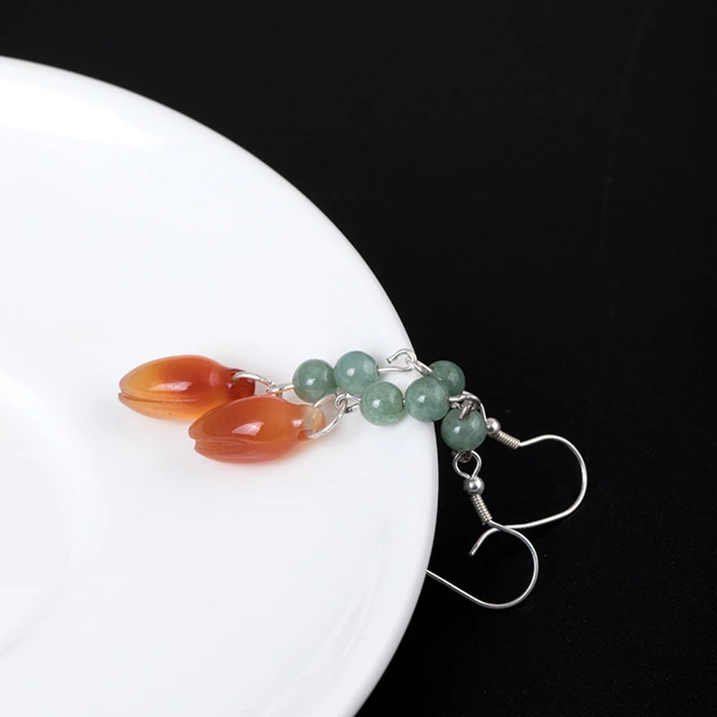 New Unique Statement Ear Hook S925 Sterling Silver Round Emerald Flower Dongling Jade Dangle Drop Earrings for Women