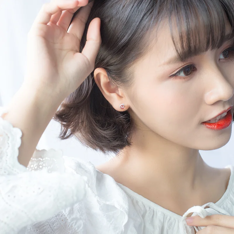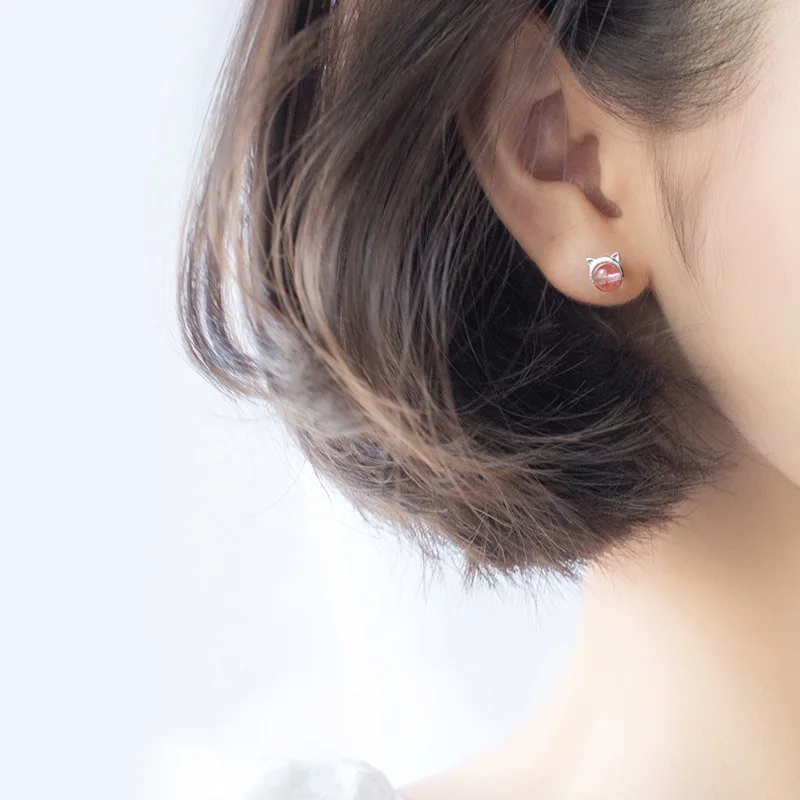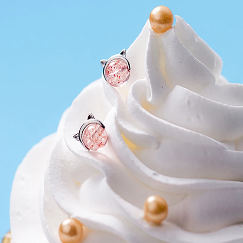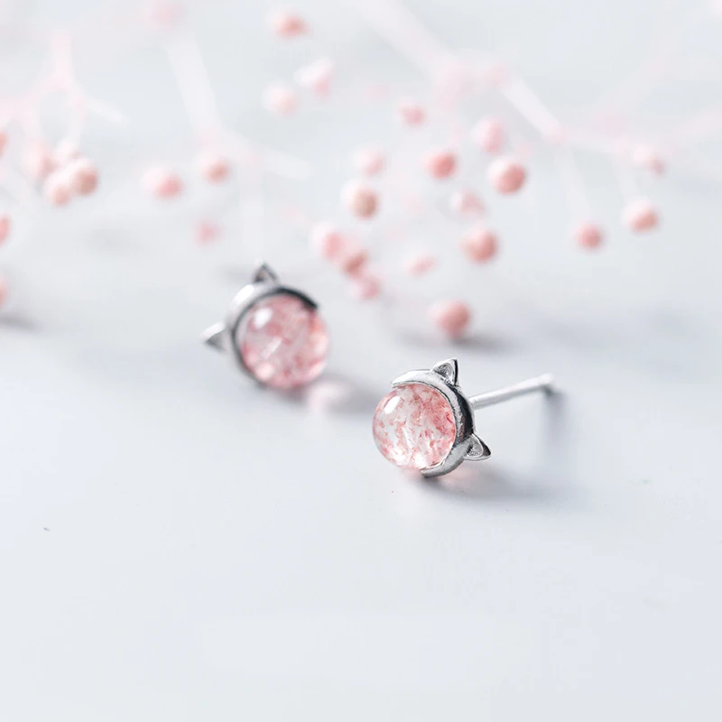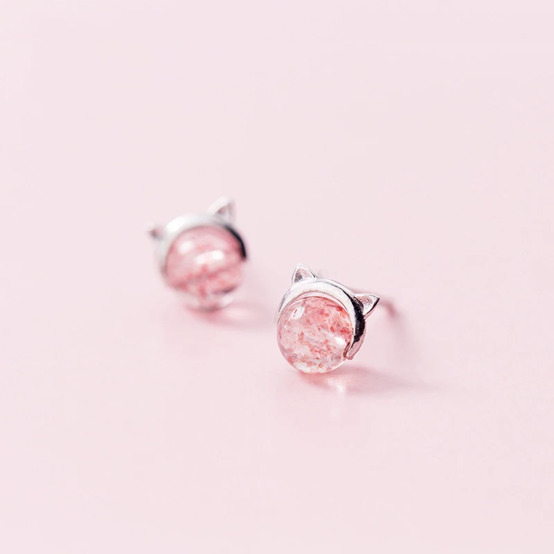 New Very Cute Animal Stud Earrings S925 Sterling Silver Cate Shape with Single Round Pink Strawberry Quartz Brincos Girl