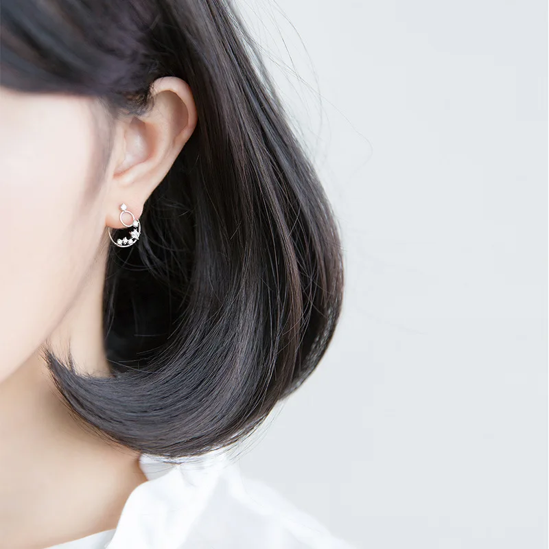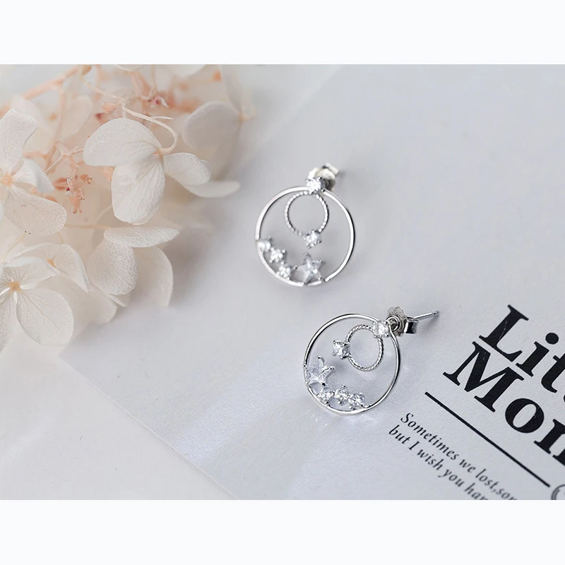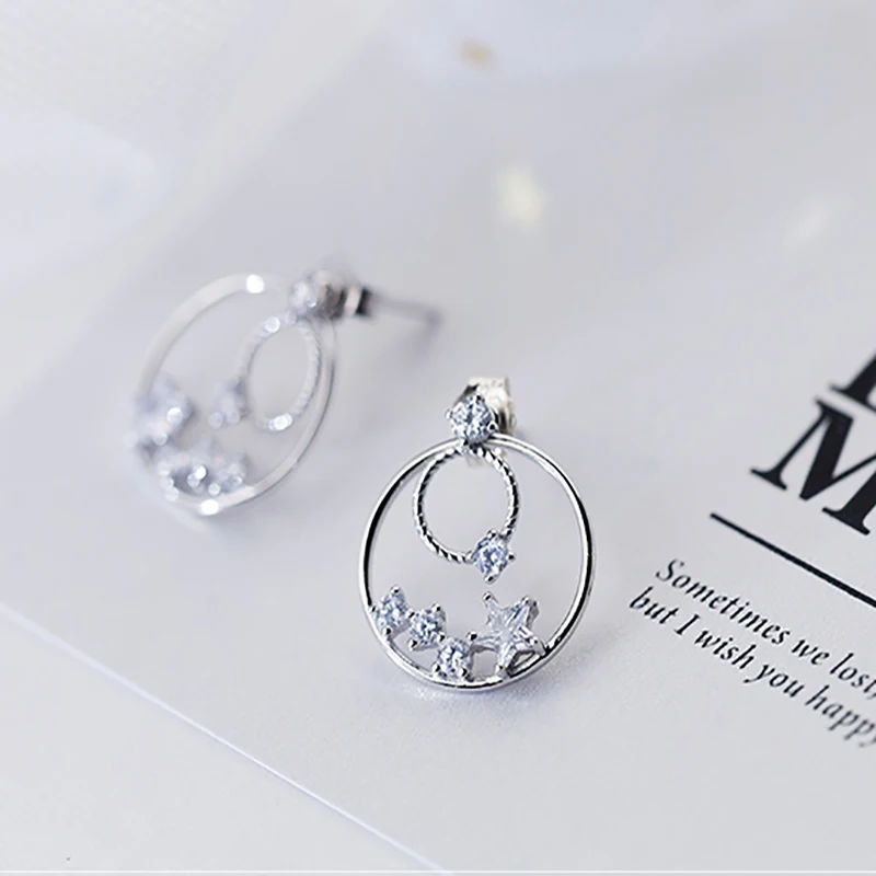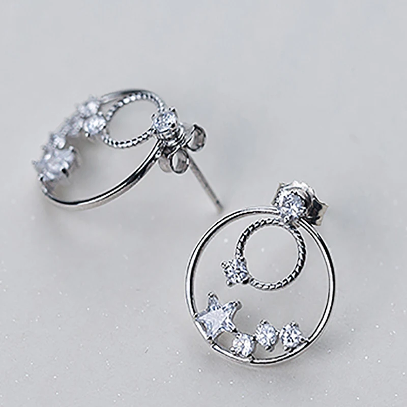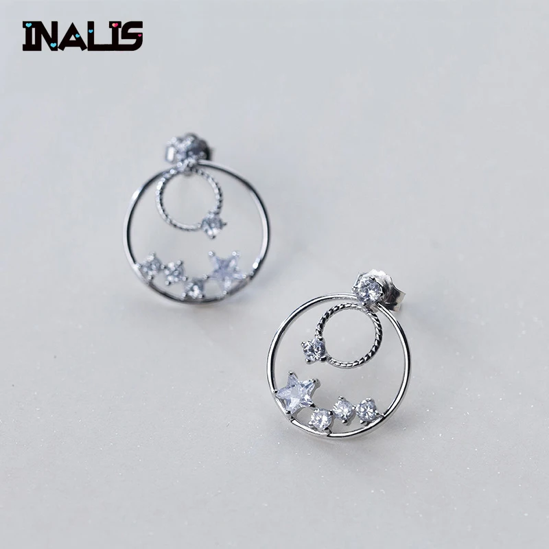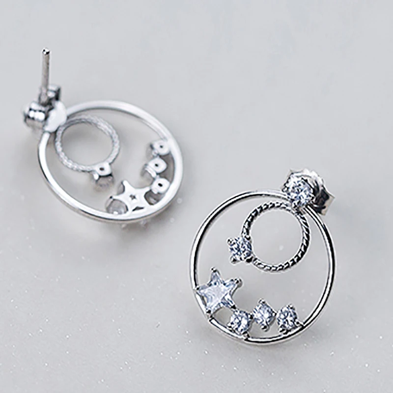 New Vintage Fine Jewelry S925 Sterling Silver Double Round Circle with Star Clear CZ Crystal Stu Earrings for Girl Brinco