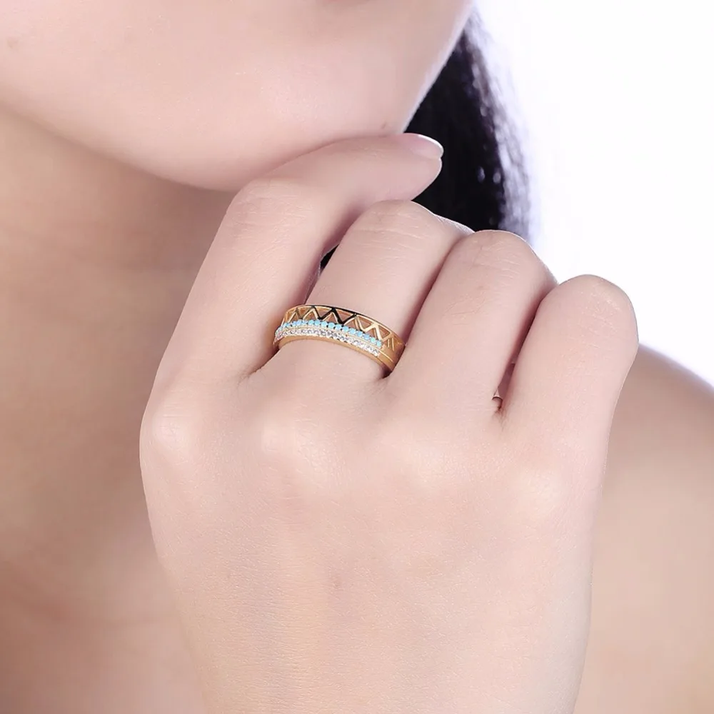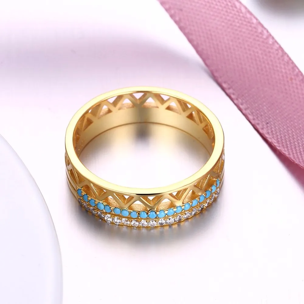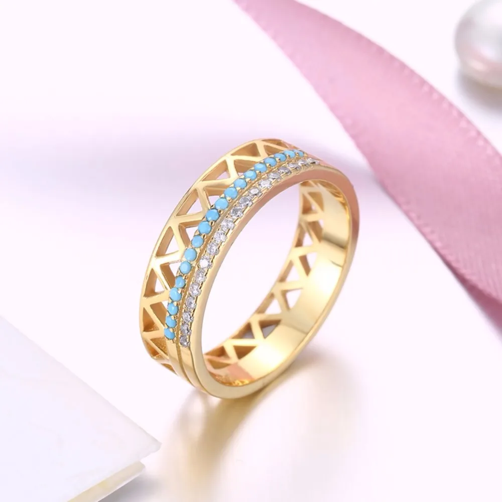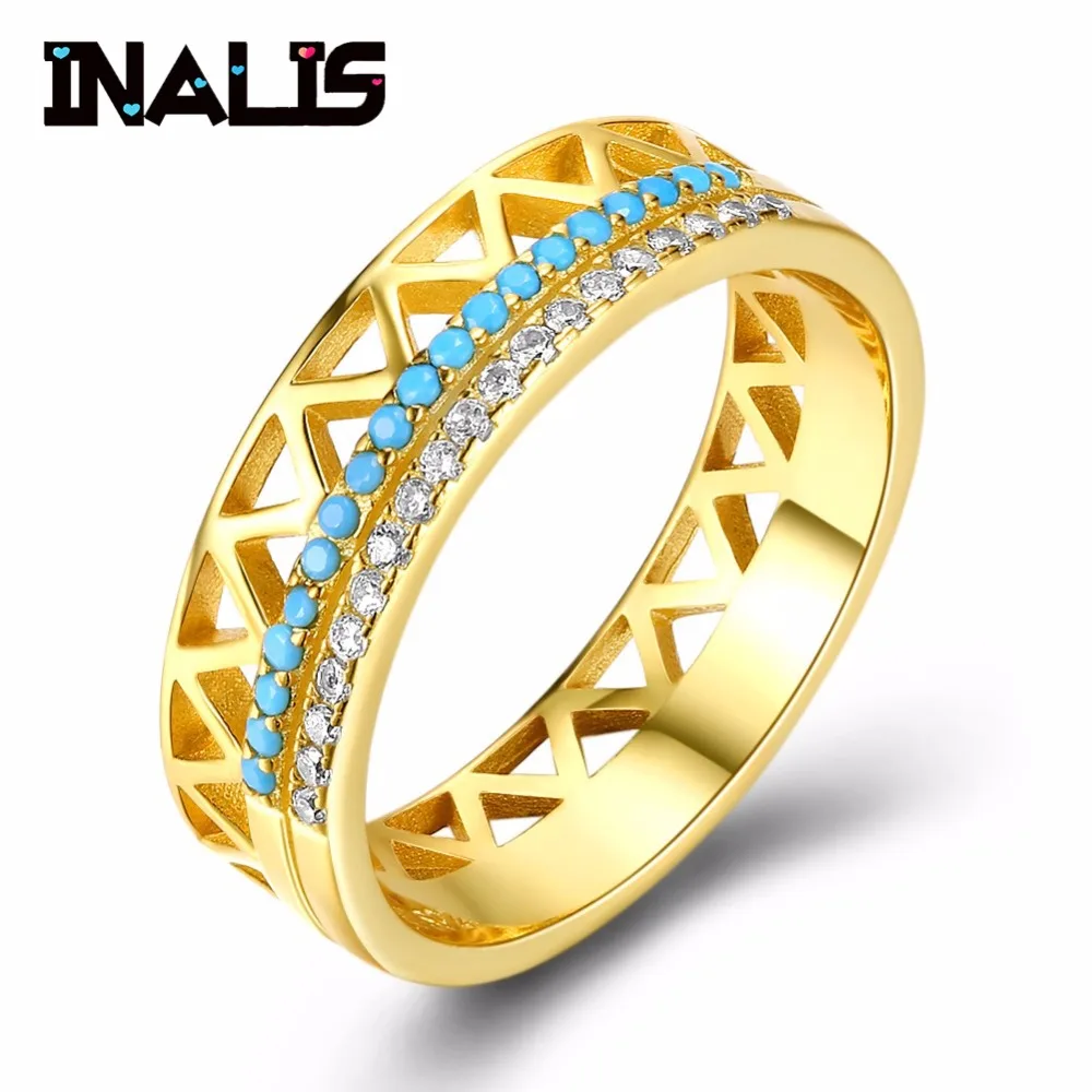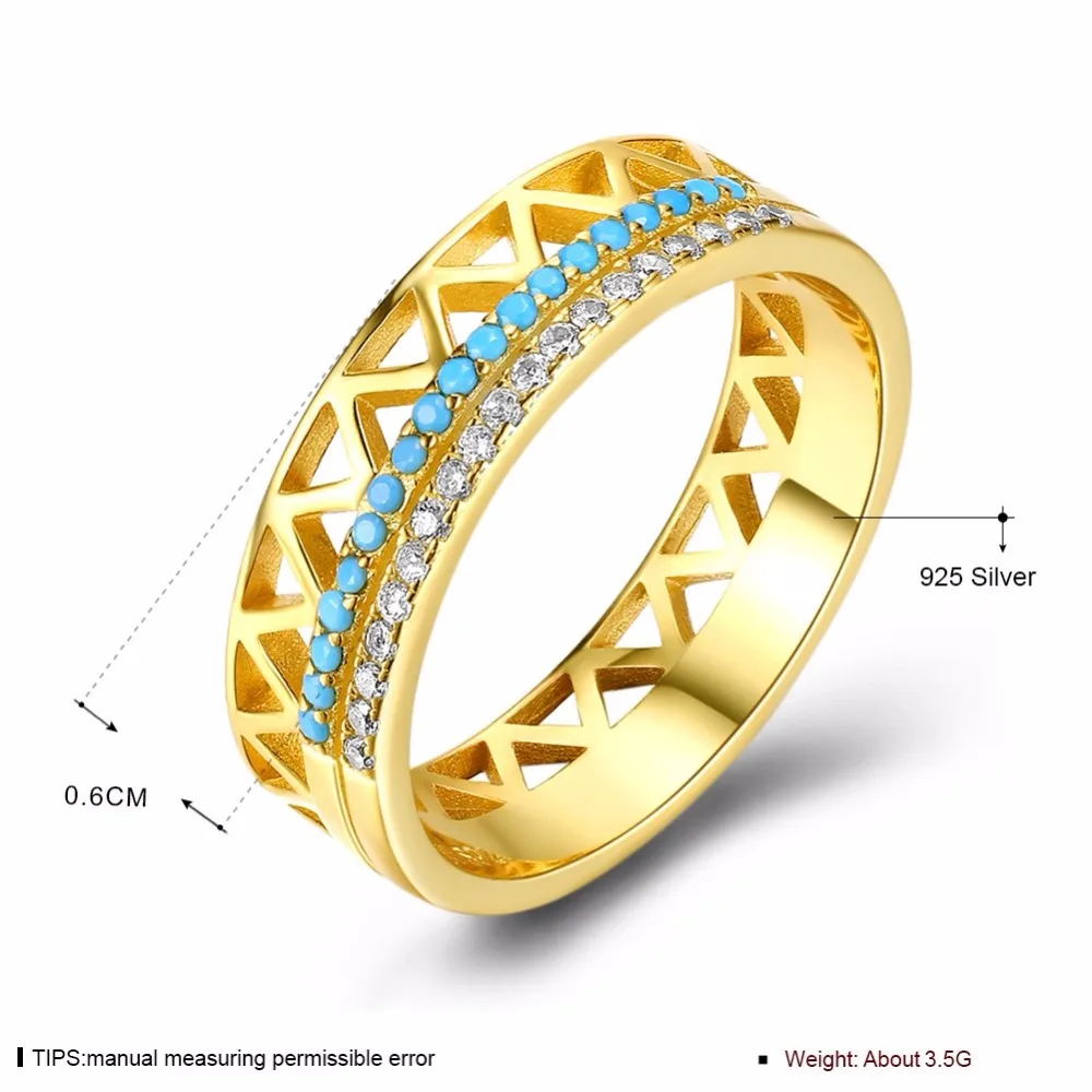 Vintage Yellow Gold Plated Ring S925 Sterling Silver with Turquoise Clear CZ Crystal Fine Jewelry for Women Wedding Gift