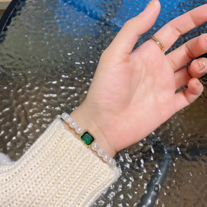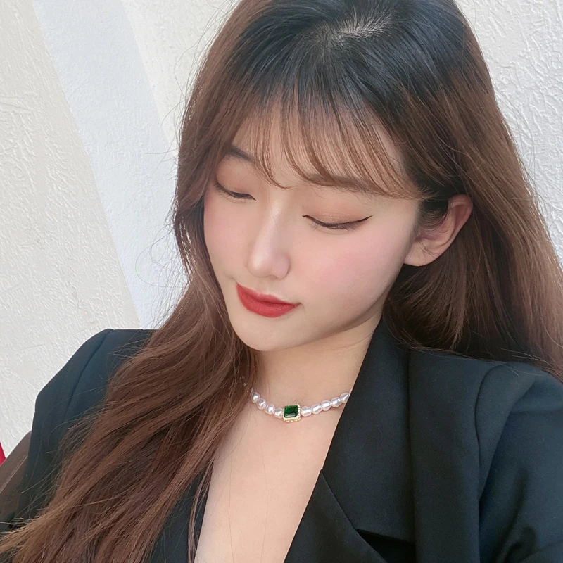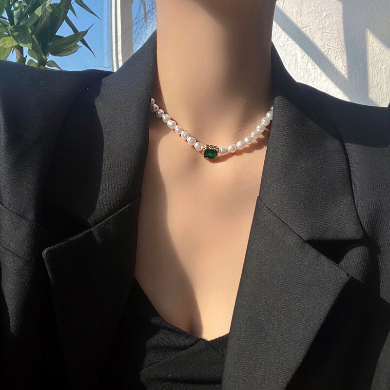 IOY IRENE Retro Geometry Square Green Glass Baroque Imitation Pearl Short Clavicle Necklace For Women Bride Jewelry 2355