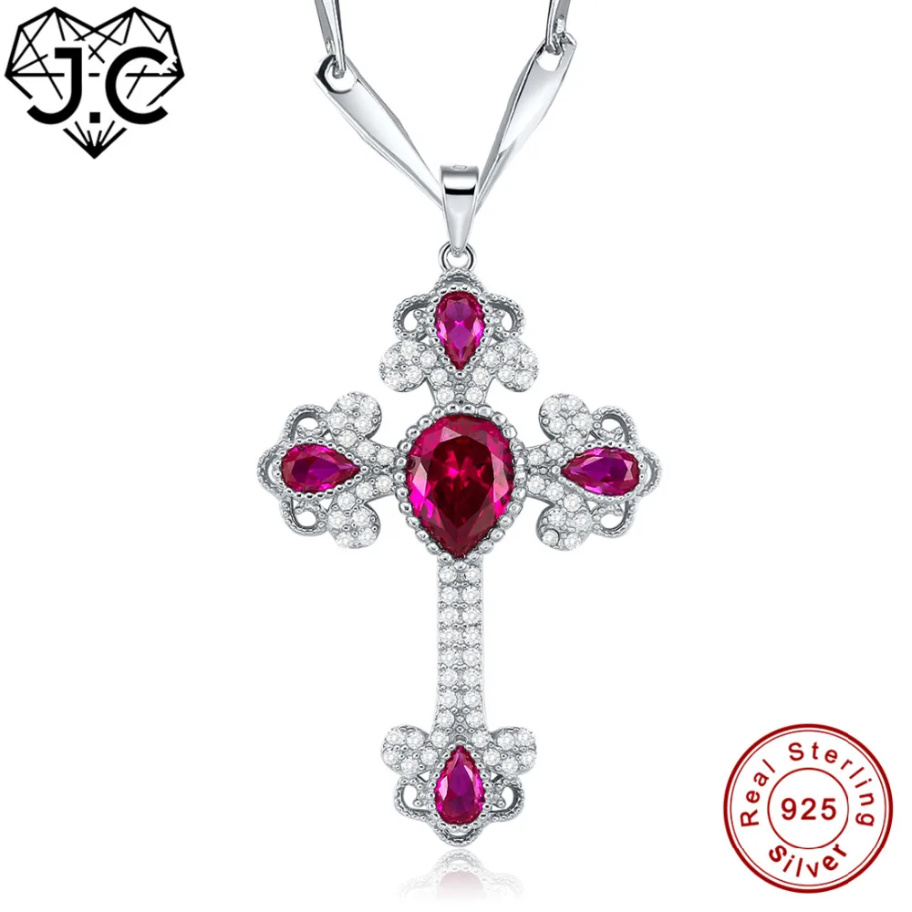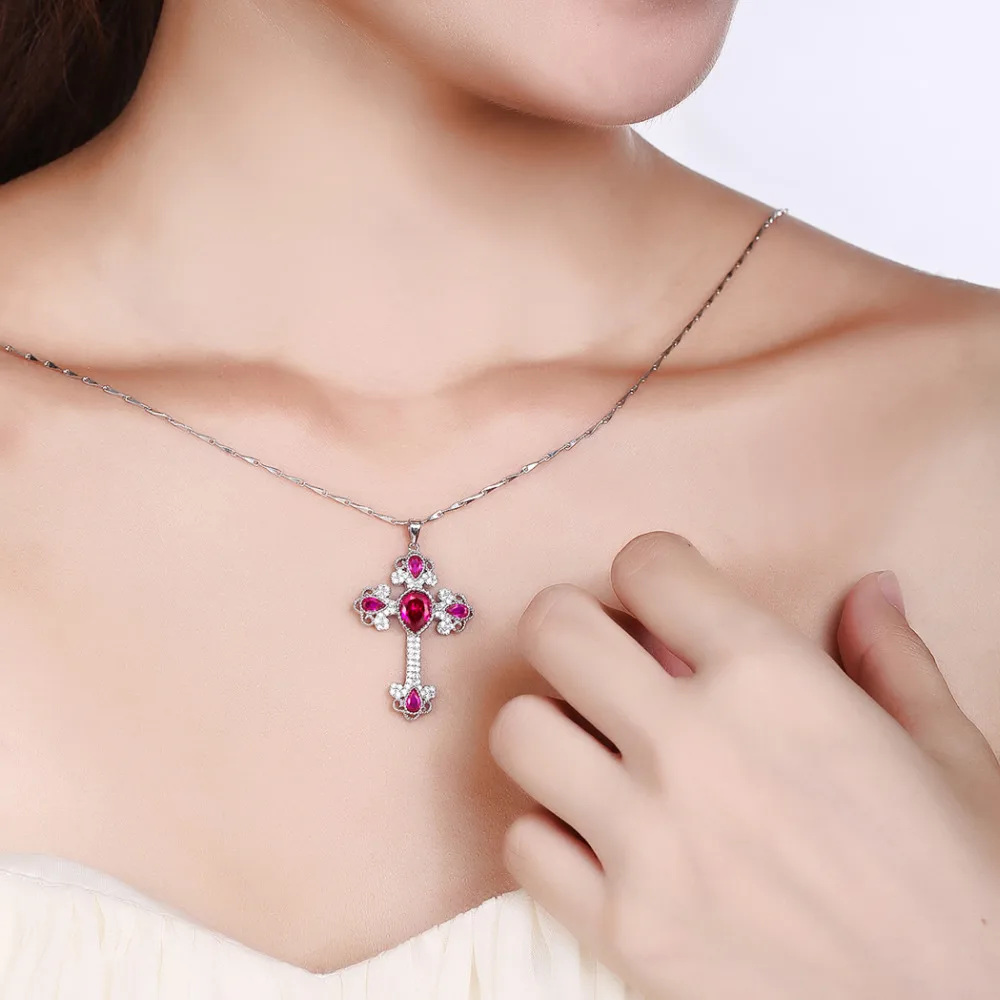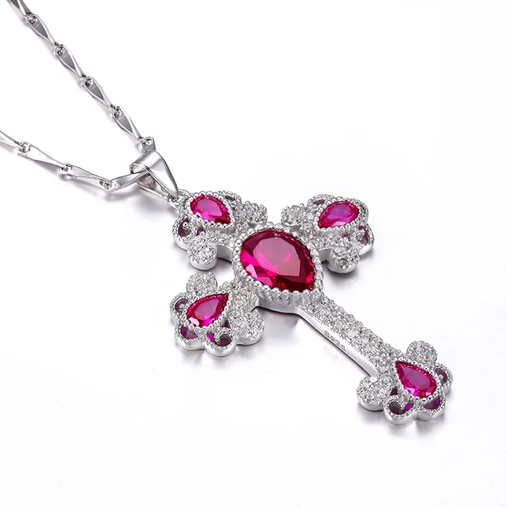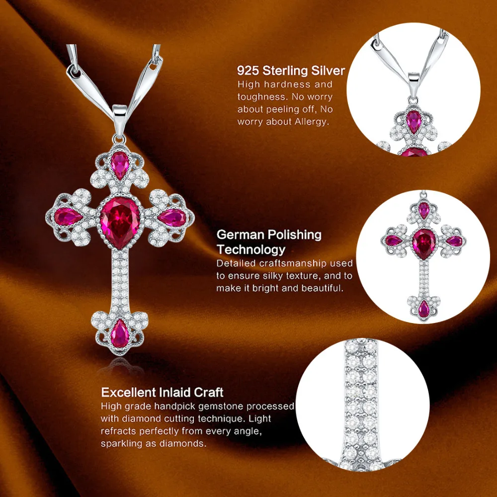 Cross Design Ruby & White Topaz Solid 925 Sterling Silver Pendant Fine Jewelry for Women Dating Excellent Necklace