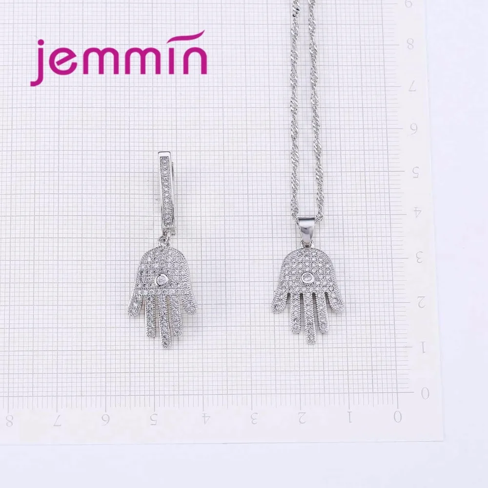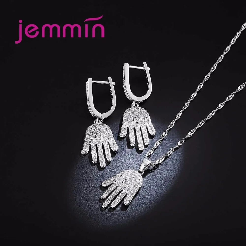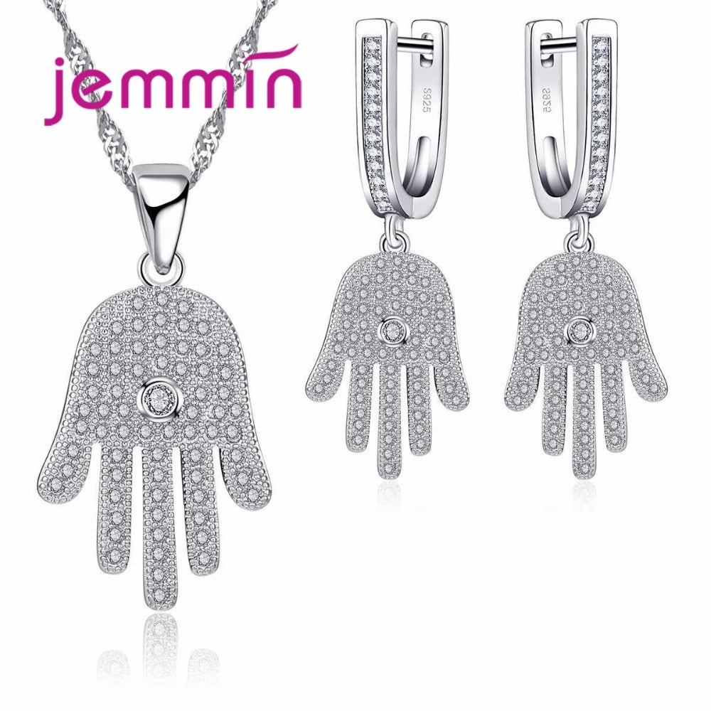 Exquistie Fine 925 Sterling Silver Palm Hamsa Rhinestone Necklace And Earrings Jewelry Set For Women Gift Party Bijoux