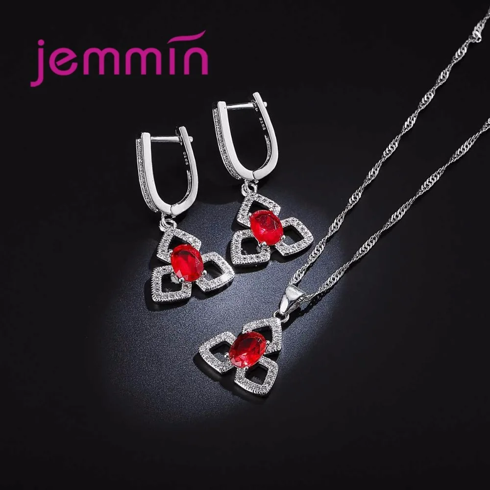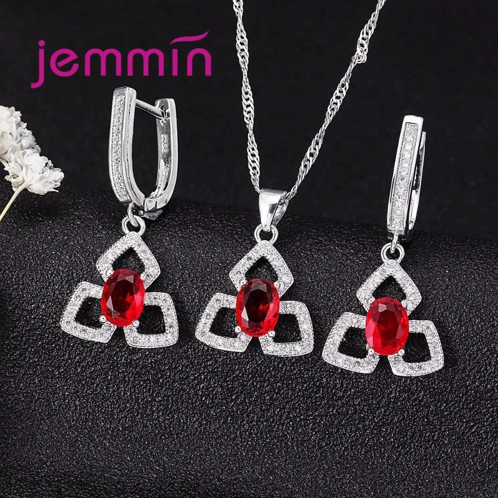 Geometric Shape 925 Sterling Silver Ruby Bridal Jewelry Sets For Wedding Woman Birthd Statement Necklace Earrings Set