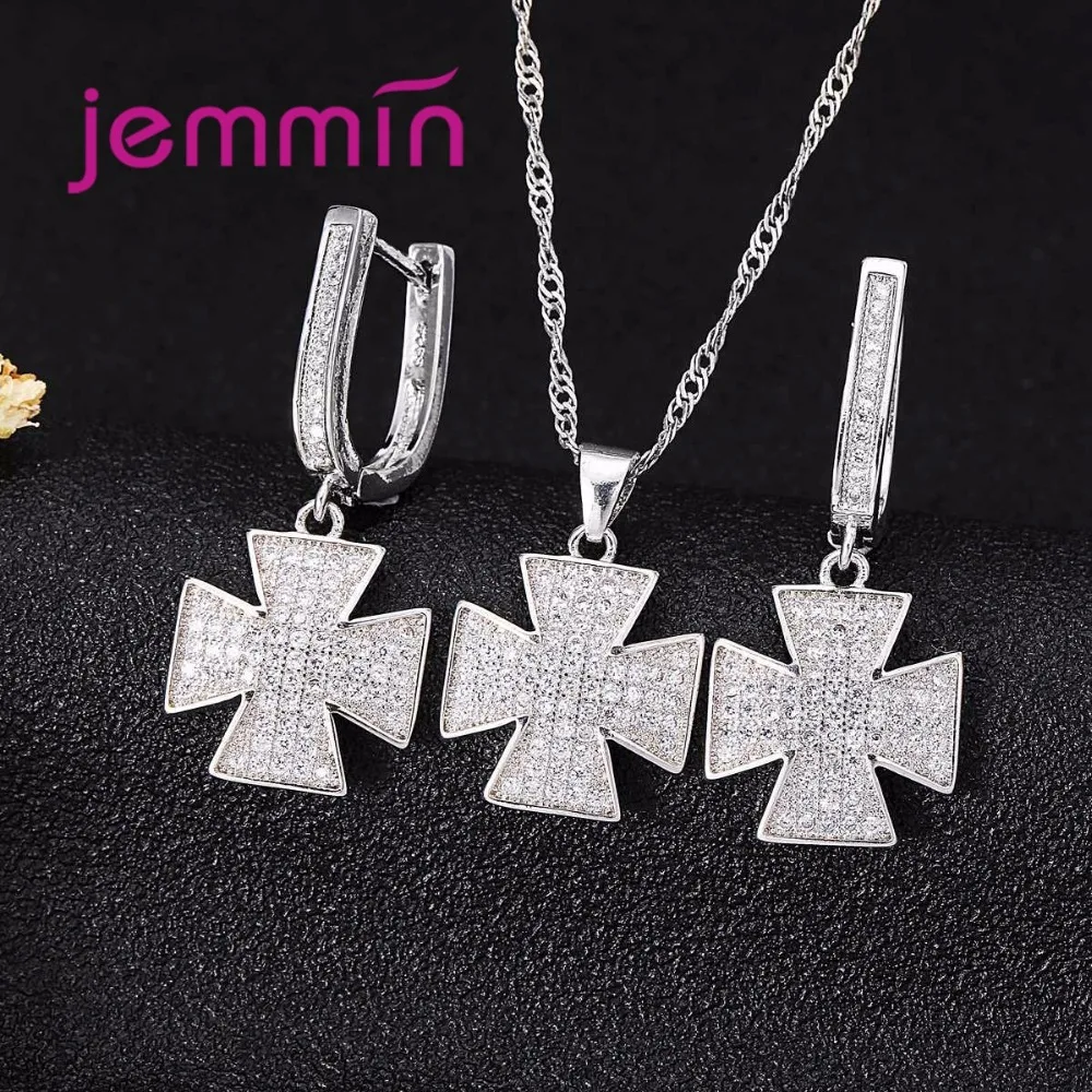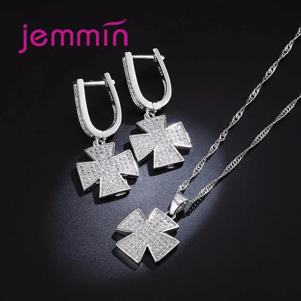 Women 925 Sterling Silver Jewelry Set Geometric Full Clear Rhinestone Pendants Necklace Earrings Sets For Party Accessory