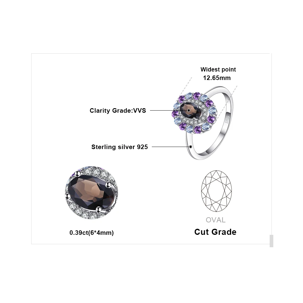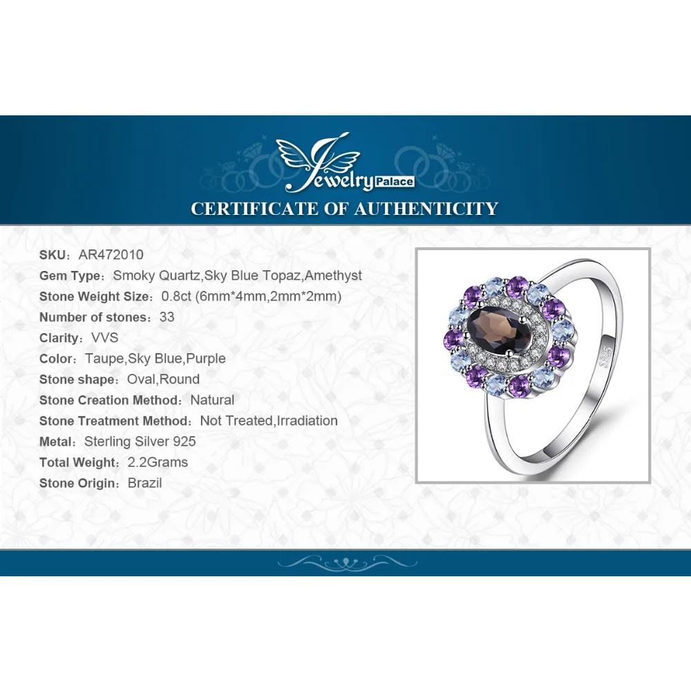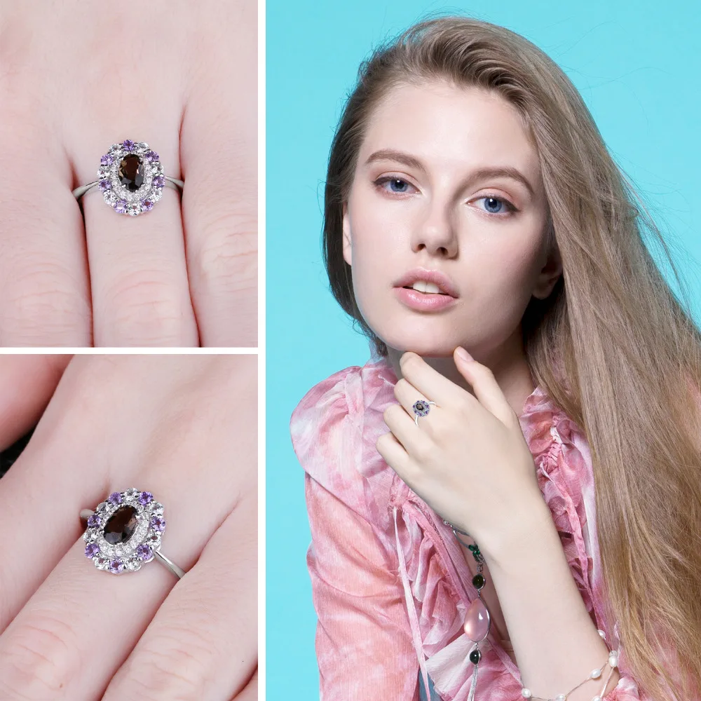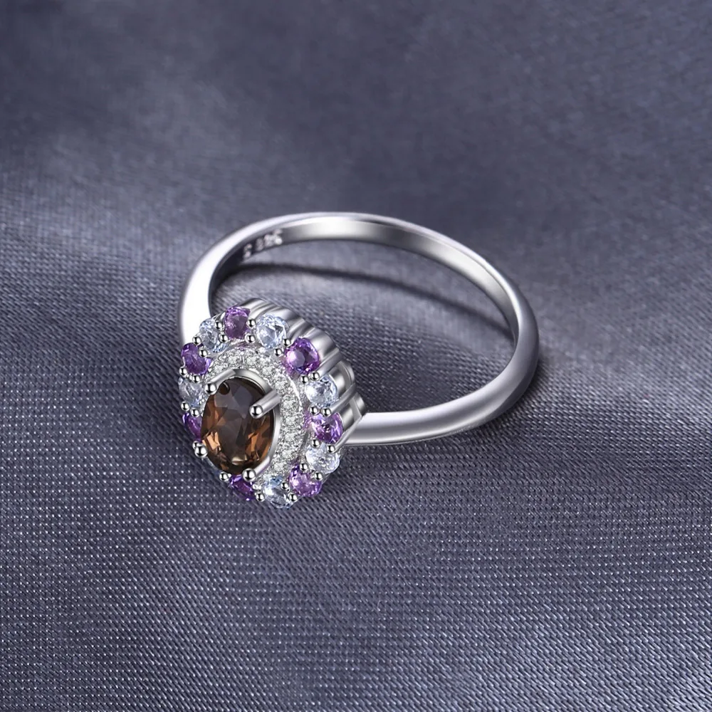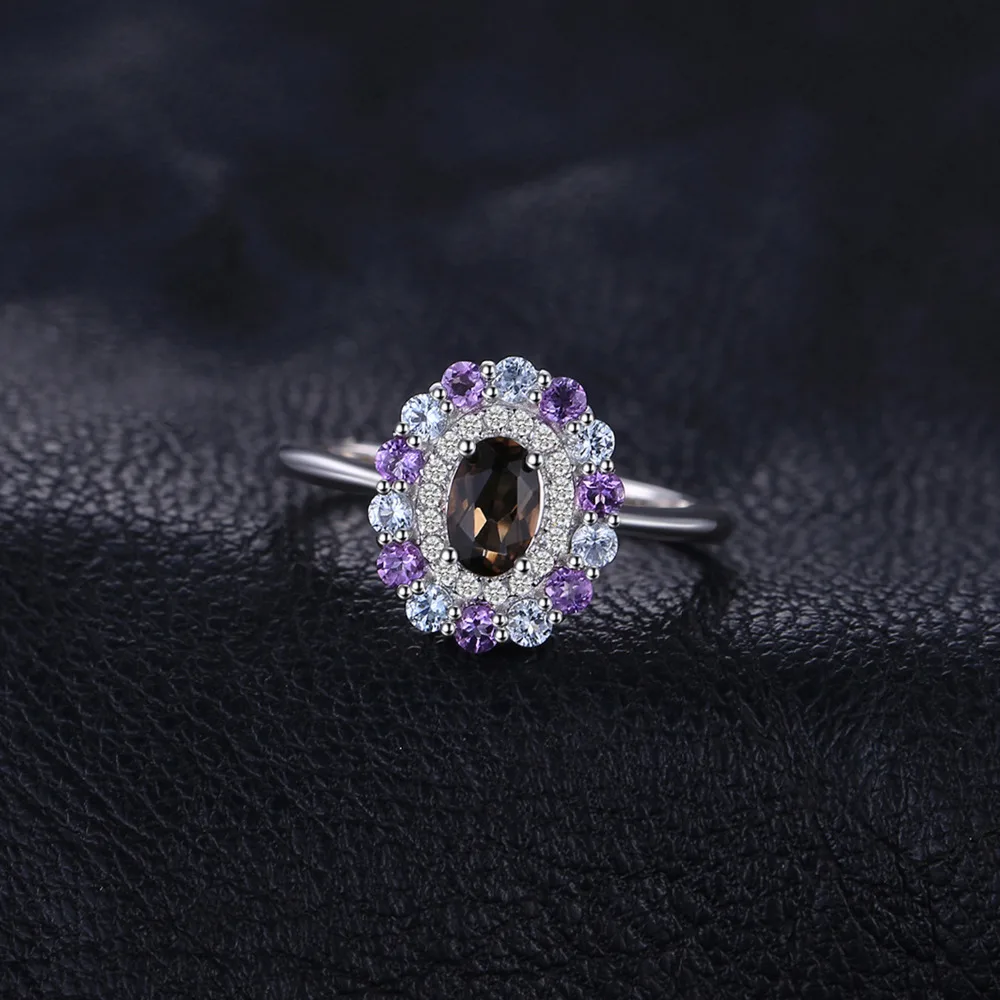 1ct Genuine Smoky Quartz Sky Blue Topaz Amethyst Cluster Ring 925 Sterling Silver Vintage Gift For Women Jewelry