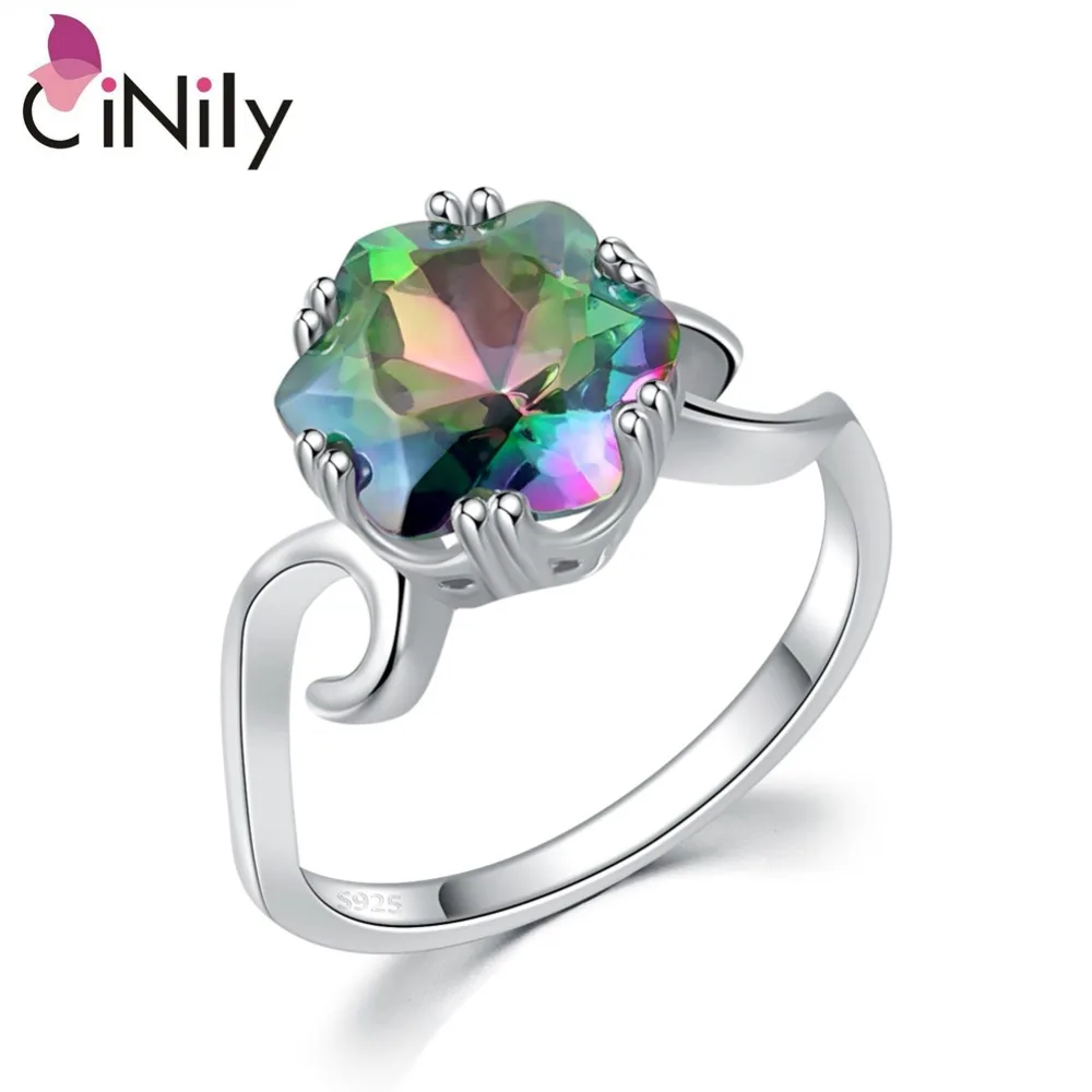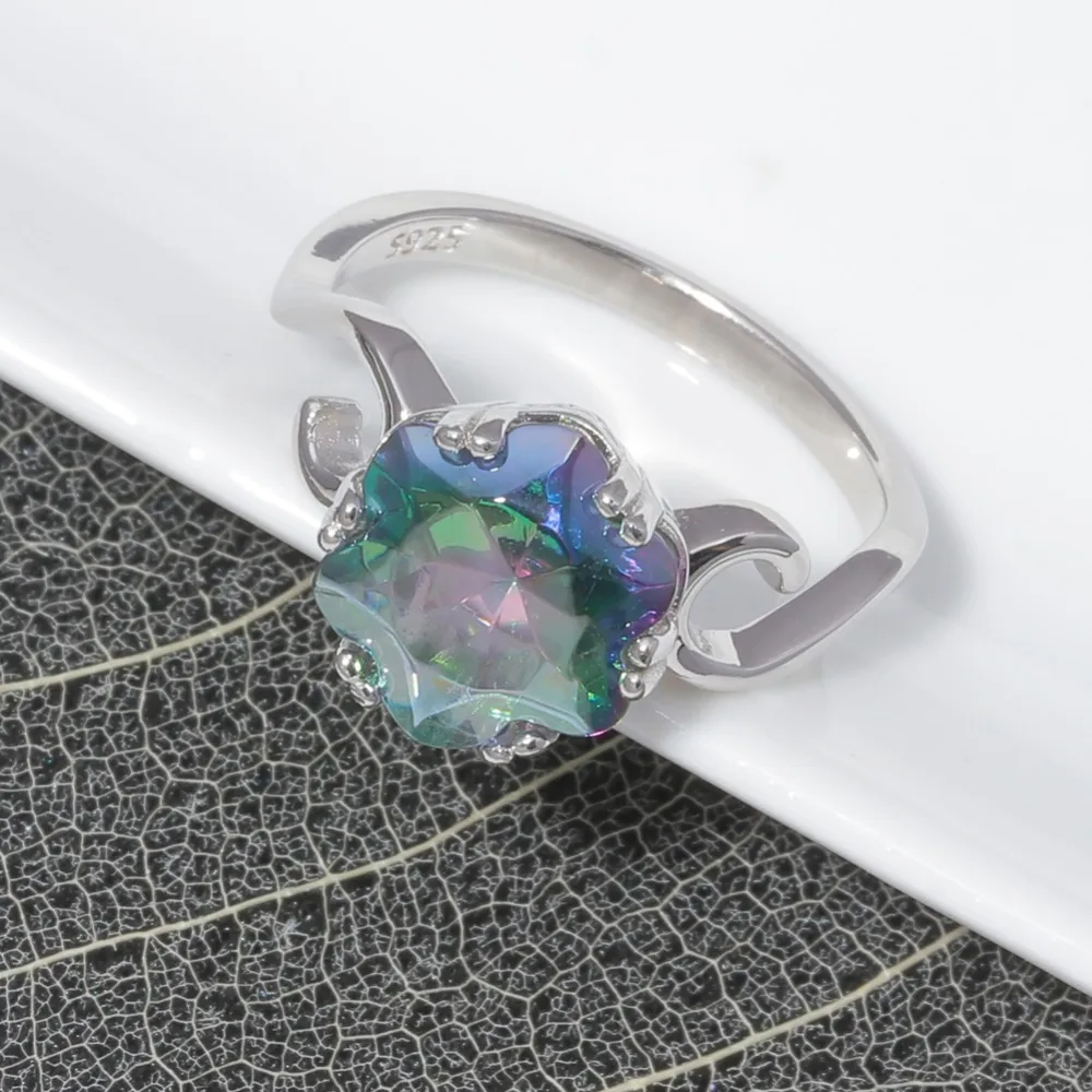 Authentic. Solid 925 Sterling Silver Created Mystic Topaz Round-Shape for Women Fine Jewelry Wedding Ring Size 6-9 SR015