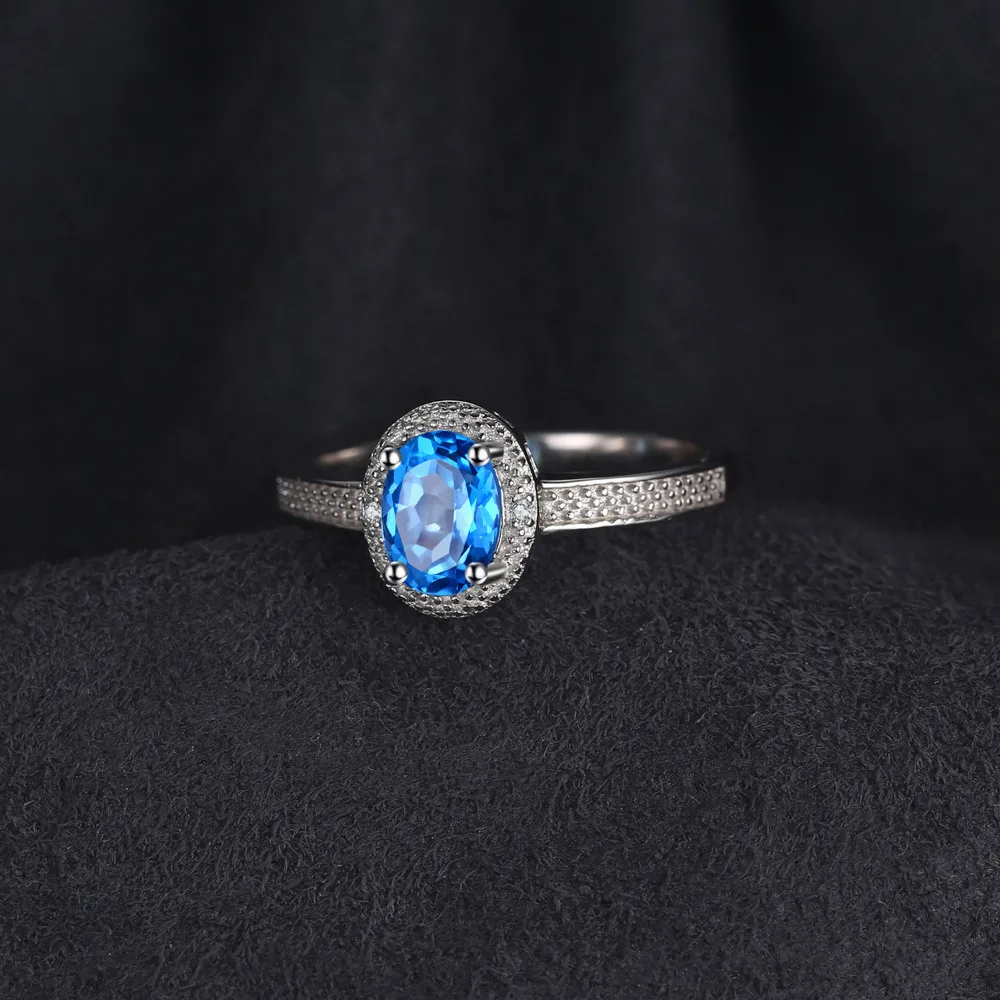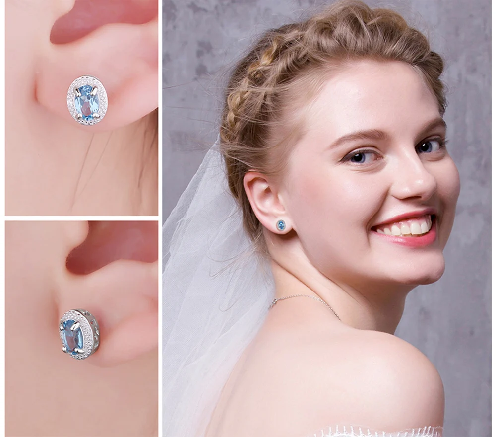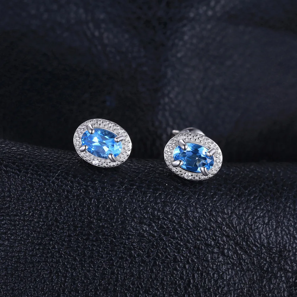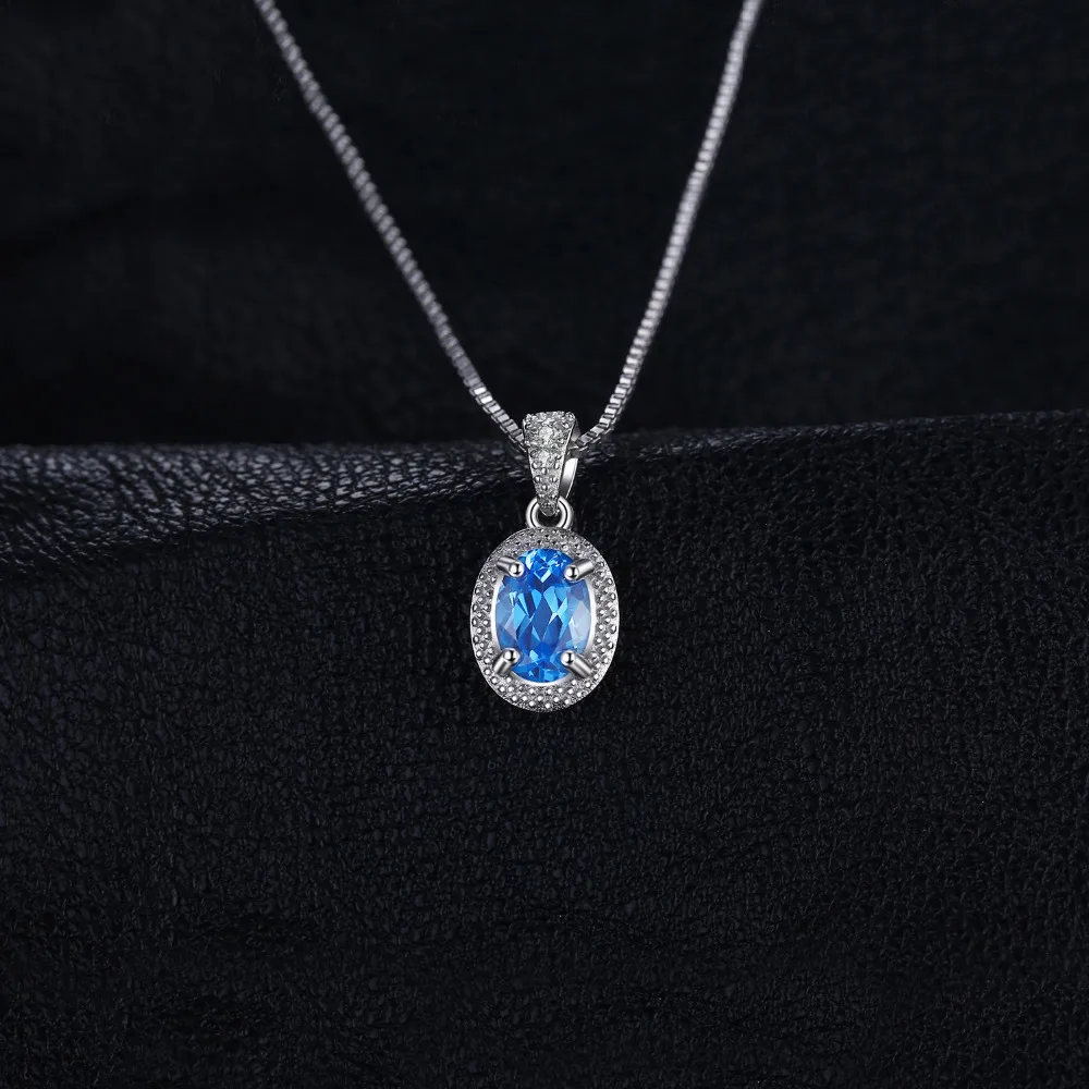 Classic 3ct Genuine Swis Blue Topaz Halo Ring Pendant Necklace Stud Earrings Jewelry Sets 925 Sterling Silver 45cm