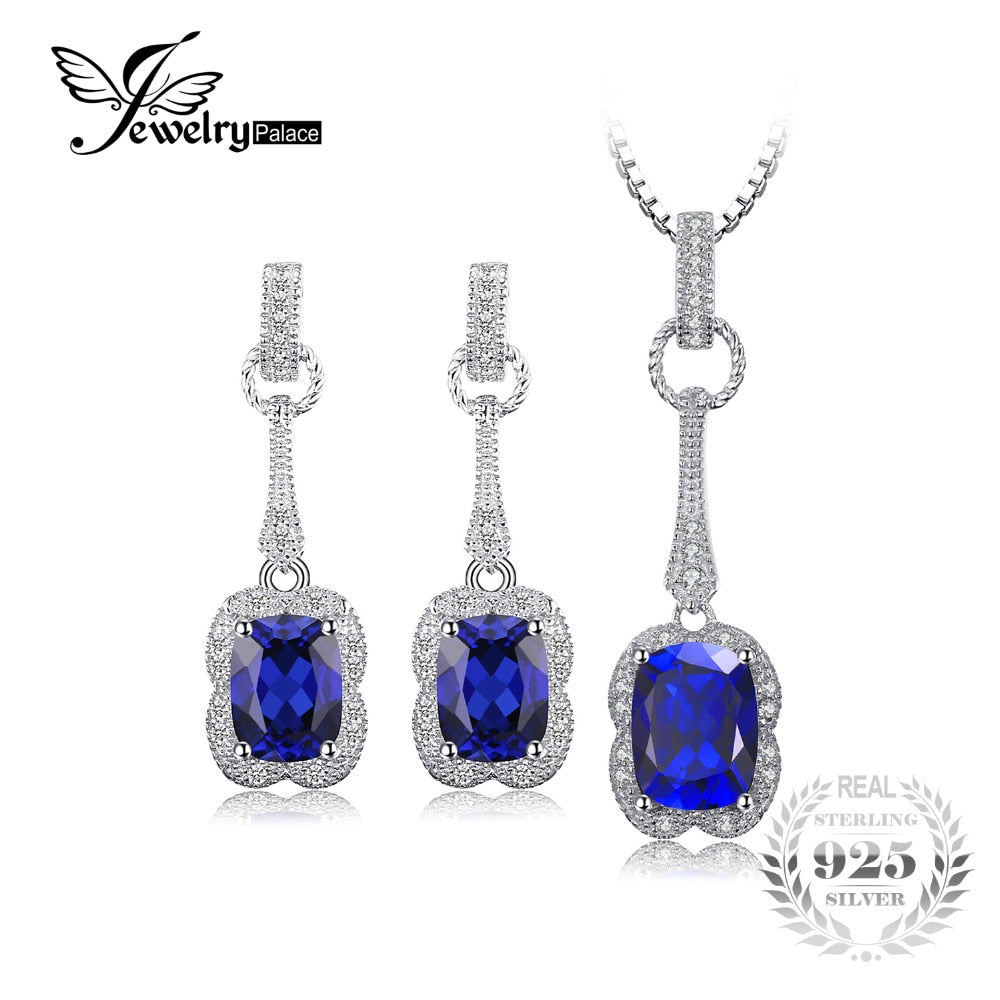Elegant Rectangle 6.6ct Created Sapphire Drop Dangle Earrings Pendant Necklace 925 Sterling Silver For Women