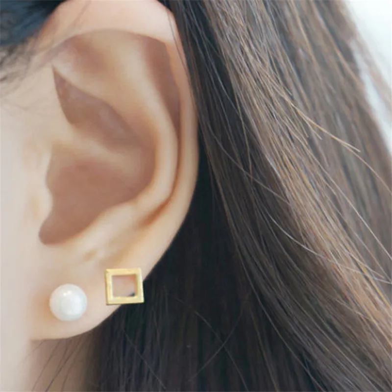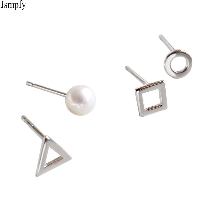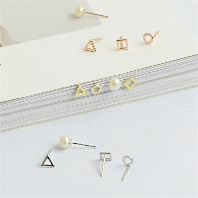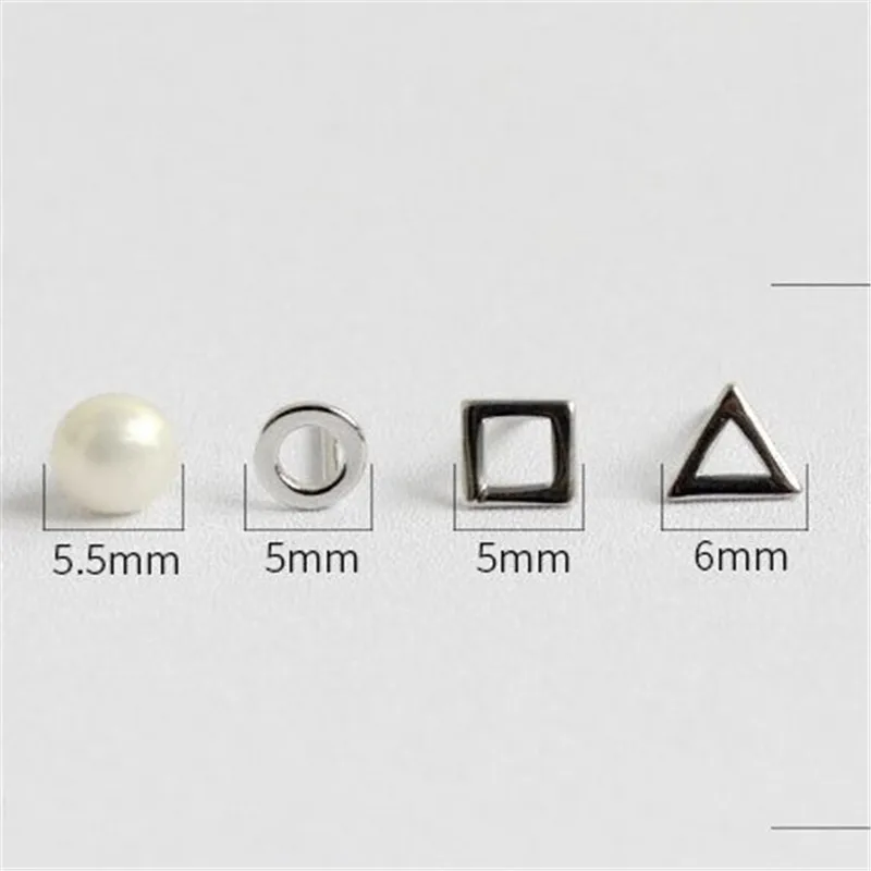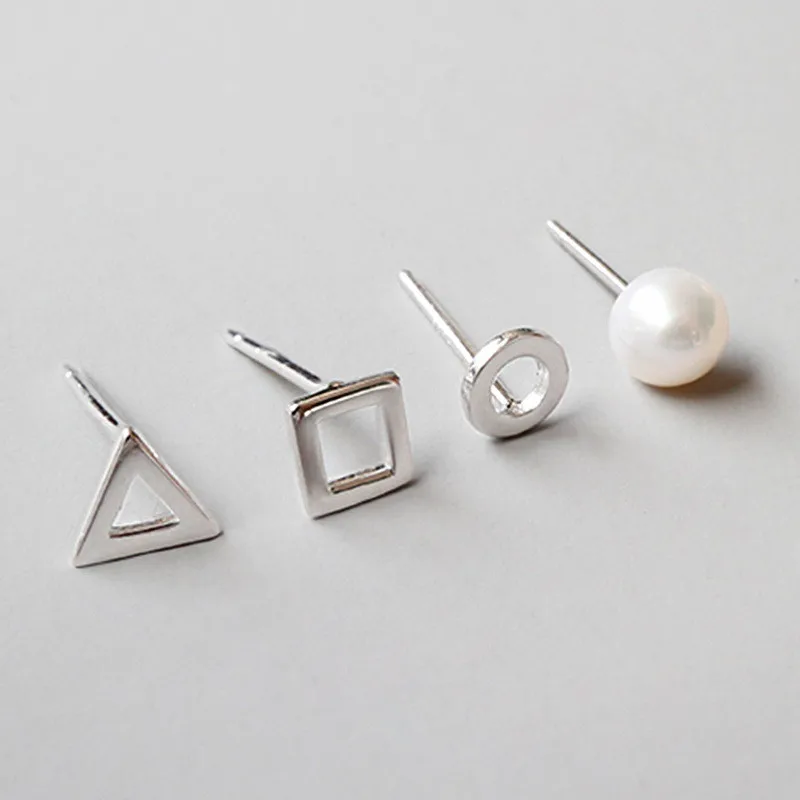 New Simple Tiny Earring Sets 925 Sterling Silver 4Pcs/Set Earring Geometric Triangle Round Square Pearl Stud Earrings
