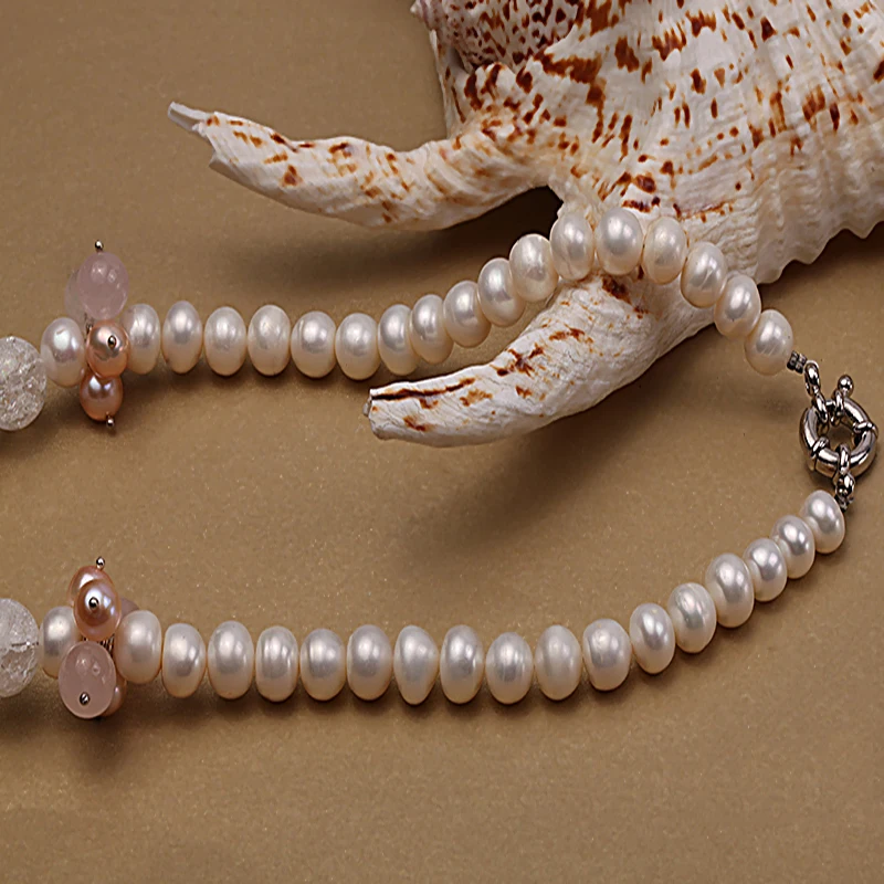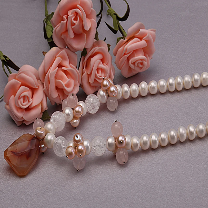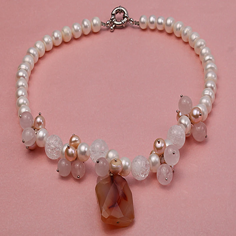 Real Natural 9-10mm White Pearl with Rose Quartz and Agate Necklace