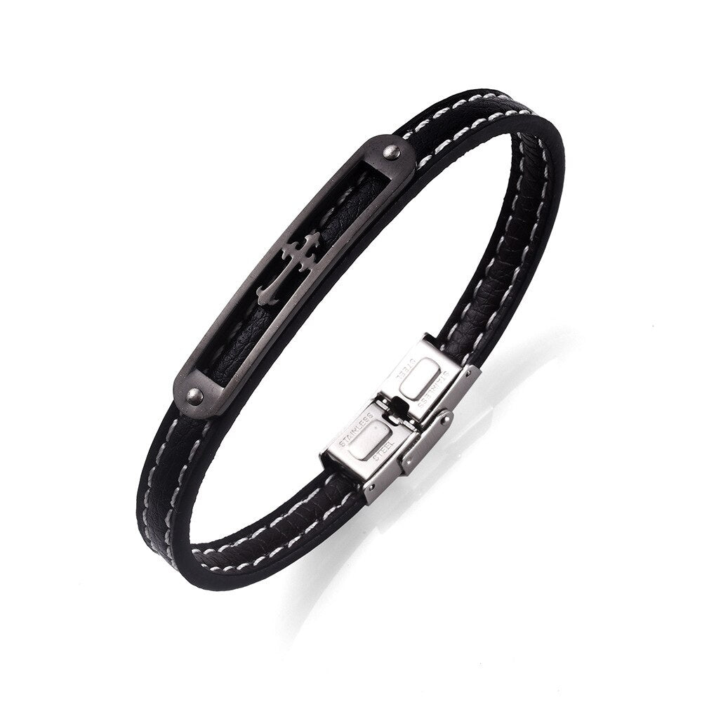Kirykle Genuine Leather White String Stich Stainless Steel Cross Clasp Bracelet For Men