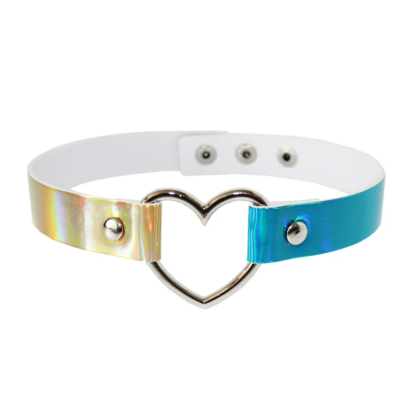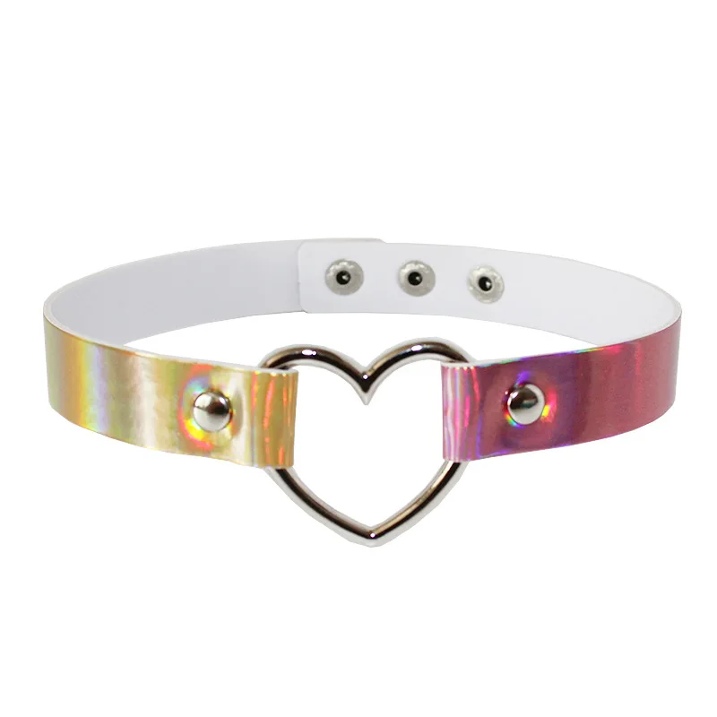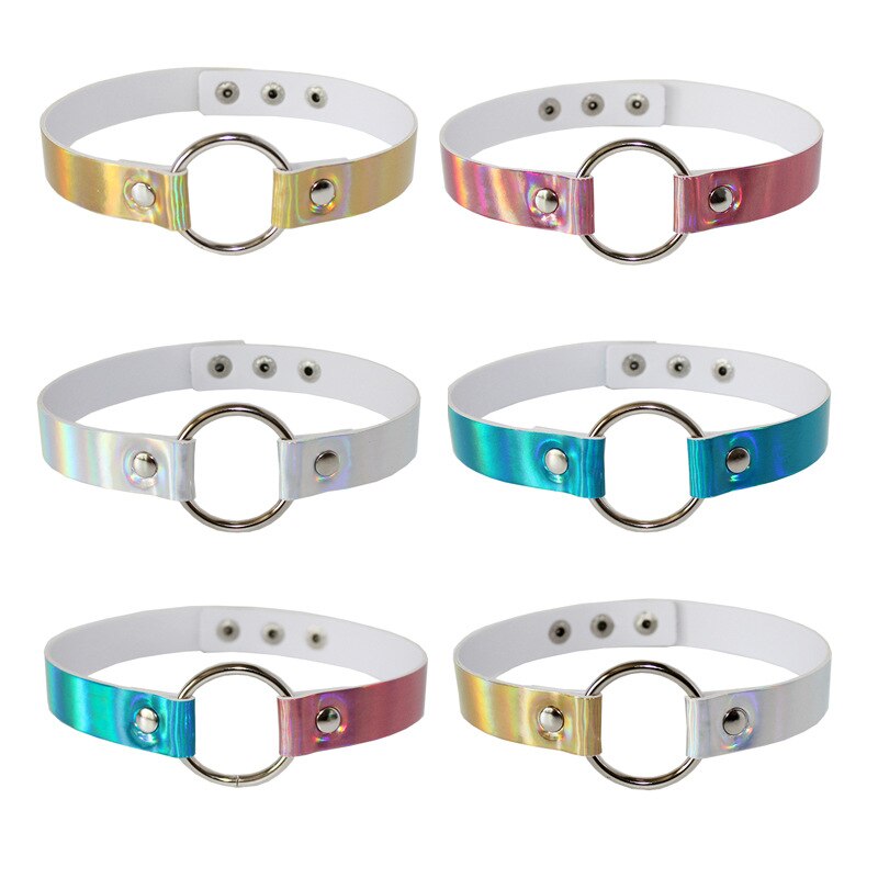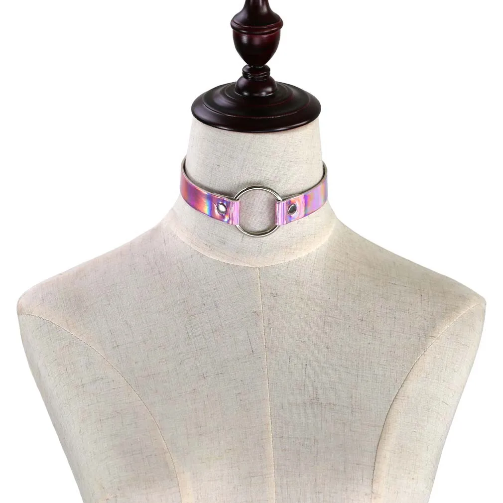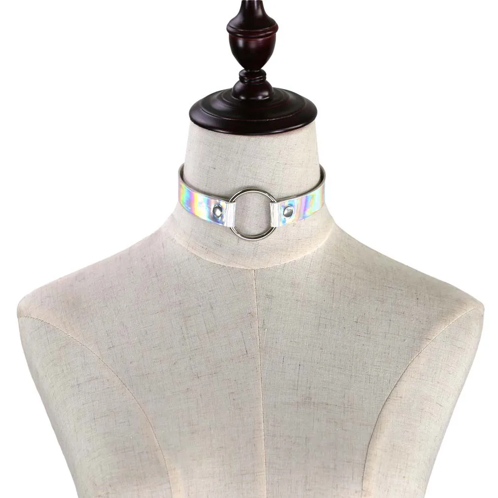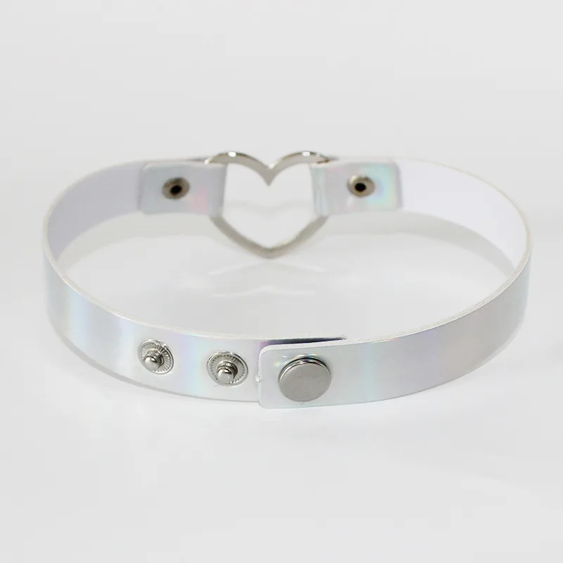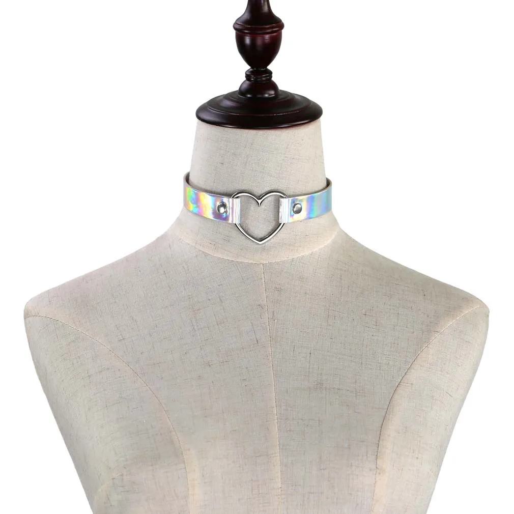 Kirykle  Laser Light PU Leather Choker Necklace metal Heart/circle shape Pendant Charm For Punk Collar Chocker 39*1.8cm Adjustab