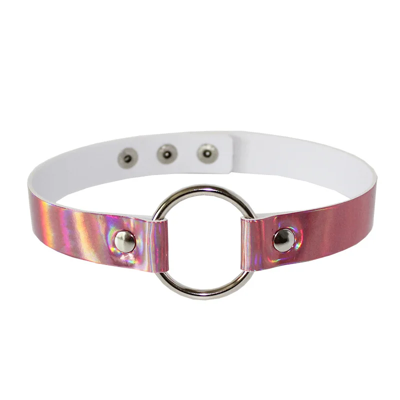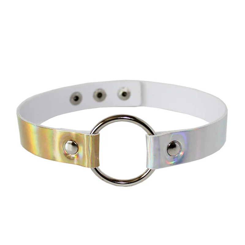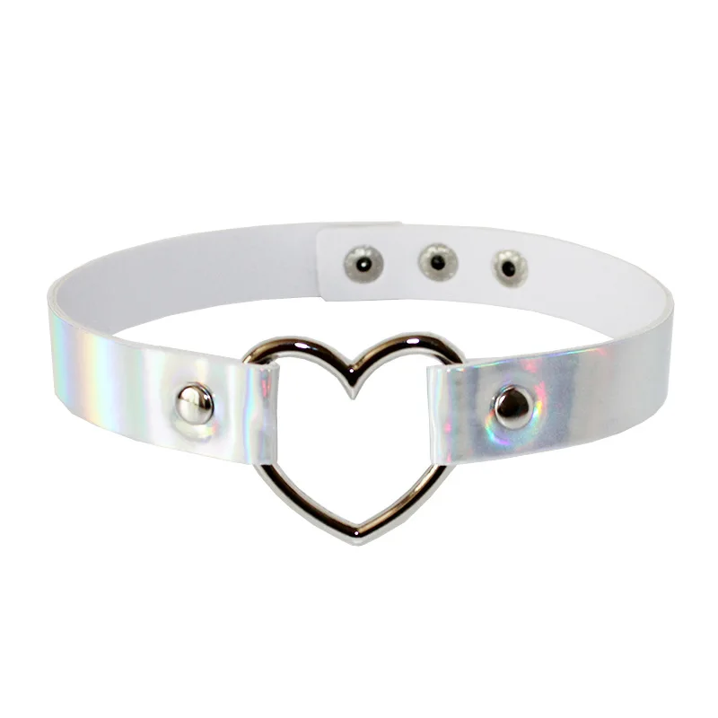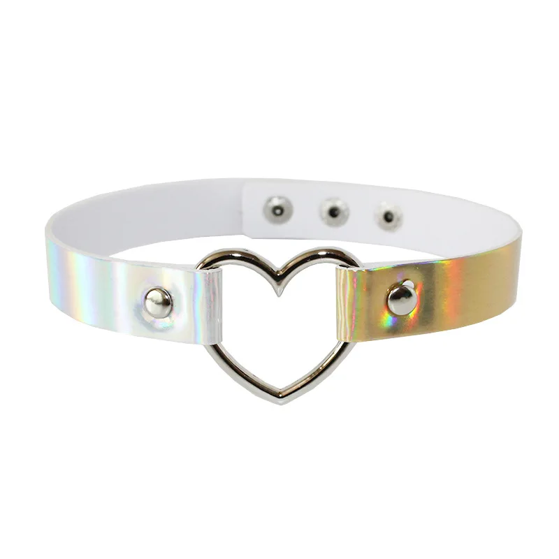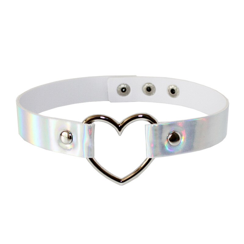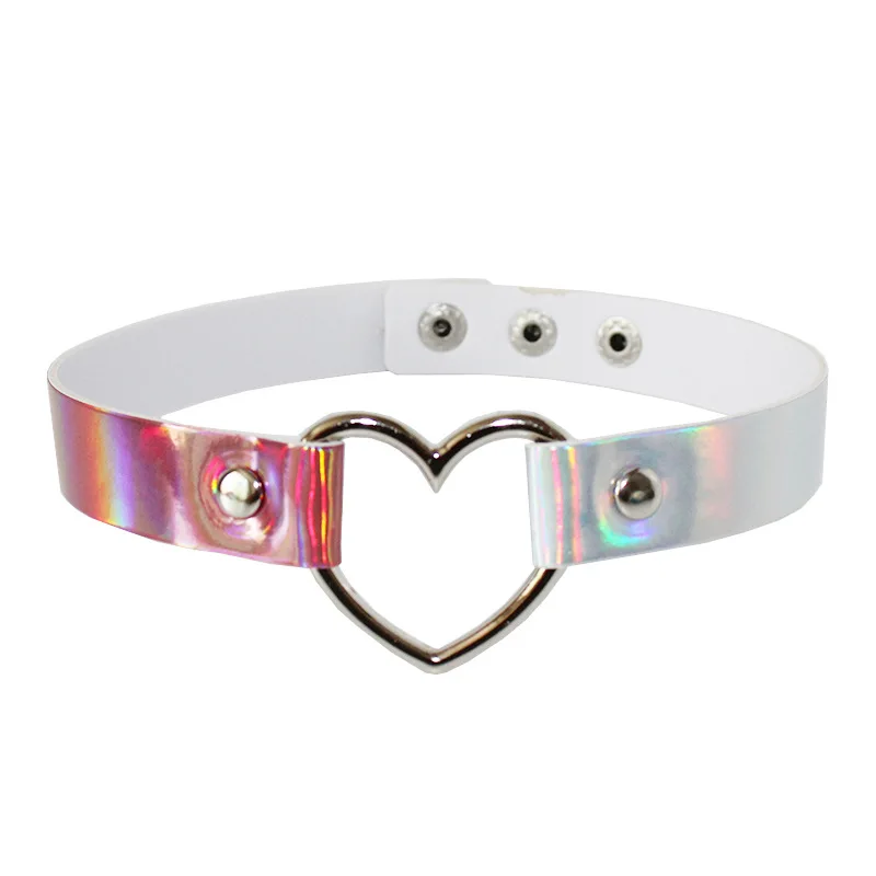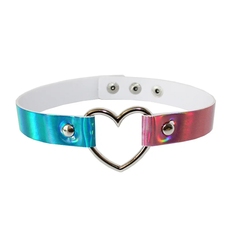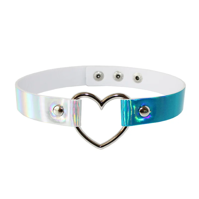 Kirykle  Laser Light PU Leather Choker Necklace metal Heart/circle shape Pendant Charm For Punk Collar Chocker 39*1.8cm Adjustab