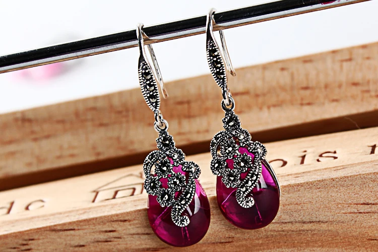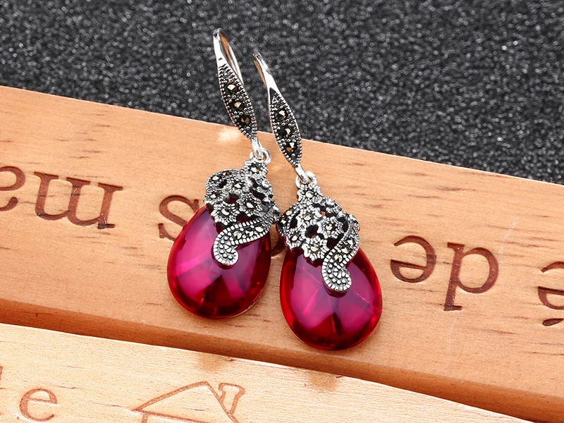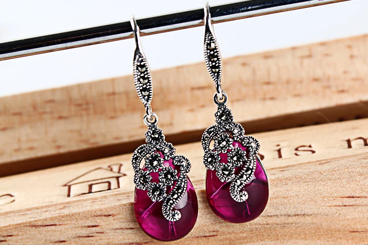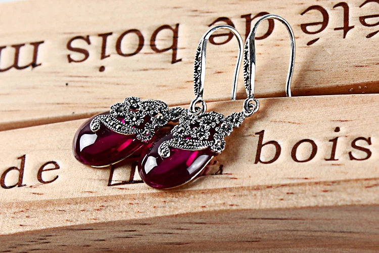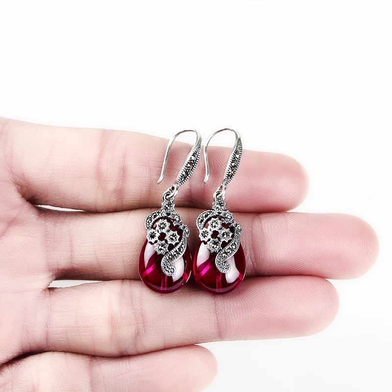fine jewelry 925 pure silver, Thai silver, retro Korean, simple temperament, ruby red corundum earrings, ladies' acces