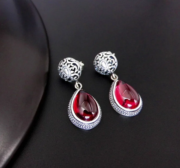 Fine jewelry 925 Sterling Silver Thai silver retro pattern drops corundum garnet earrings ladies earrings