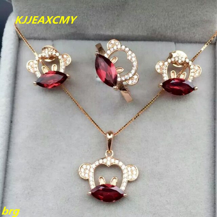 Fine jewelry, Natural Garnet Monkey Pendant in Sterling Silver and Pendant + Stud Earrings Set of 4 Recess Ring