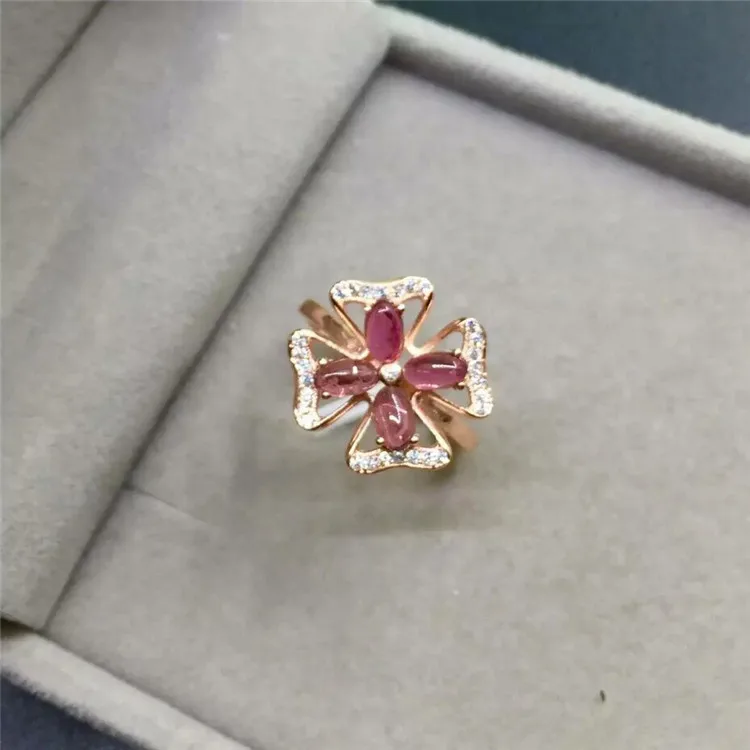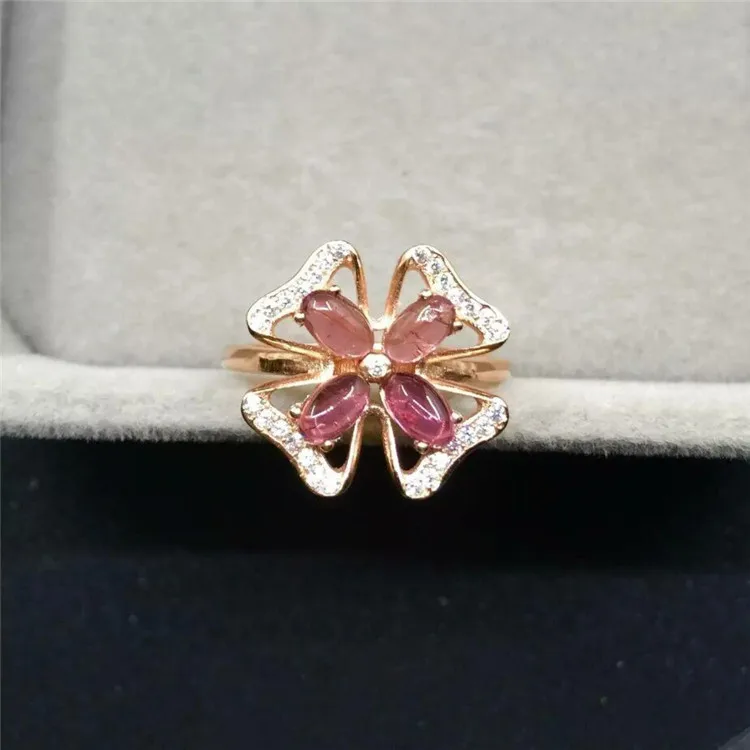 fine jewelry S925 silver inset natural tourmaline 4 petal 4 pieces of gem women's ring inlaid to order .