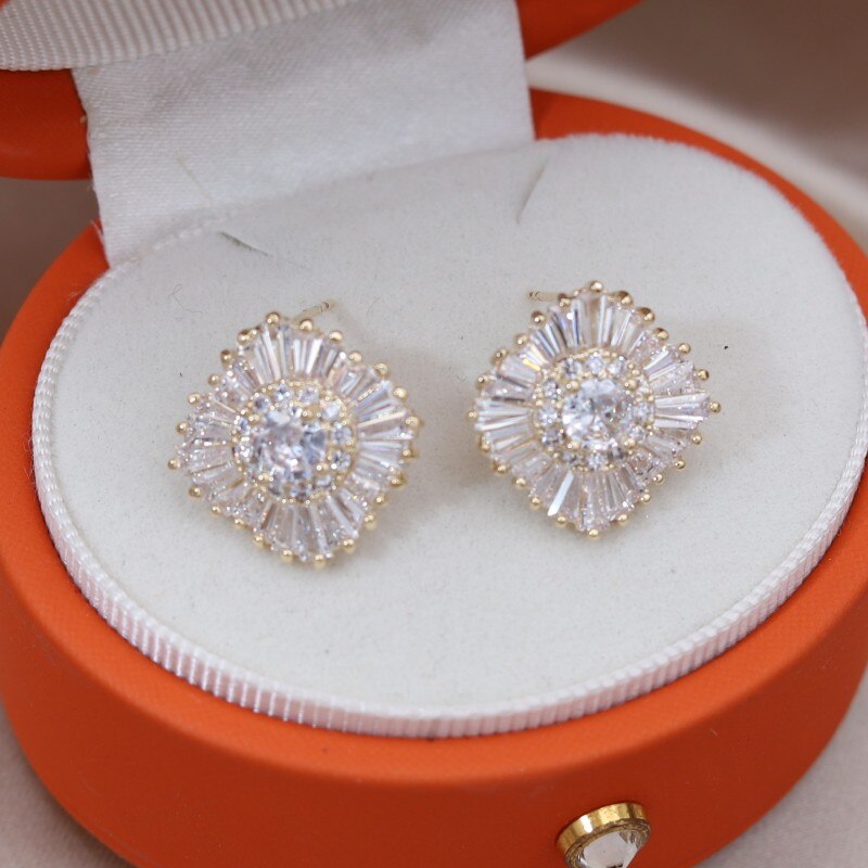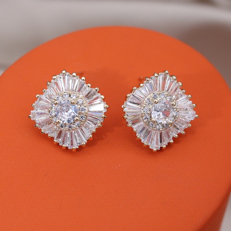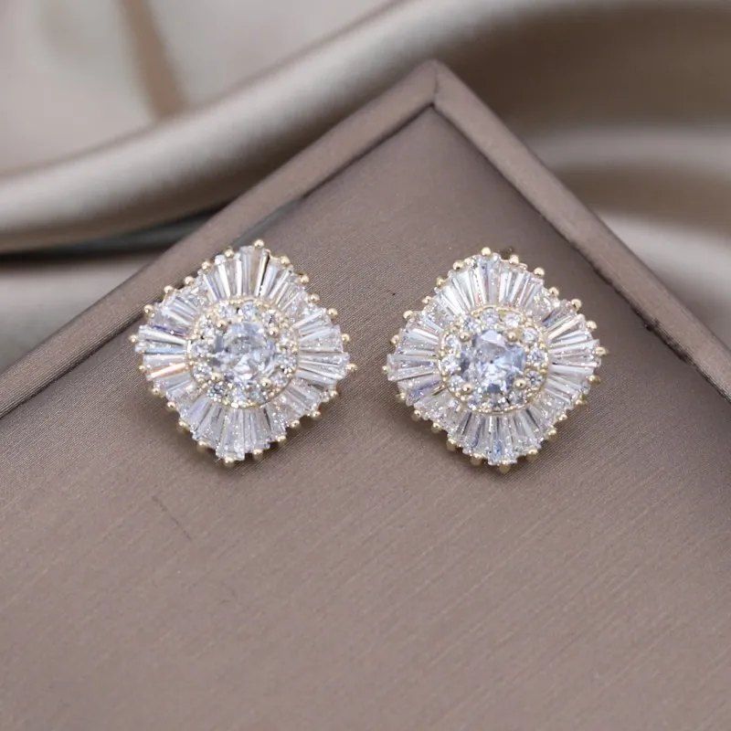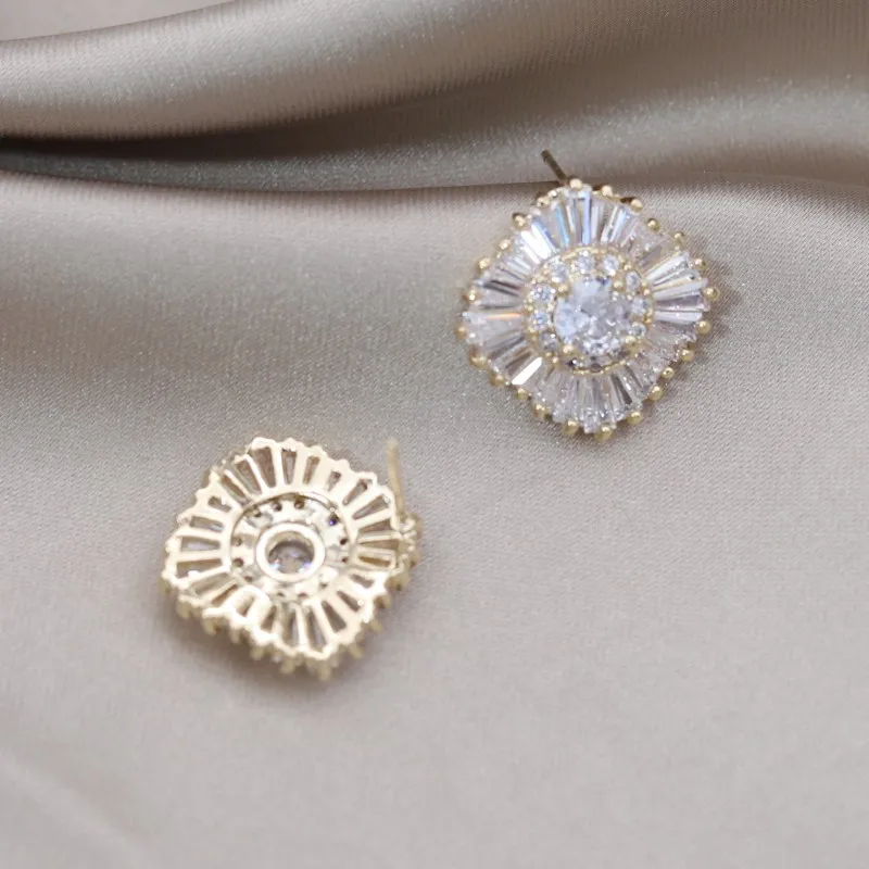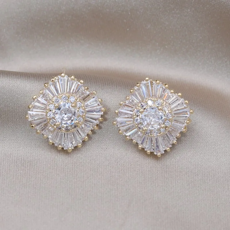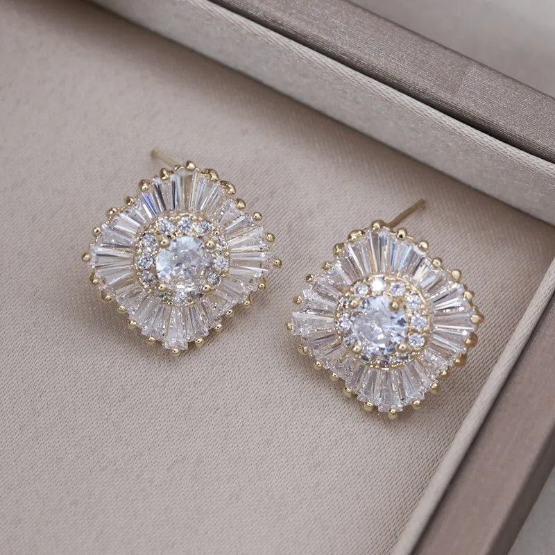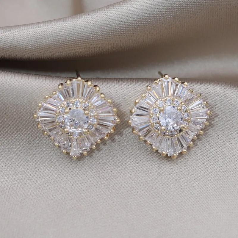 Korea Design Jewelry 14K Gold Plated Copper Set Zircon Square Earrings Elegant Women's Daily Work Accessories