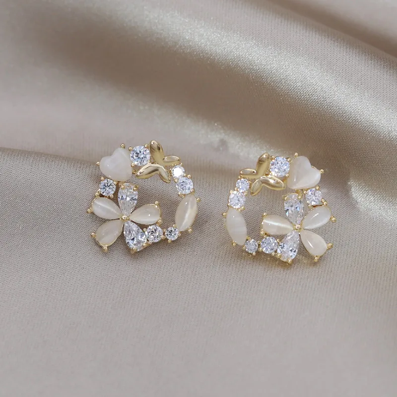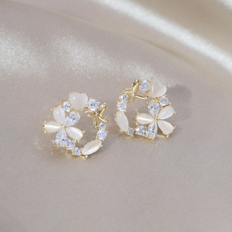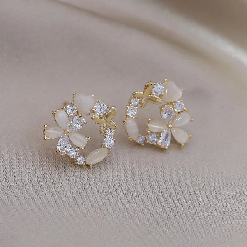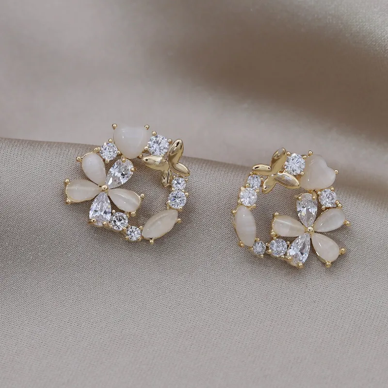 Korea Design Jewelry 14K Gold Plated Zircon Opal Flower Butterfly Earrings Elegant Women's Daily Work Accessories