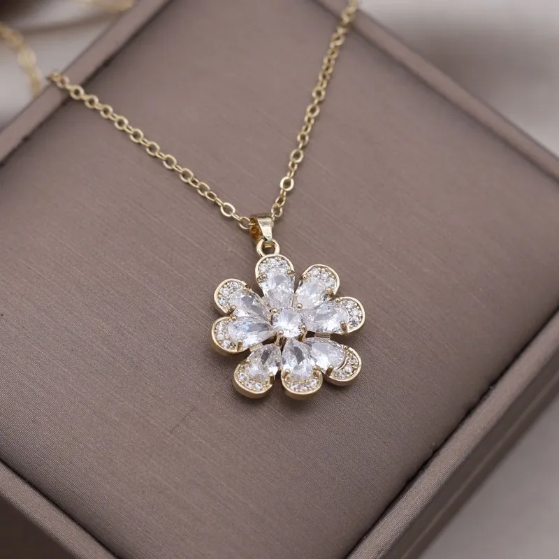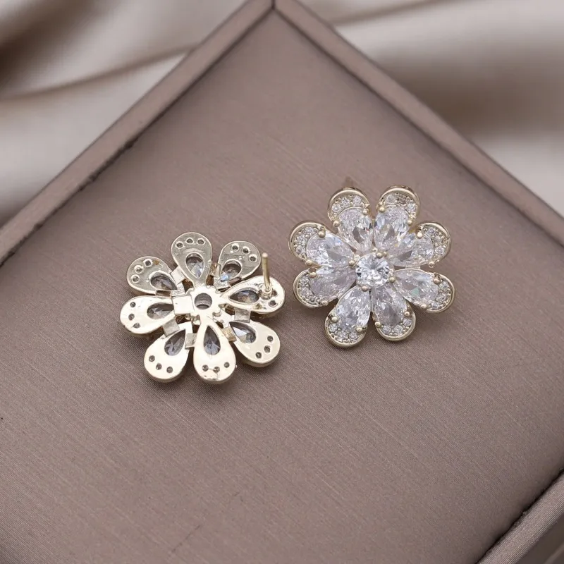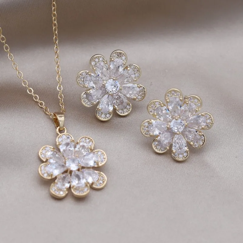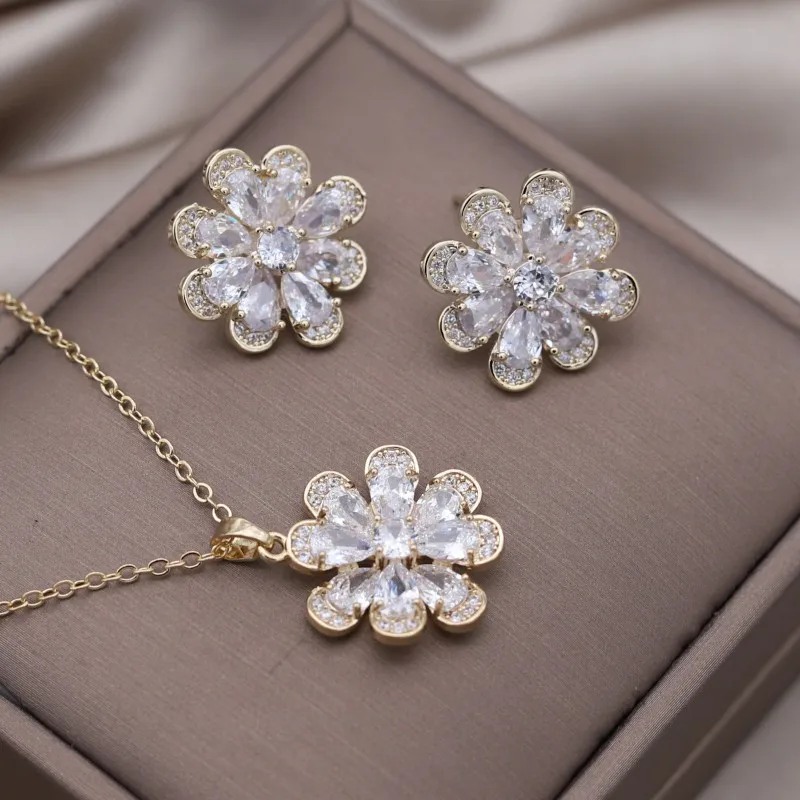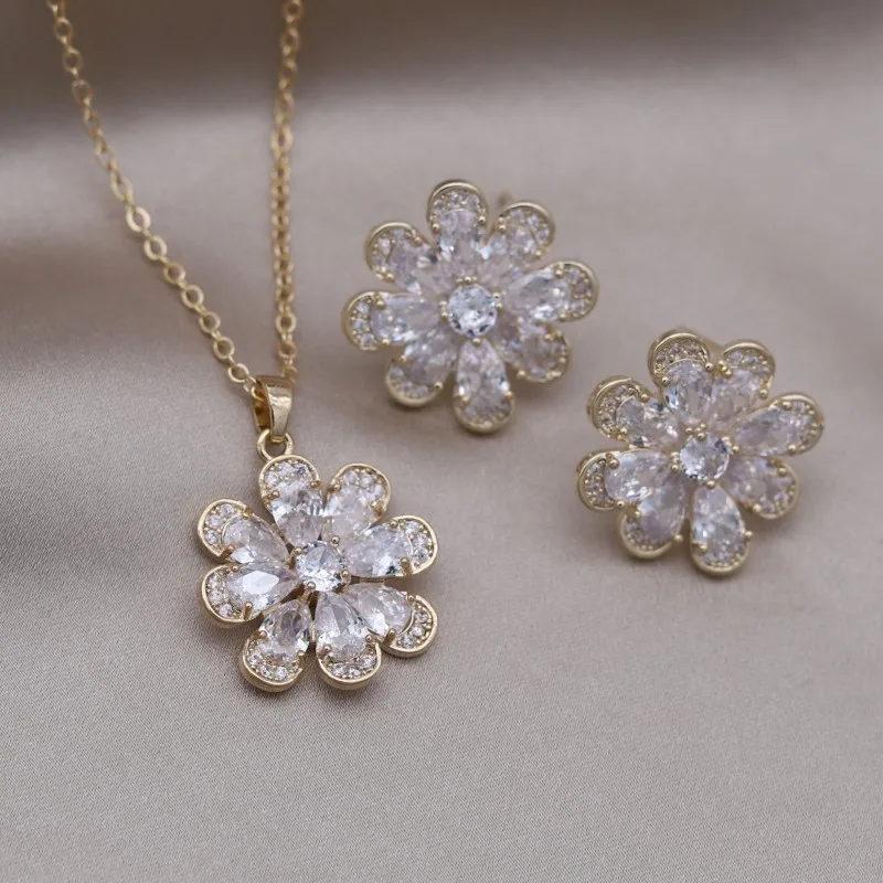 Korea Design Jewelry 14K Gold Plating Zircon Flower Earrings Necklace Elegant Women's Party Accessories