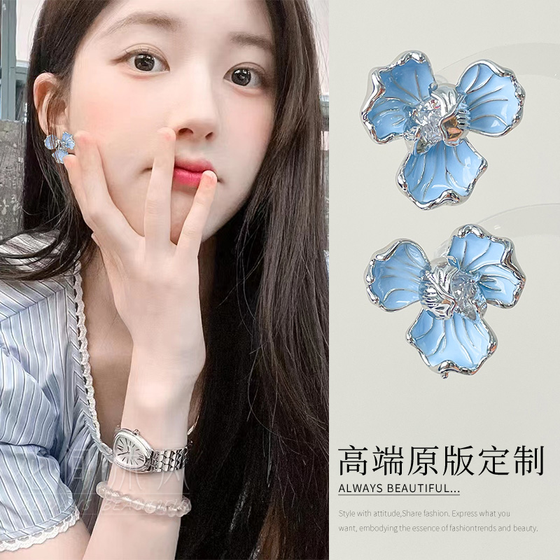 Korea Design Jewelry Blue Enamel Oil Drop Flower Zircon Earrings Elegant Women's Daily Work Accessories