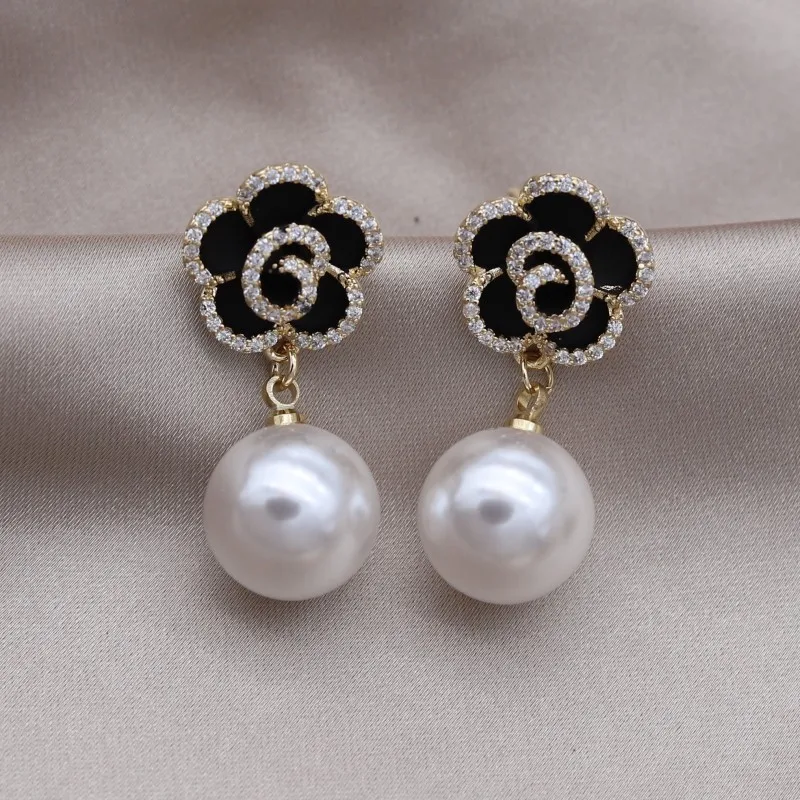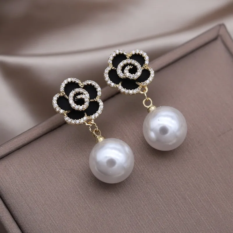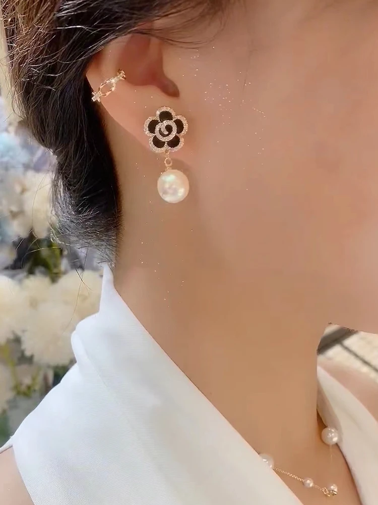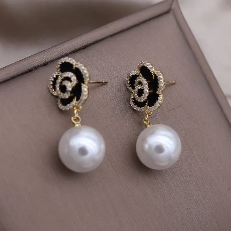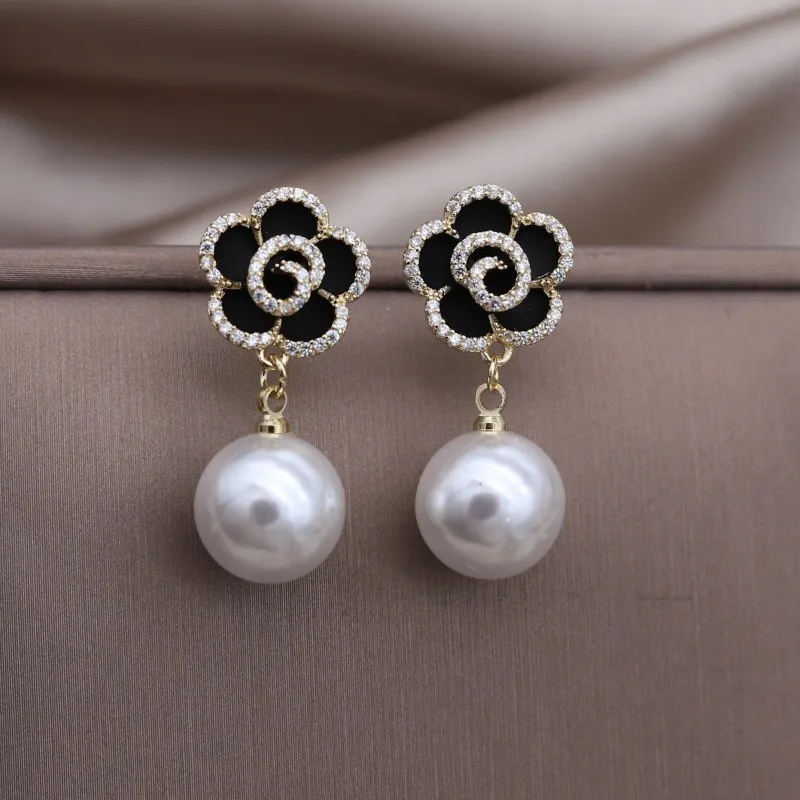 Korea Jewelry 14K Gold plated Zircon Black Camellia Pearl Pendant Earrings Elegant Women's Daily Accessories