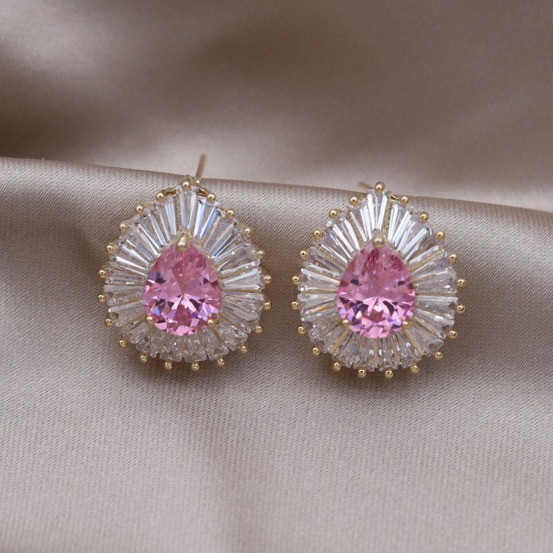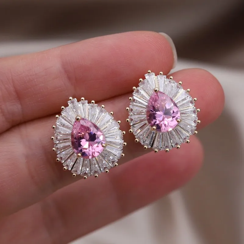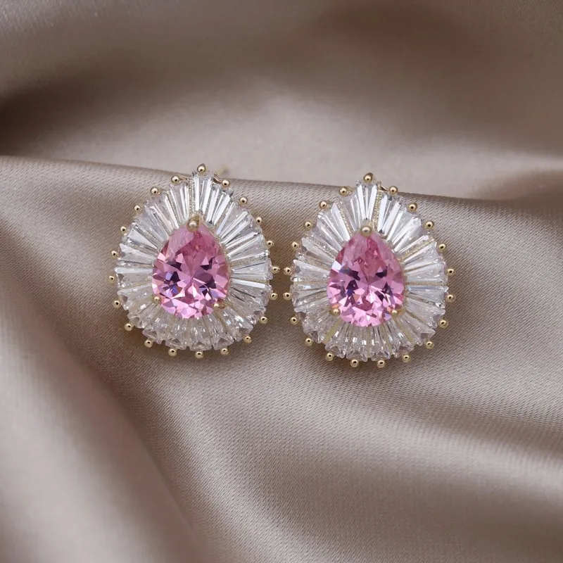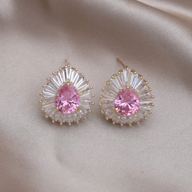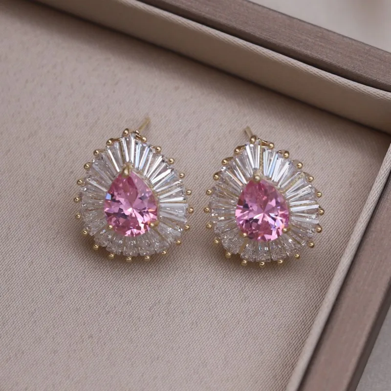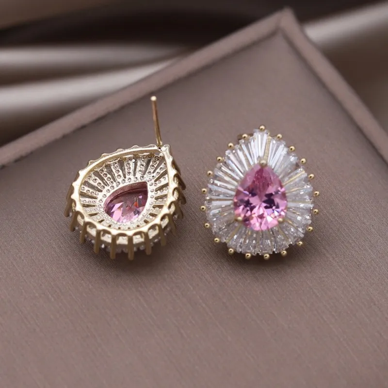 Korean Design Jewelry 14K Gold plated Copper Set Pink Zircon Water Drop Earrings Women's Evening Accessories