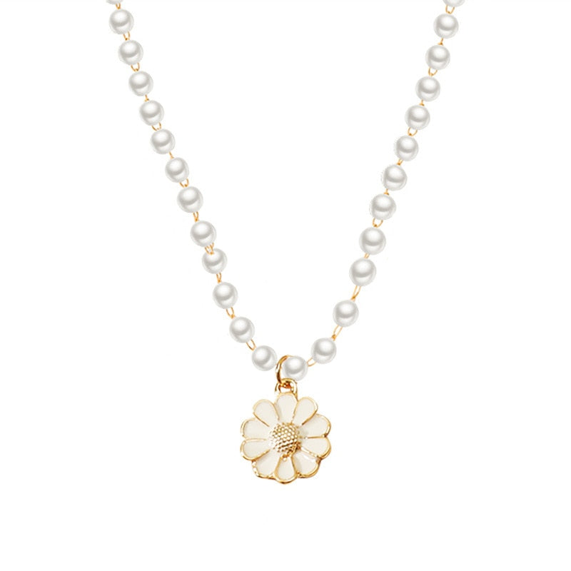 Korean Elegant Small Daisy Flower Pendant Necklace for Women Bohemian White Imitation Pearl Sunflower Choker Necklaces Jewelry