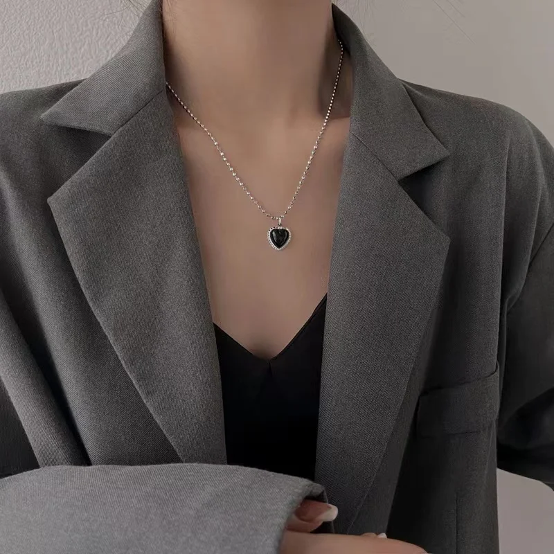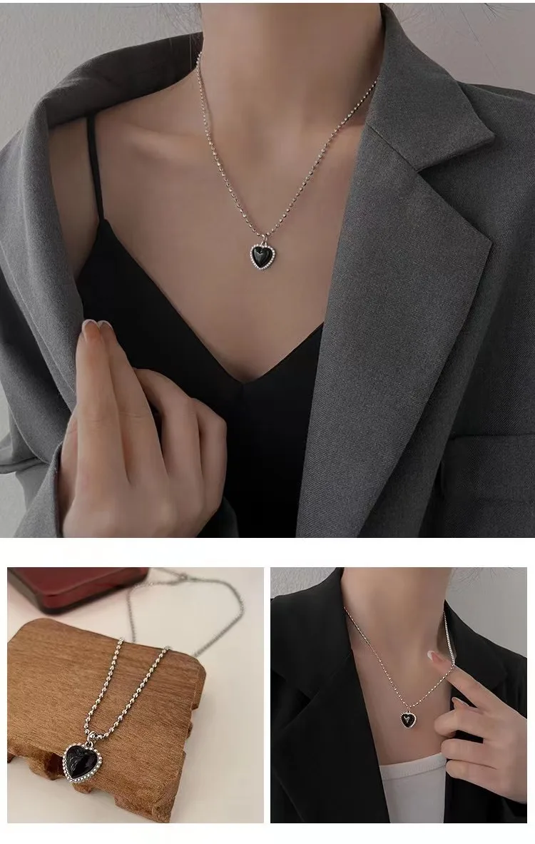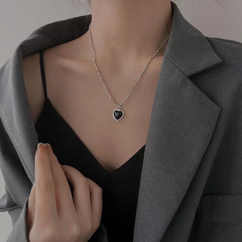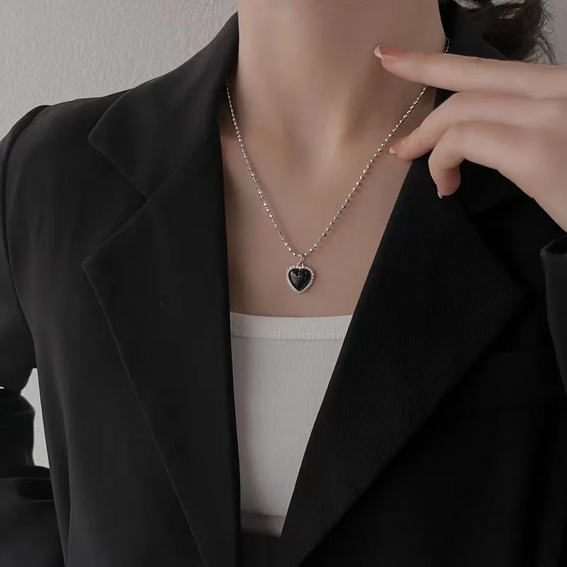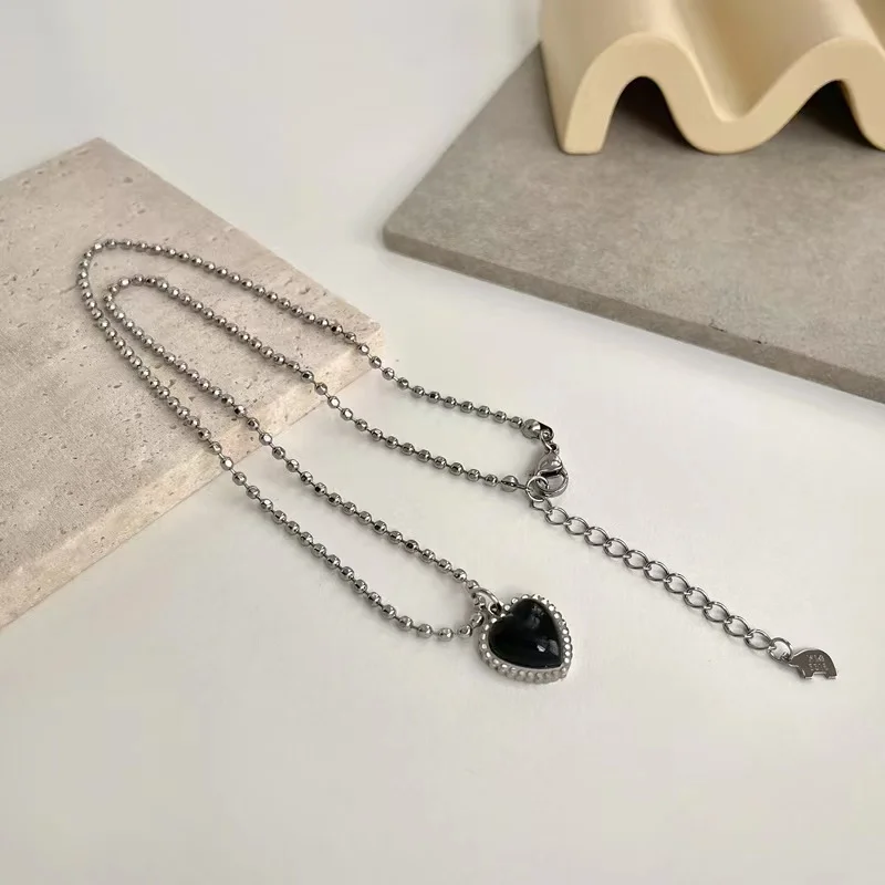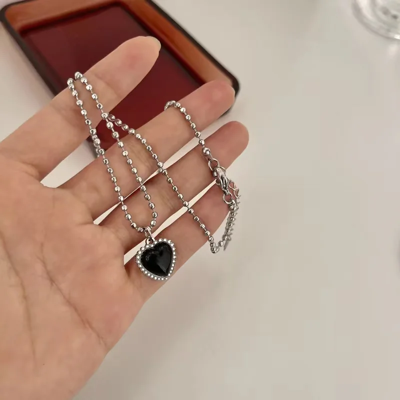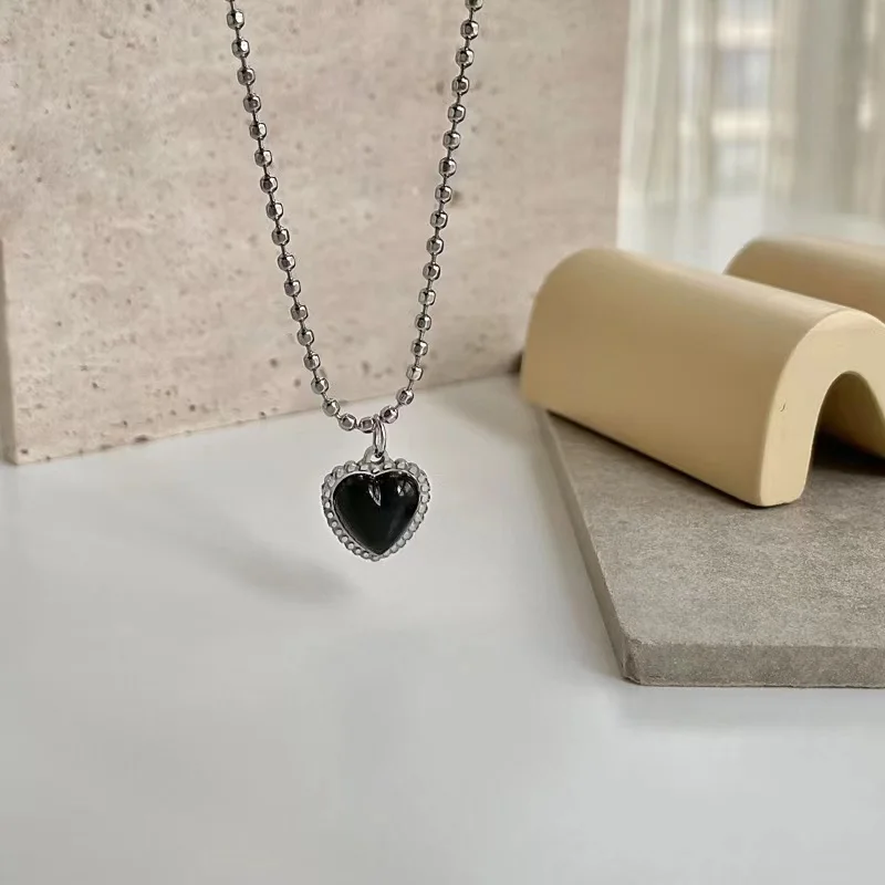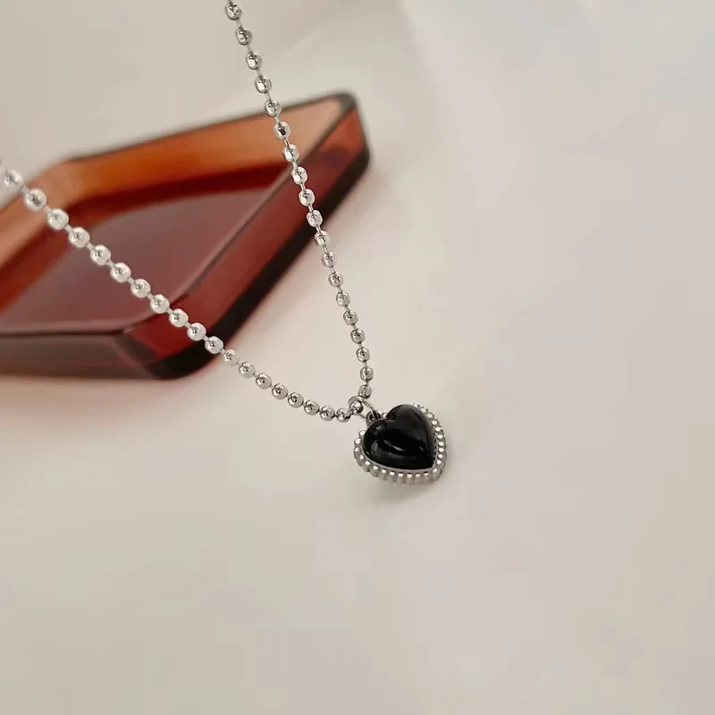 Korean Style Stainless Steel Black Peach Heart Pendant Necklace For Women Girls Silver Color Goth Jewelry On The Neck